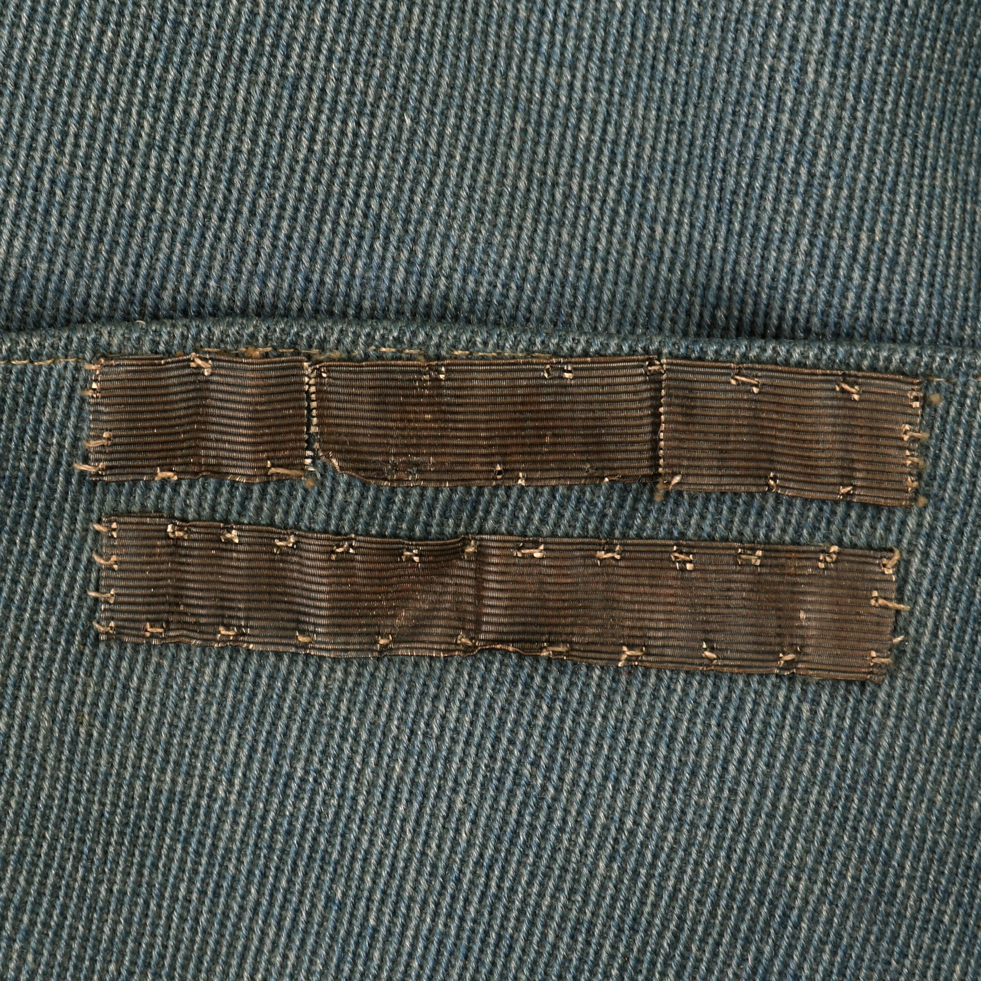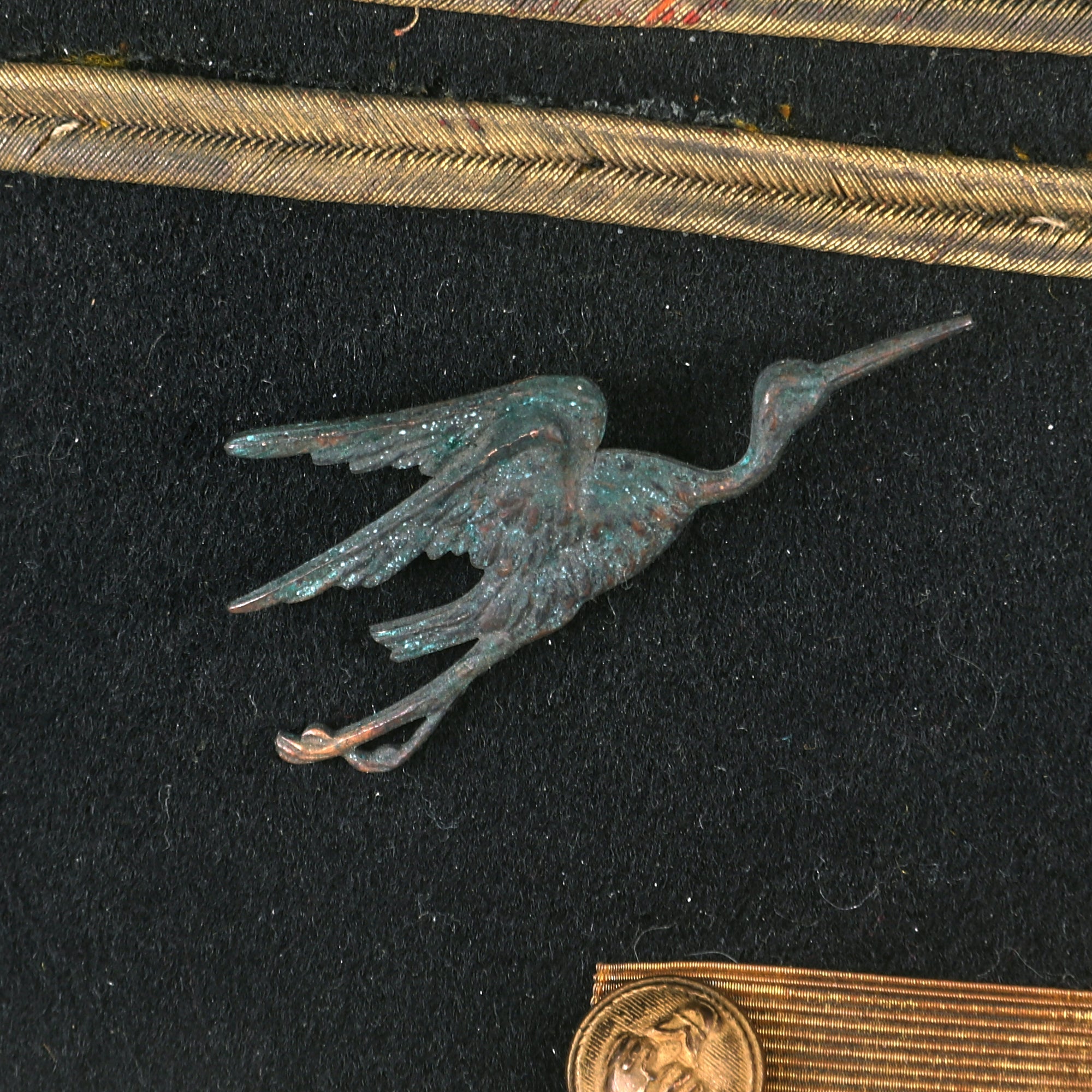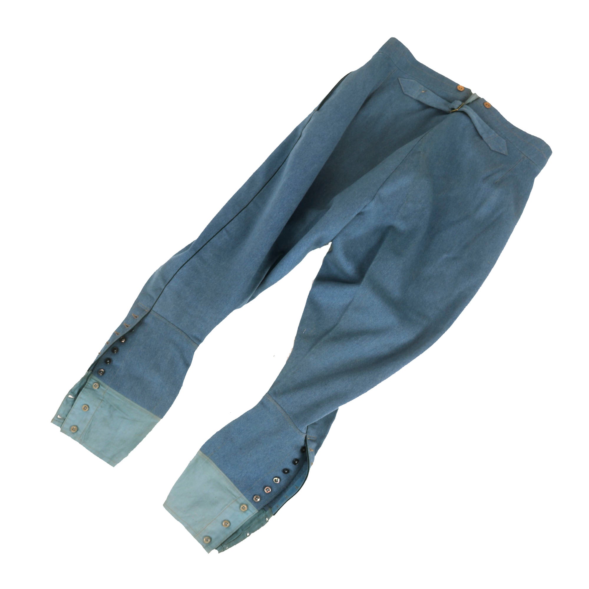 This example kepi is high quality and most likely a private purchase. It was issued to an officer with a bullion cross design to the crown. Interior has a leather sweatband with a black polished cotton lining. The right side of the kepi actually has an insignia identifying which squadron, a rarity in itself. The Stork insignia was adorned on the aircraft and clothing for members of Escadrille 3. The included trousers are in wonderful condition with minor moth nips present and no extensive damage.