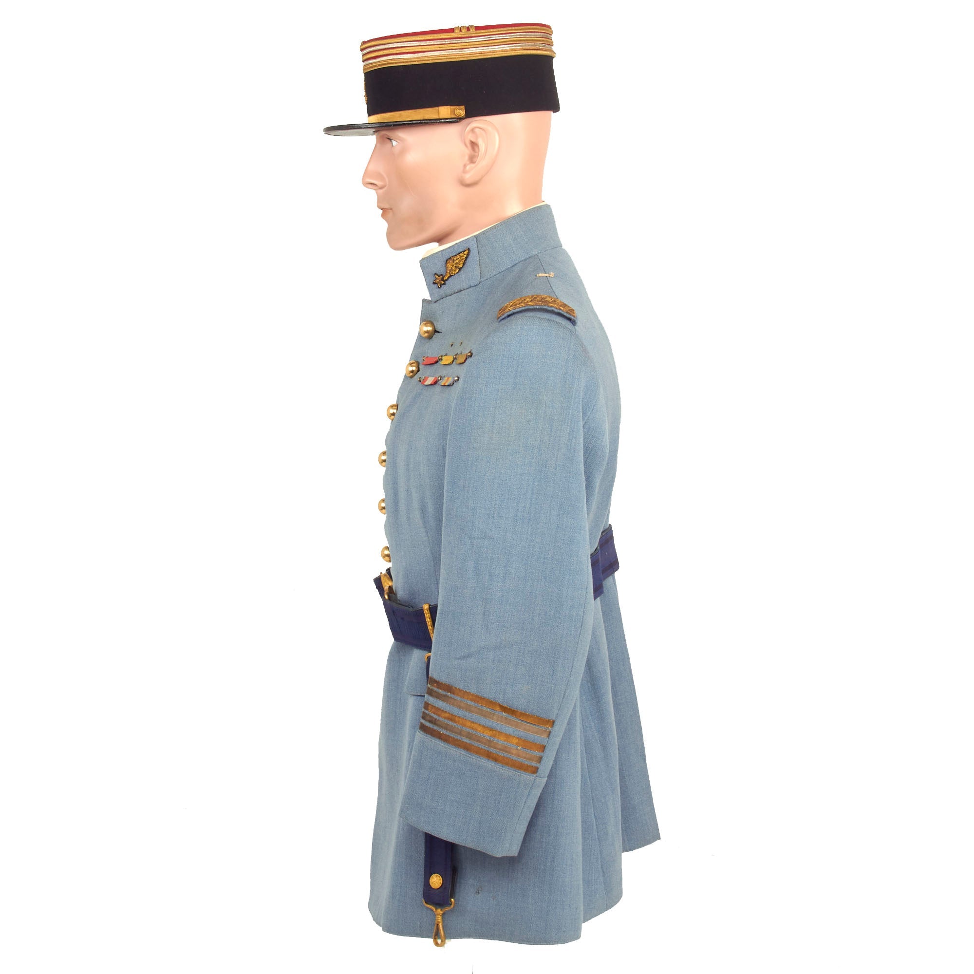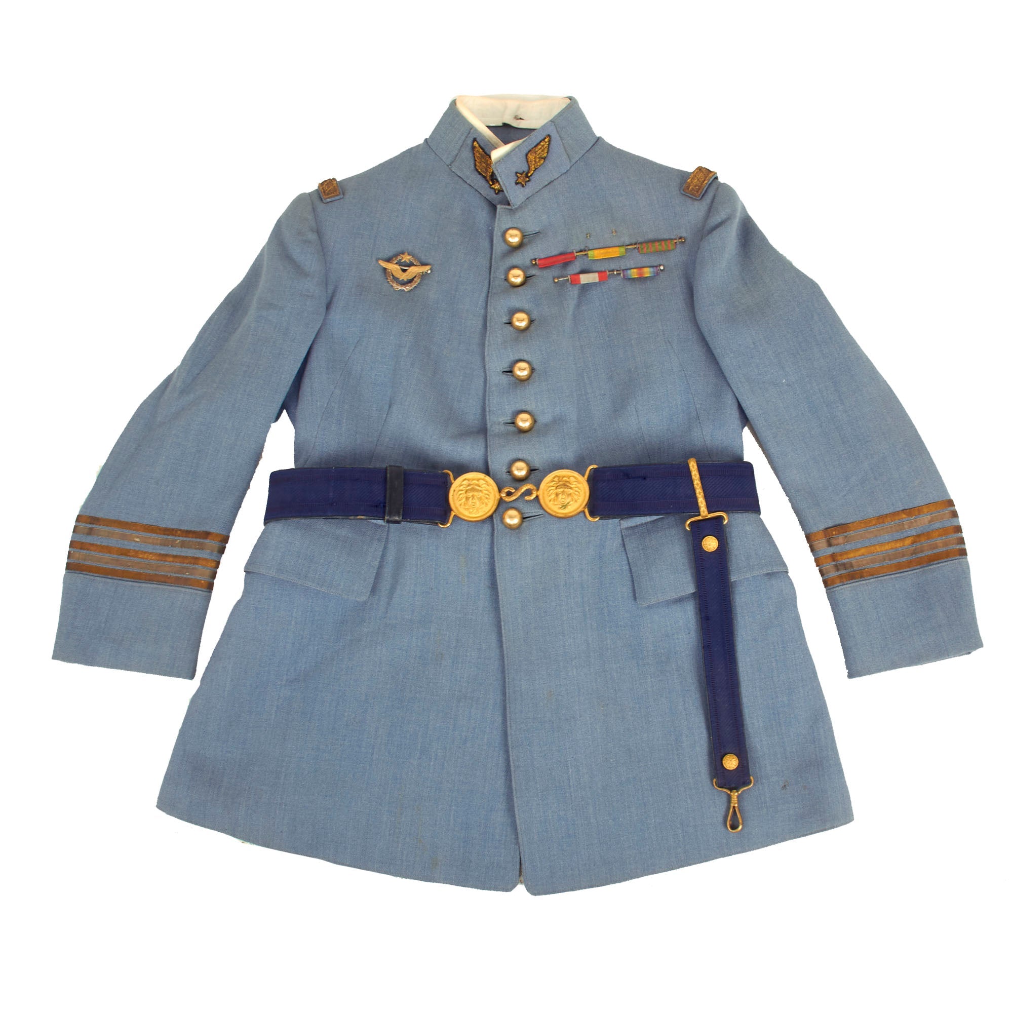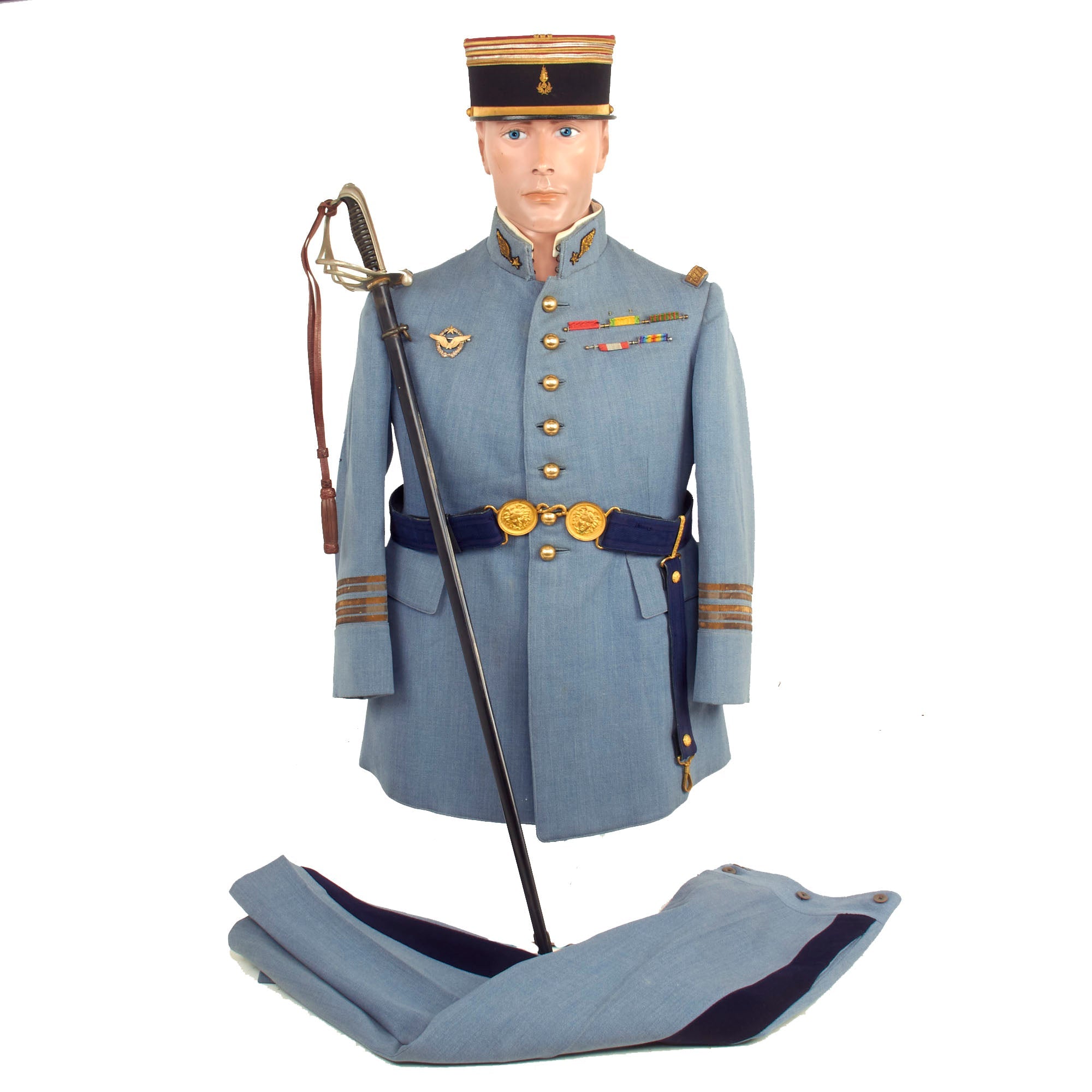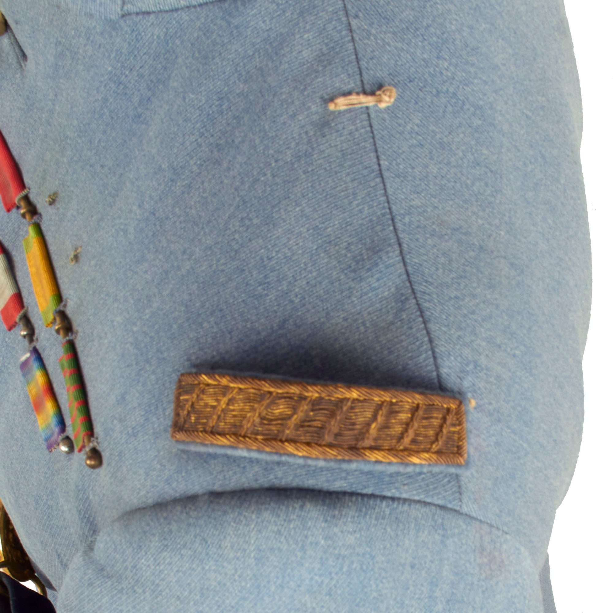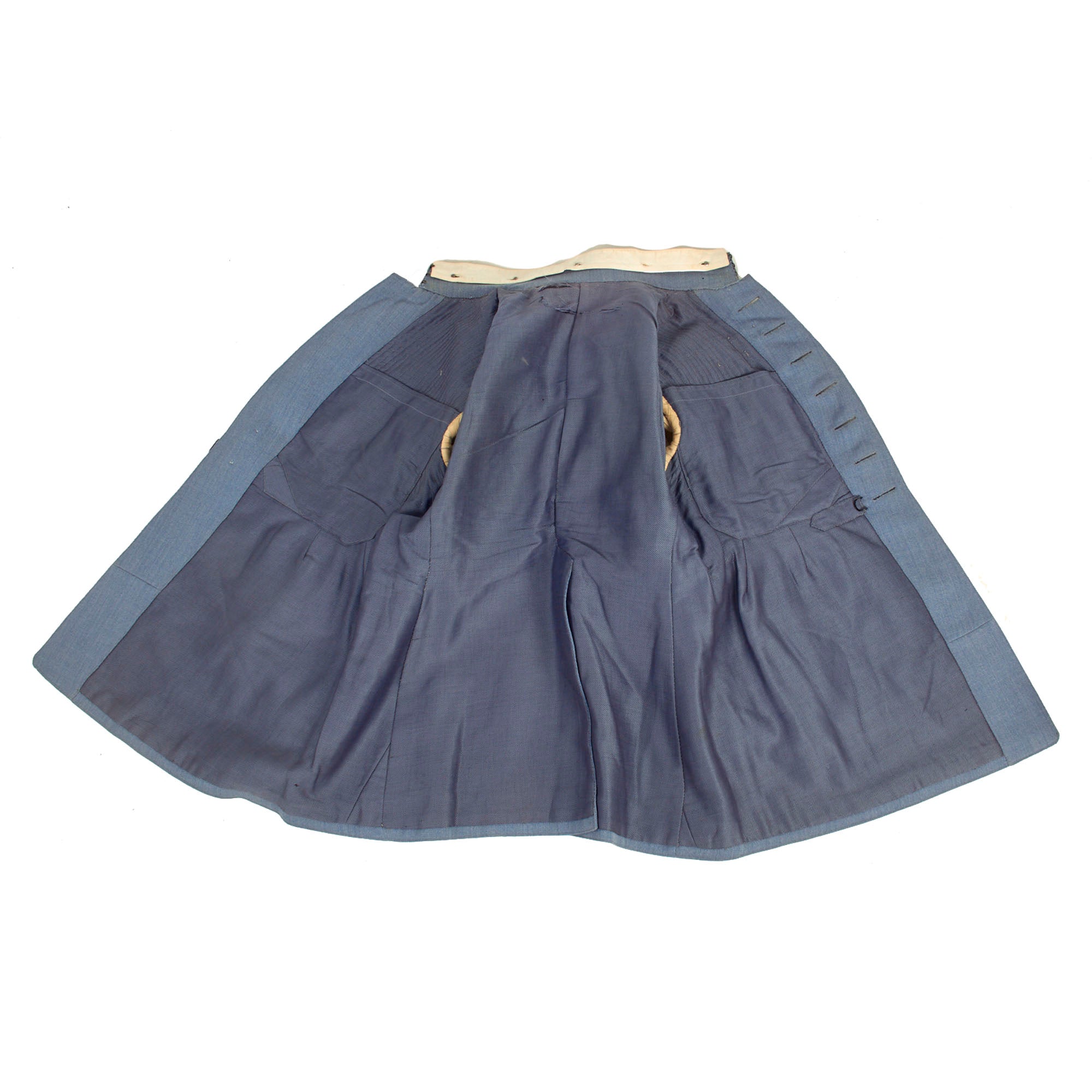 Now this is an absolutely stunning uniform set. This was the standard issue for a WWI French Pilot. Horizon blue French Air Service service coat, single breasted with all 8 brass buttons down front. The collar tabs feature beautiful gold bullion “winged star” insignia with the color retained very well. The right side of the uniform features a lovely “B” hallmarked Pilot’s Wings Badge with the colors retained very well. The badge was issued in the final years of the war, while the “B” hallmarked badges were used up into 1925. These badges in their own standpoint are very rare. The belt featured on the tunic is in wonderful condition and rests on the integrated belt hooks on the tunic quite nicely.