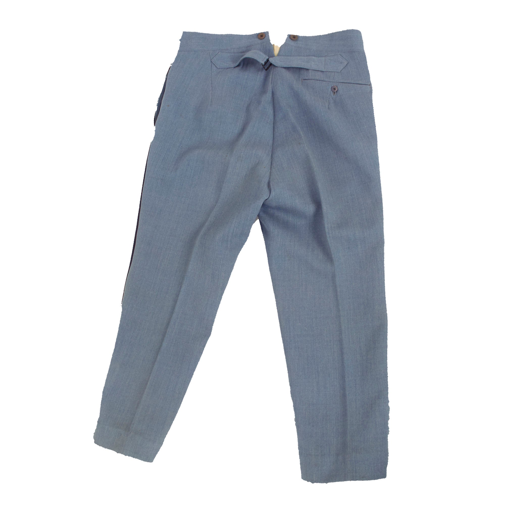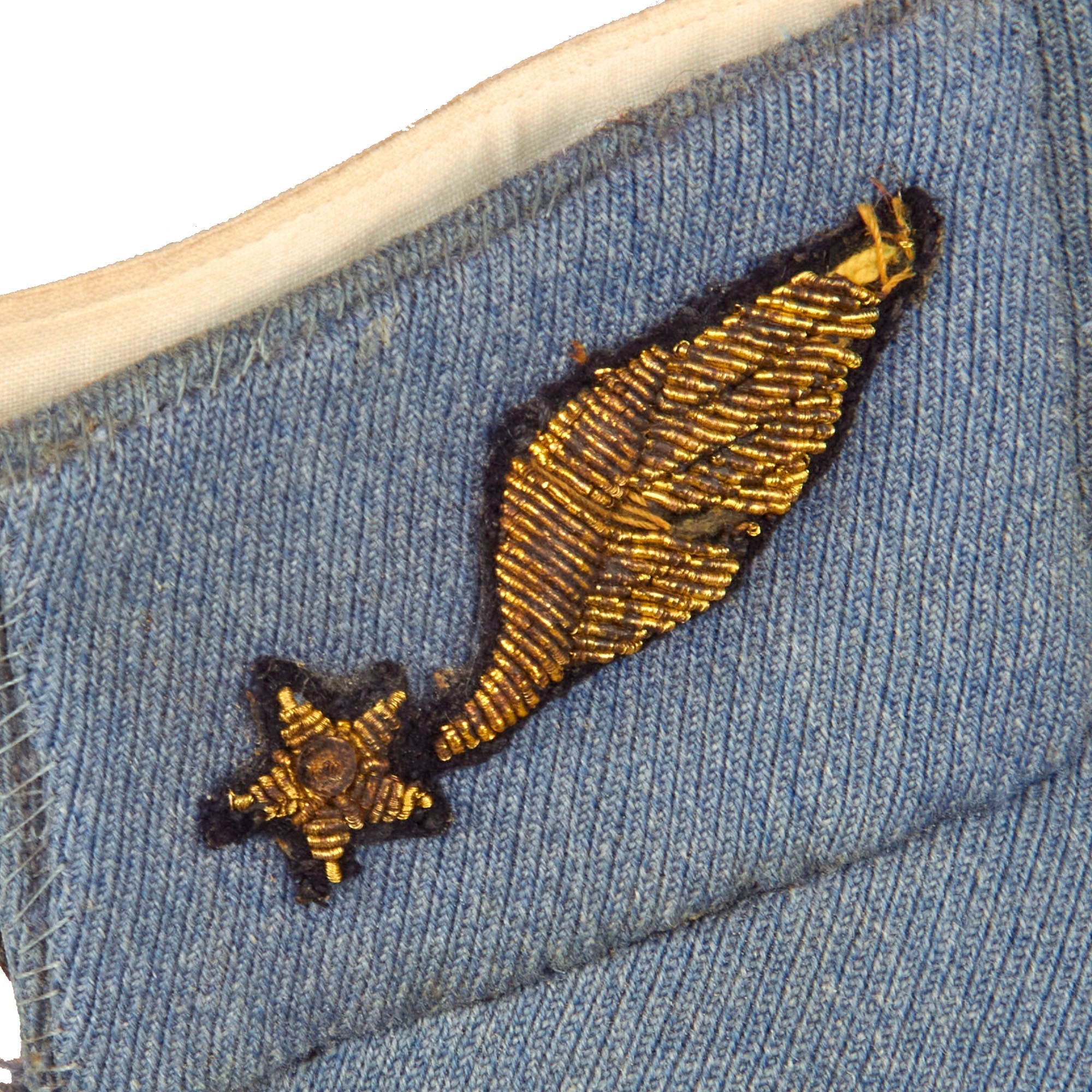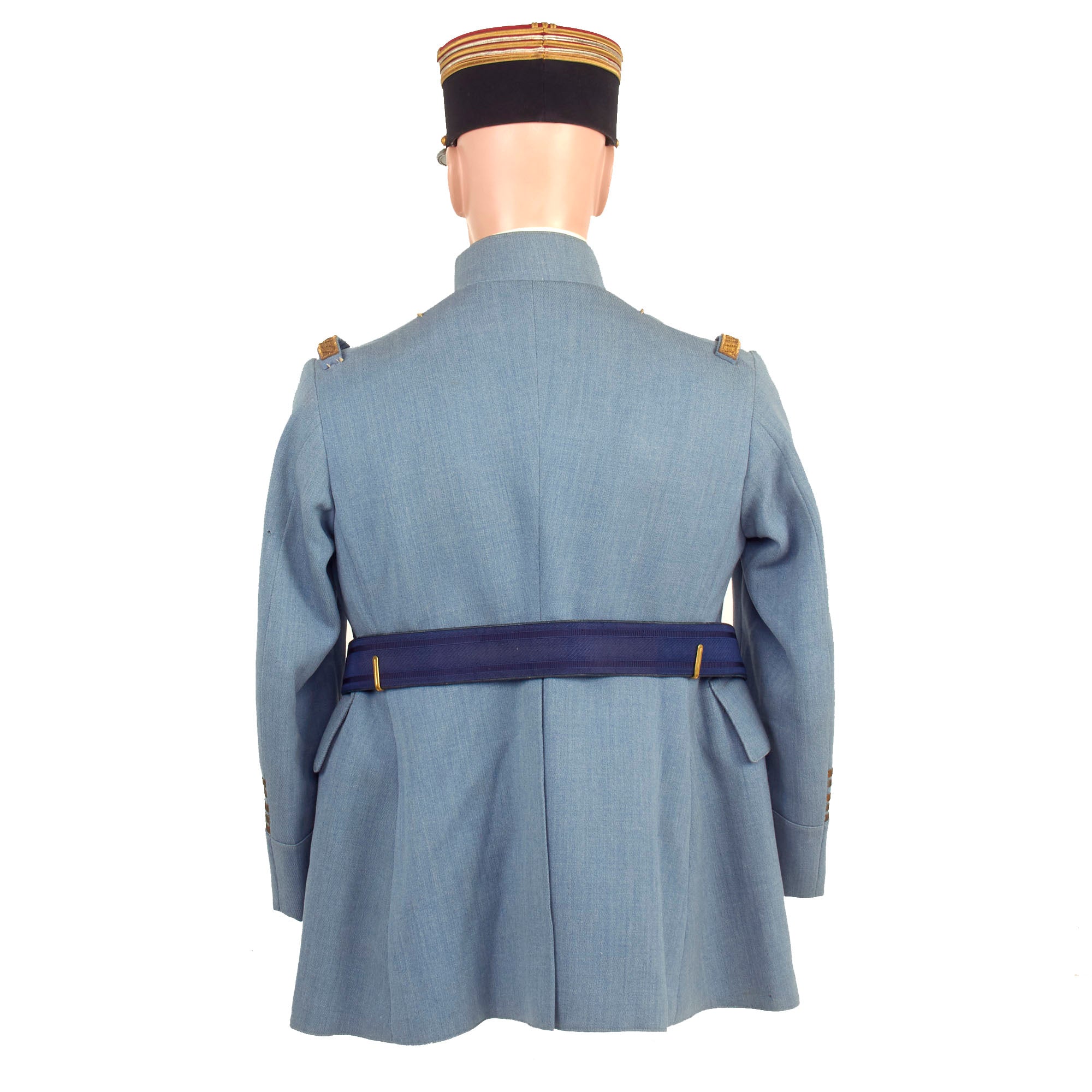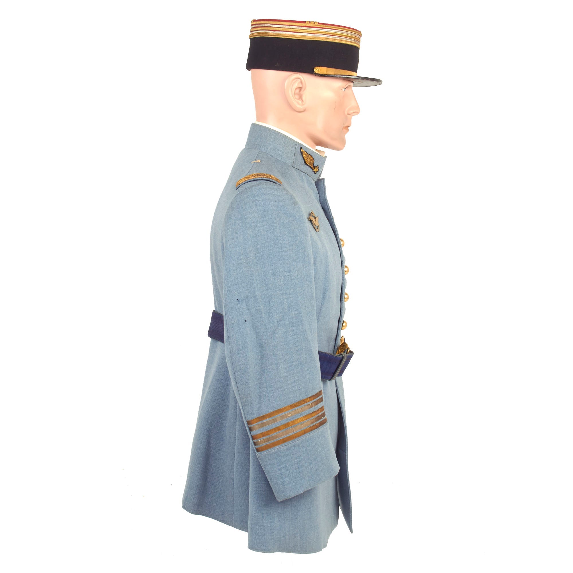 Now this is an absolutely stunning uniform set. This was the standard issue for a WWI French Pilot. Horizon blue French Air Service service coat, single breasted with all 8 brass buttons down front. The collar tabs feature beautiful gold bullion “winged star” insignia with the color retained very well. The right side of the uniform features a lovely “B” hallmarked Pilot’s Wings Badge with the colors retained very well. The badge was issued in the final years of the war, while the “B” hallmarked badges were used up into 1925. These badges in their own standpoint are very rare. The belt featured on the tunic is in wonderful condition and rests on the integrated belt hooks on the tunic quite nicely.