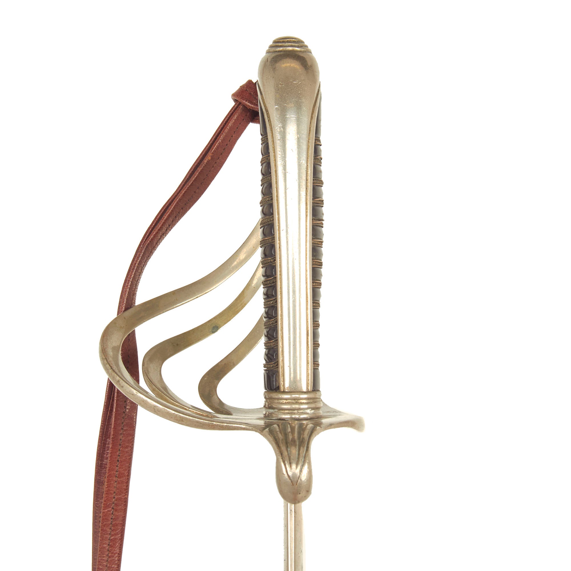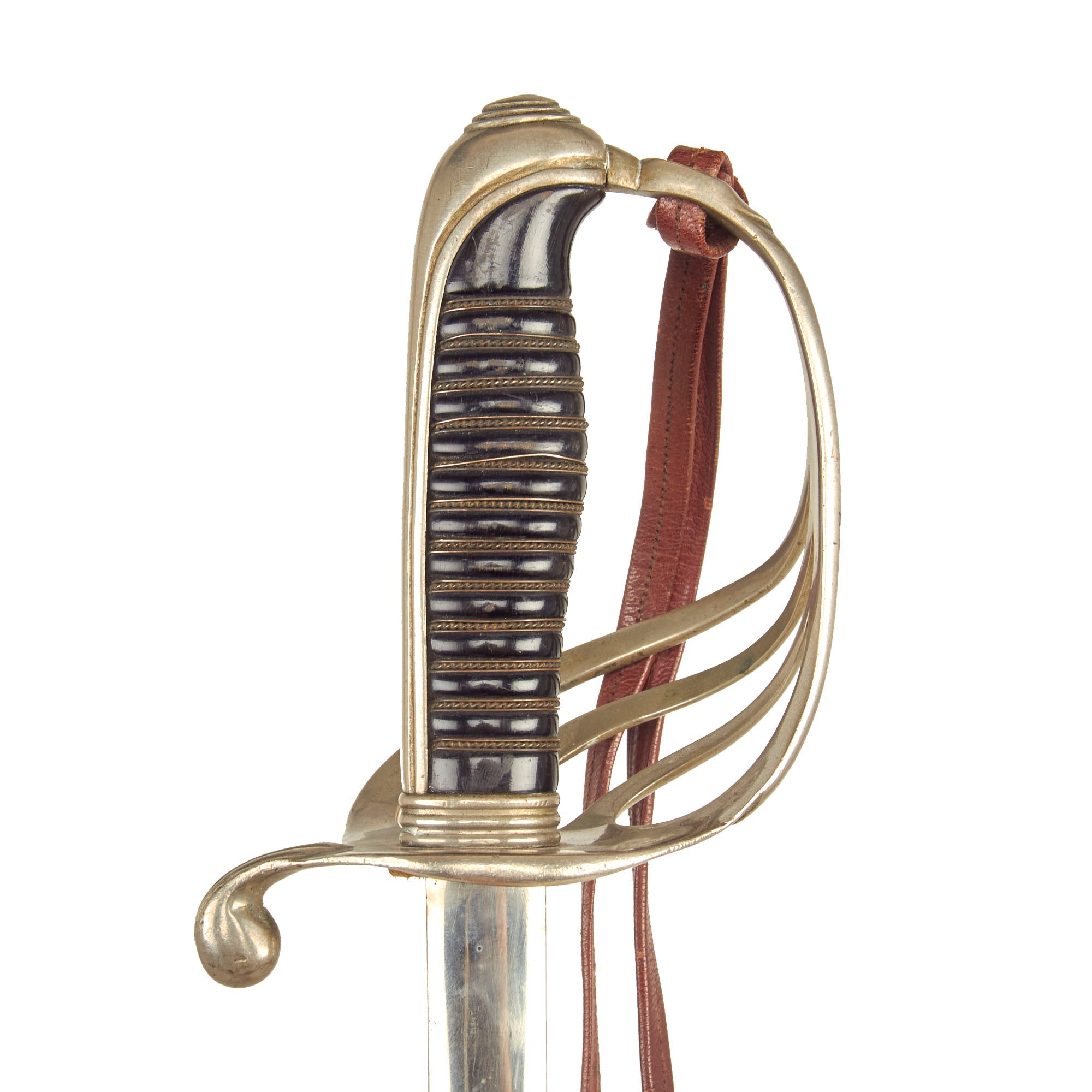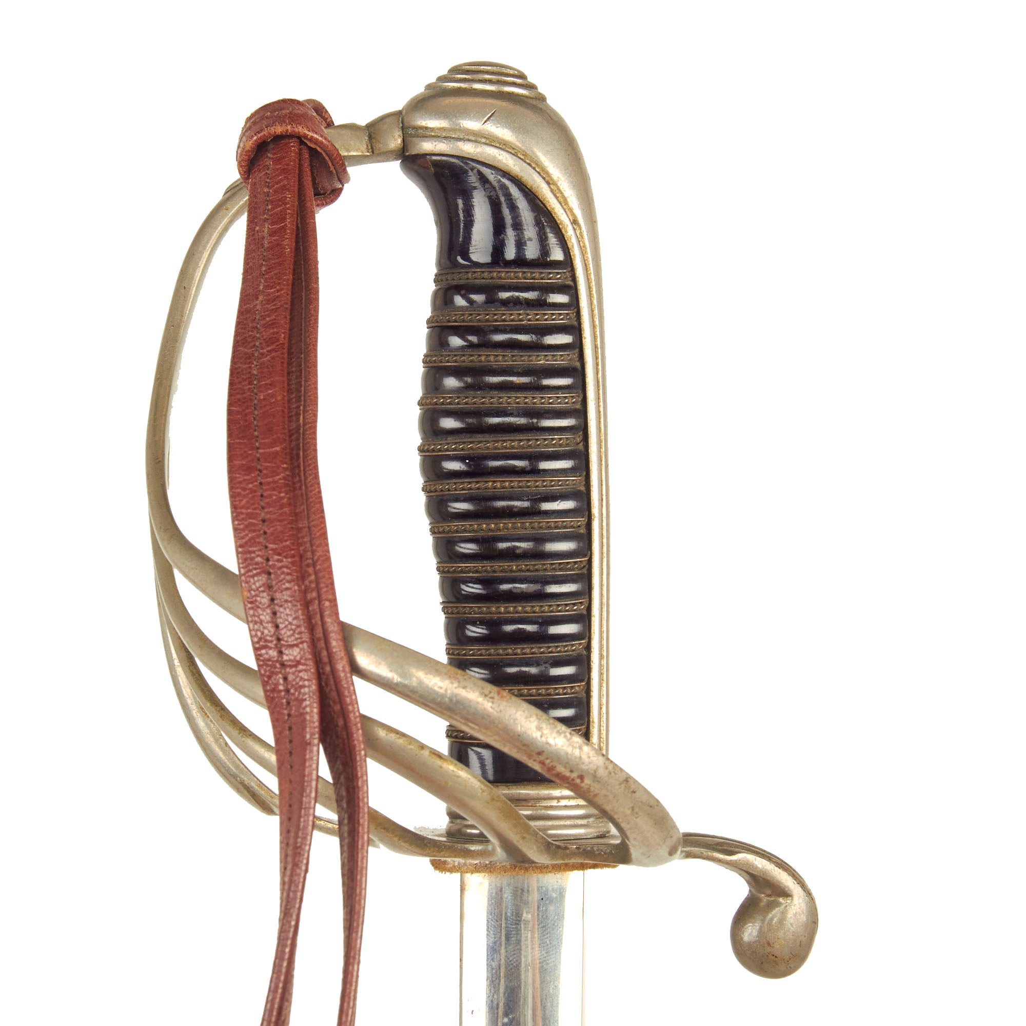 This is the infantry sword model that superseded the 1845/55 model and comprises a nickel-plated, four-bar hilt with a horn and silver twist wire wrapped grip. Hilt retains a rarely encountered black leather sword knot. Complete with the original black painted scabbard.