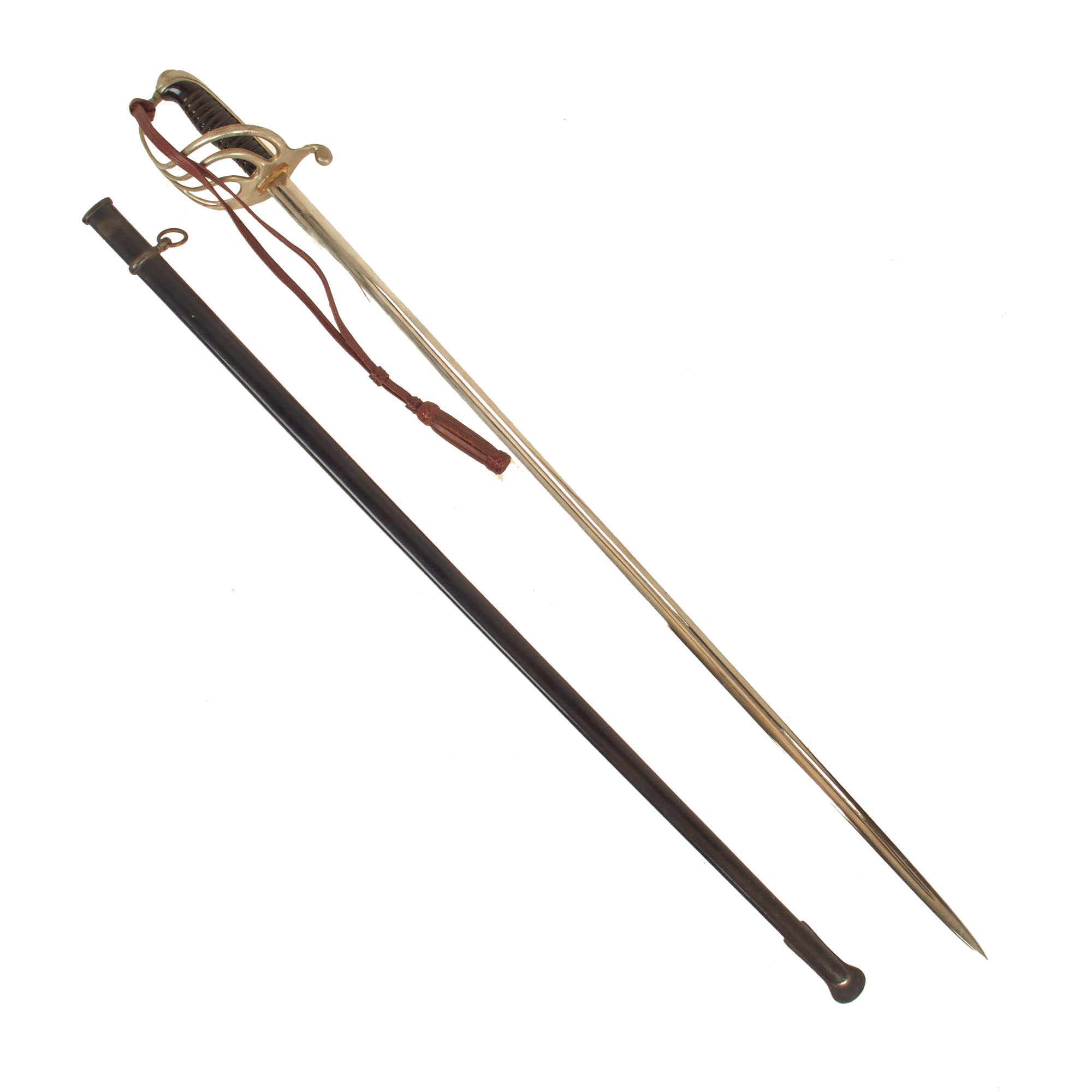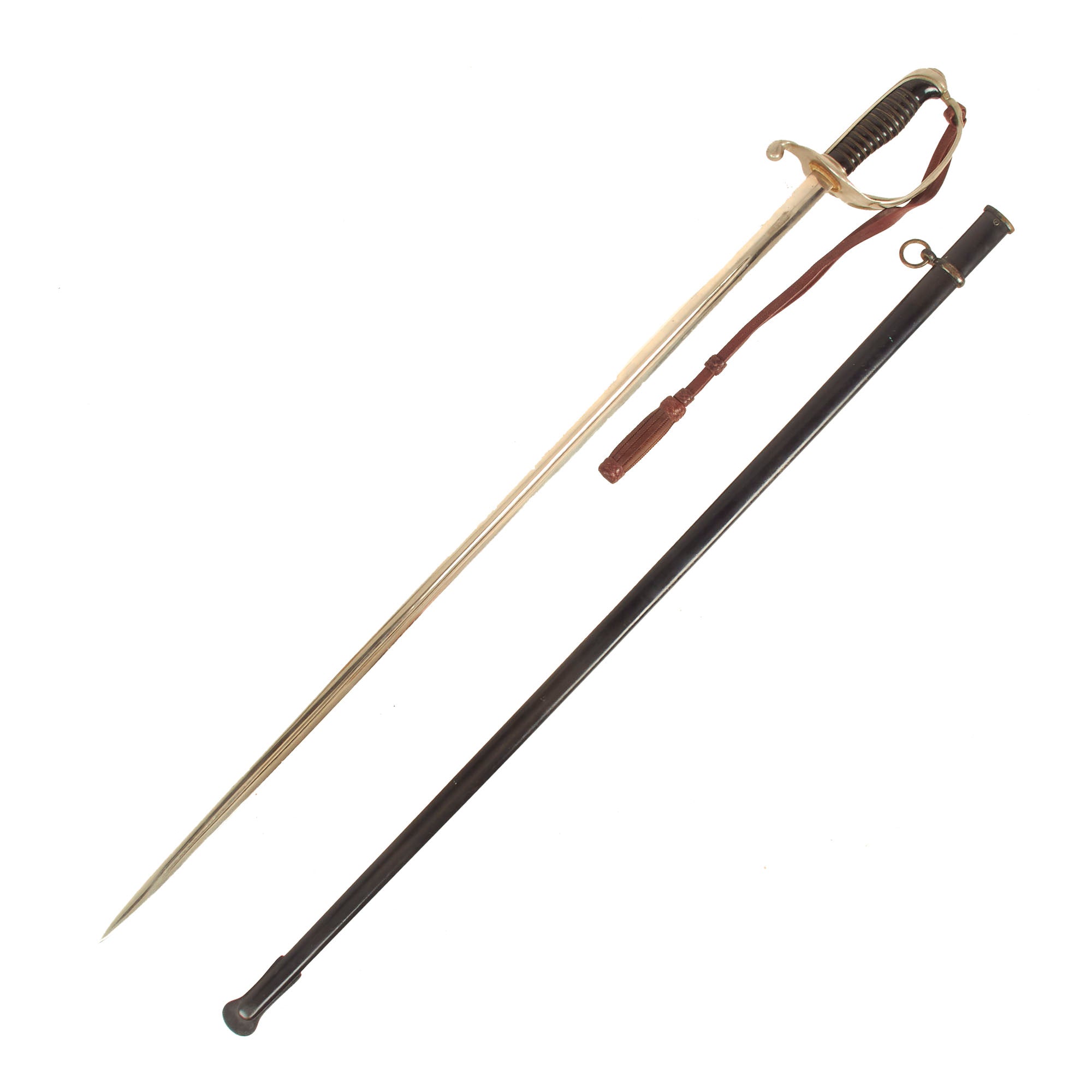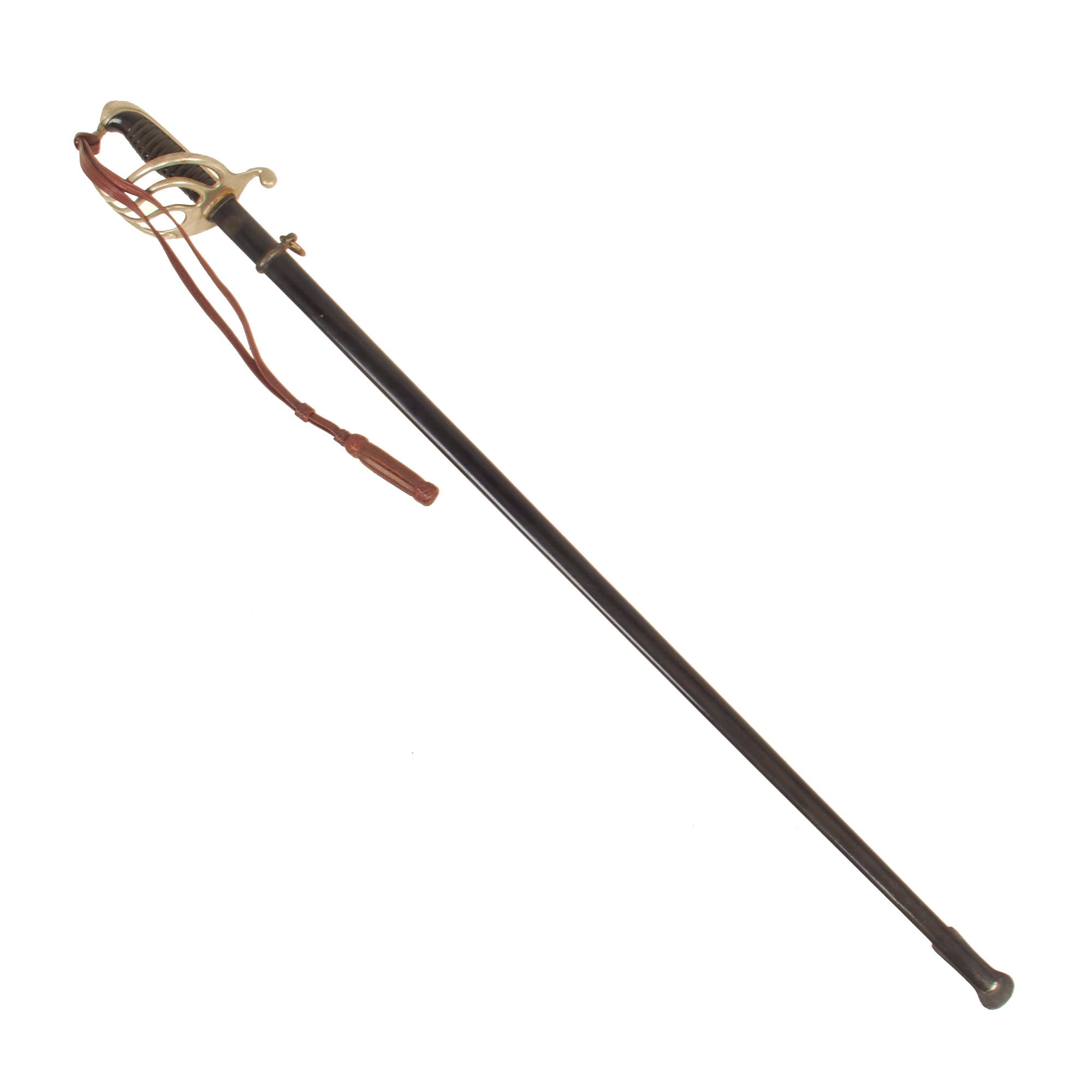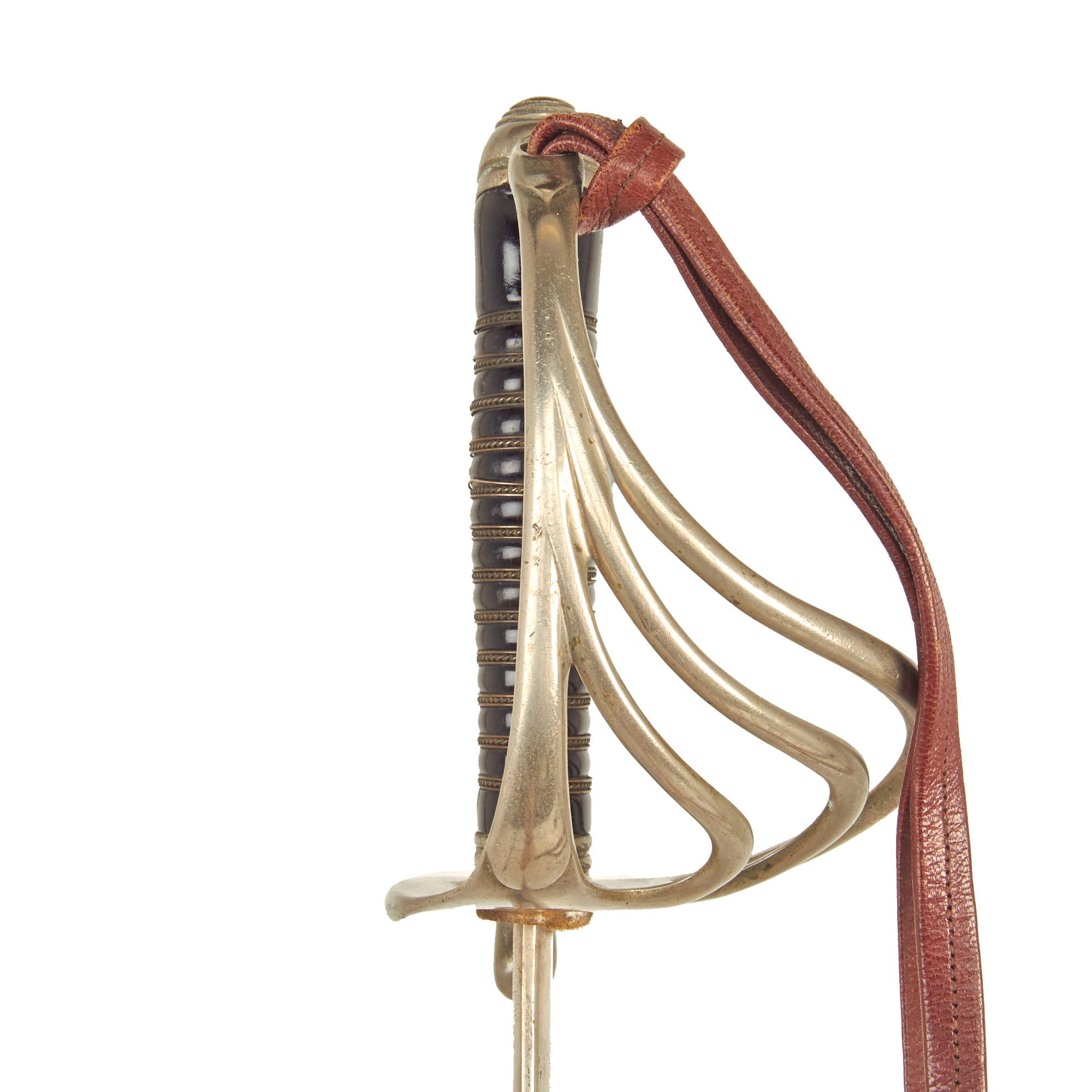 This is the infantry sword model that superseded the 1845/55 model and comprises a nickel-plated, four-bar hilt with a horn and silver twist wire wrapped grip. Hilt retains a rarely encountered black leather sword knot. Complete with the original black painted scabbard.