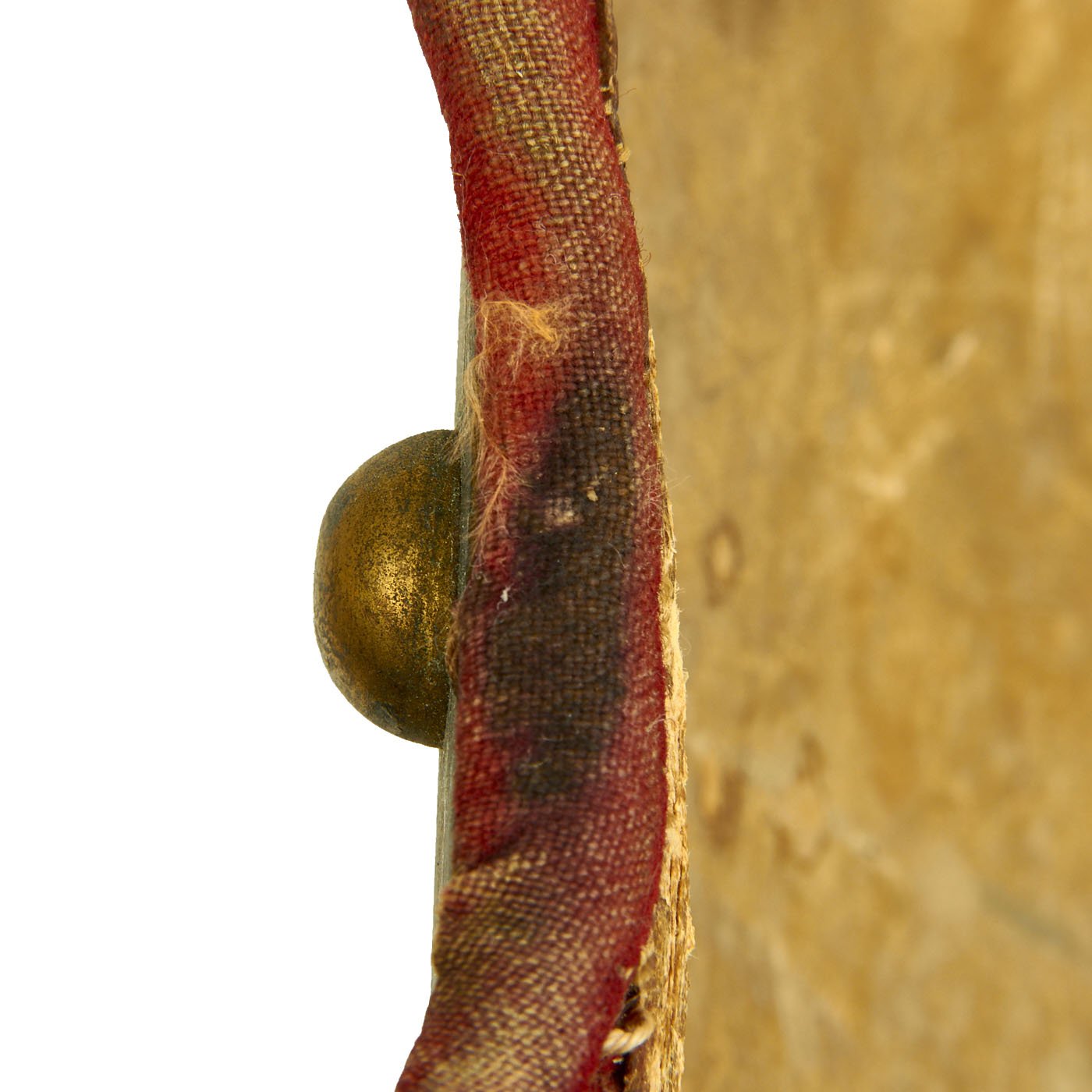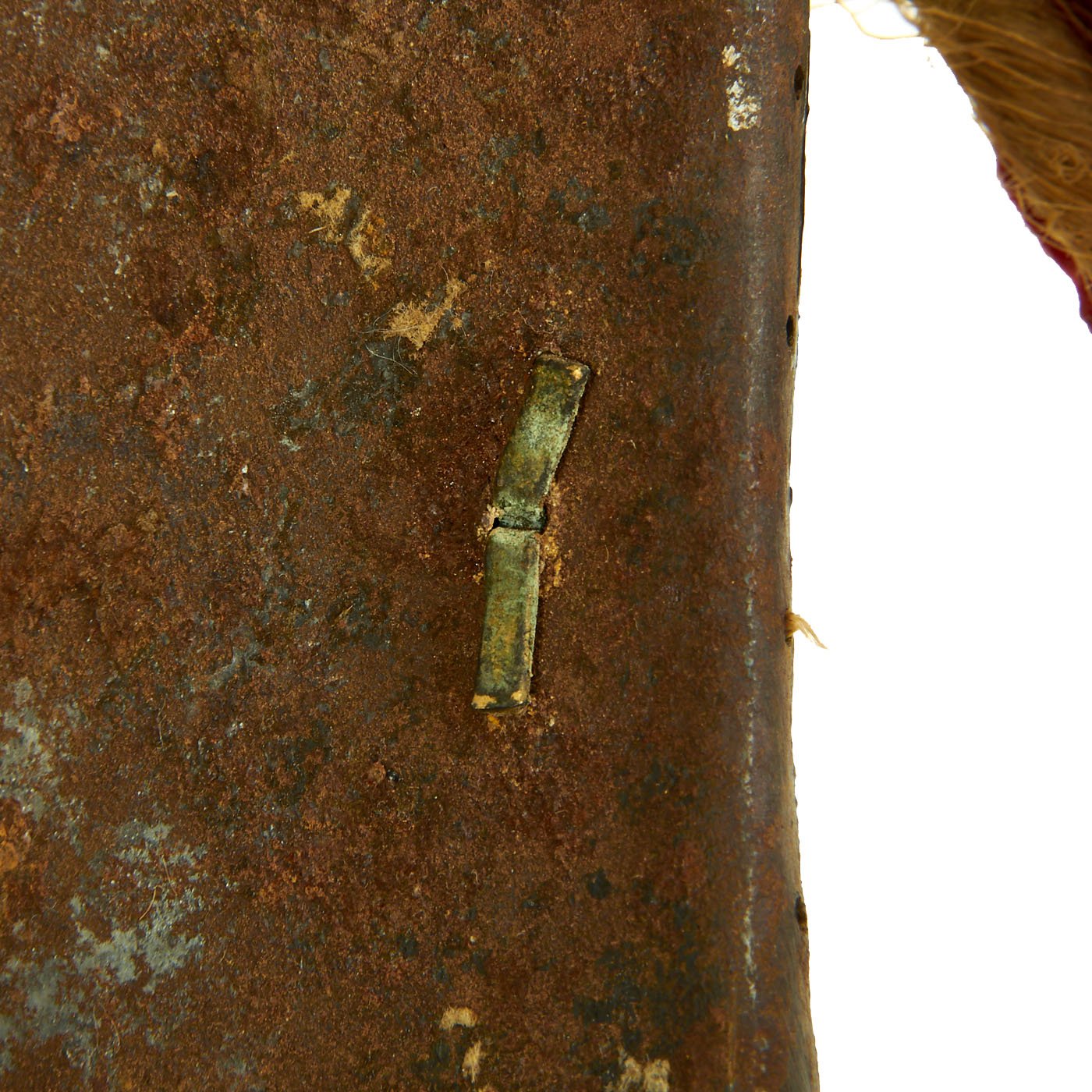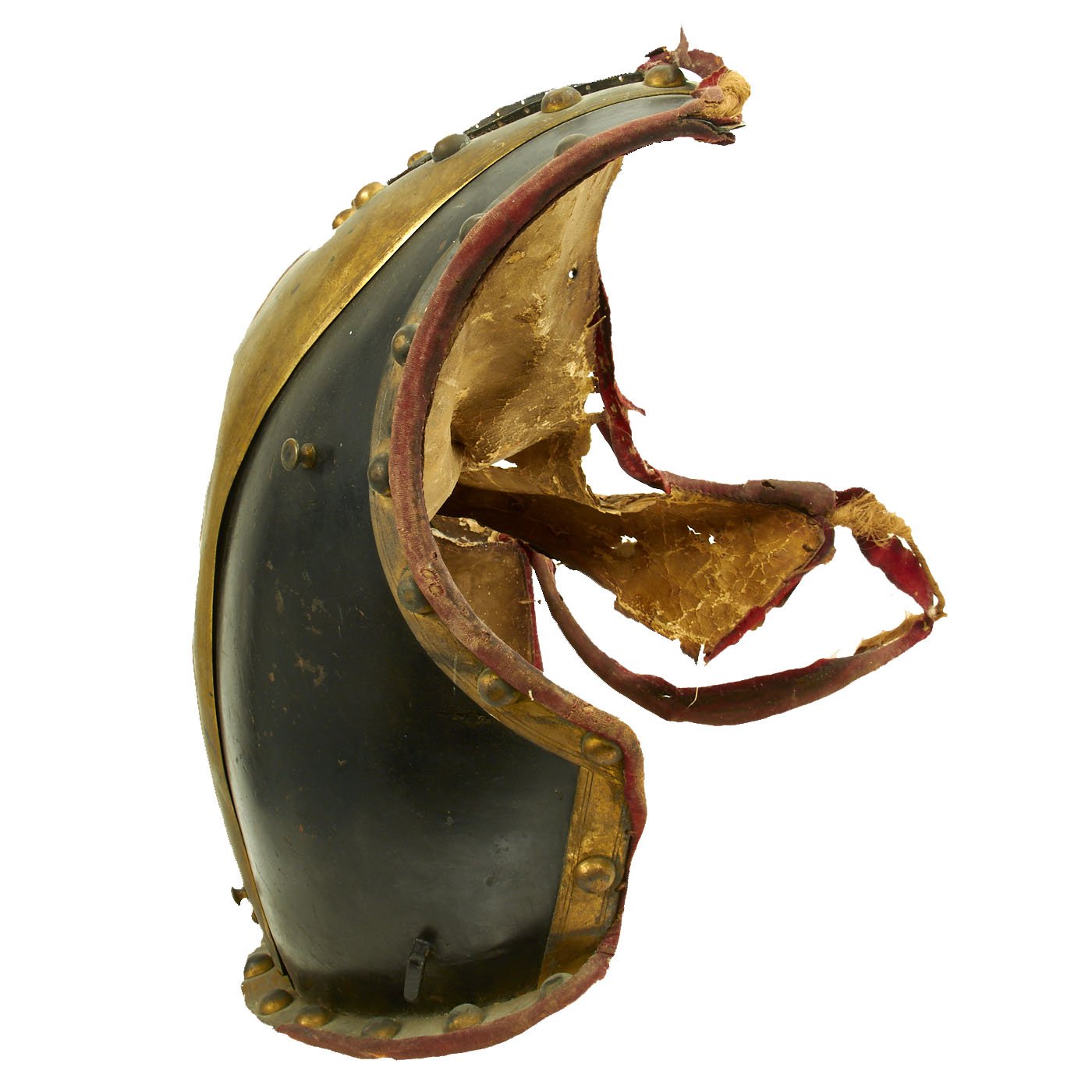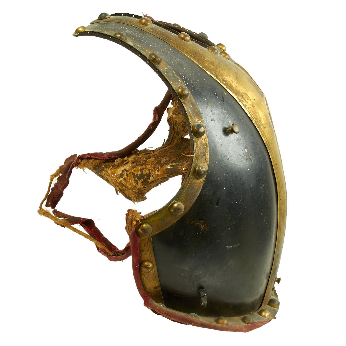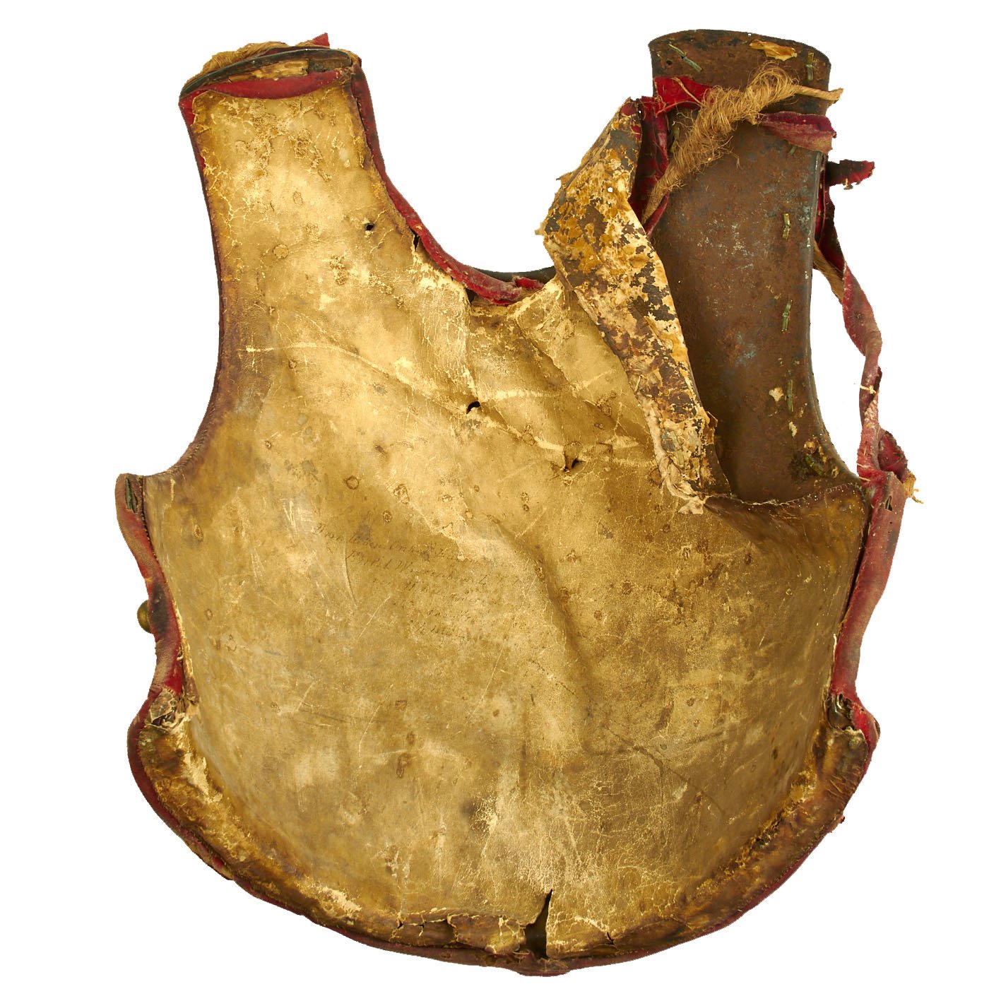 Original Item: Only One Available. We believe that this is a Franco-Austrian War Pattern 1850 Field Grade Austrian Cuirassier Officer Cuirass Breastplate. The armor is manufactured from iron, is magnetic and is finished in black. The breast plate incorporates a series of brass rivets around the perimeter. The rivets are affixed to five strips of brass: four on each side and one at the bottom. There are also two brass bolts that rise above the body of the breast plate and are placed on either side of the central vertical ridge on the chest, designed to receive the keyhole-shaped receptacles placed within the brass shoulder straps attached to the back plate. The center has a raised brass plate down the front of the chest tapering as it reaches the waist. The interior is lined in leather with red cloth trim. This lining is dray and delicate and has operated from the plate in multiple locations. Overall the condition of the breastplate is good with expected signs of wear from age and use. The hard-to-read, handwritten note indicating its use in "1859" suggests that it was used in the Franco-Austrian War which raged that year. A better condition but nearly identical Cuirass was sold at auction for close to $10,000 and can be seen at this link.