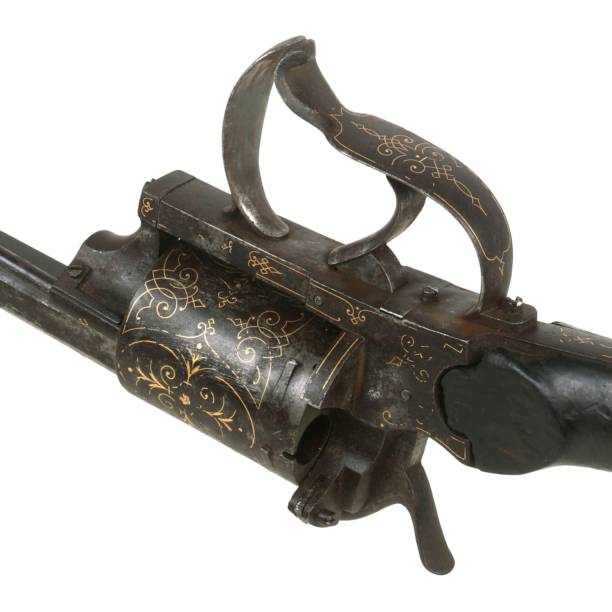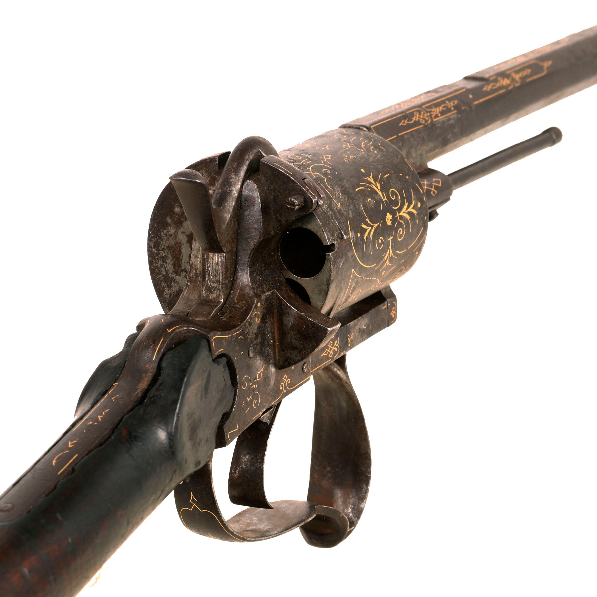 This gold inlaid example looks to be French or possibly Belgian, and the action is essentially a scaled up version of those used in the pinfire revolvers, but with a wooden butt stock and long rifled barrel. It looks to be in 14mm Lefaucheux pinfire chambering, double / single action with a 6 round cylinder. There are a few markings that look to be proofs, but no markings that could definitively identify who made it or where. We assume it was originally an upmarket showpiece example, based on the gold inlaid designs and heavily figured wood stock.