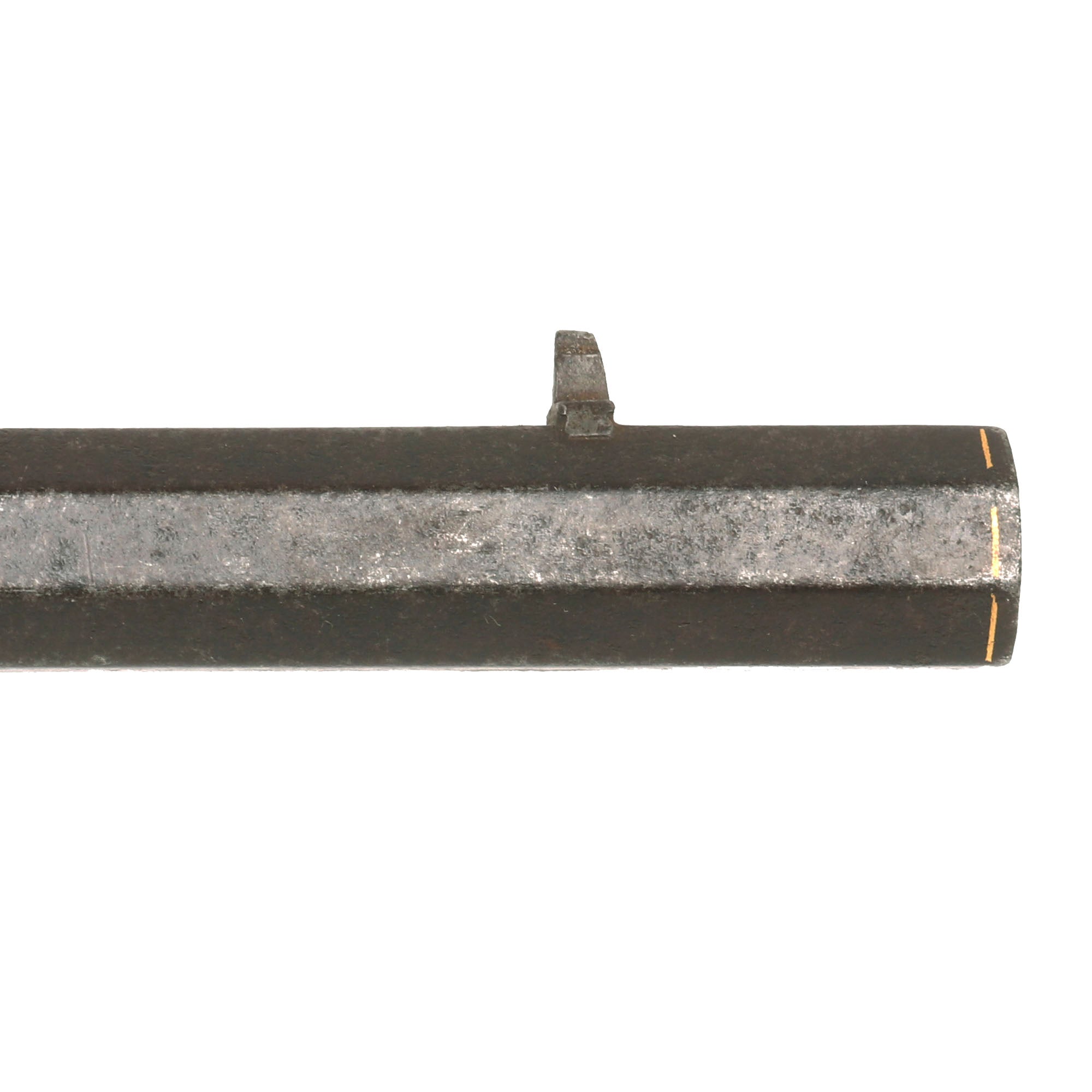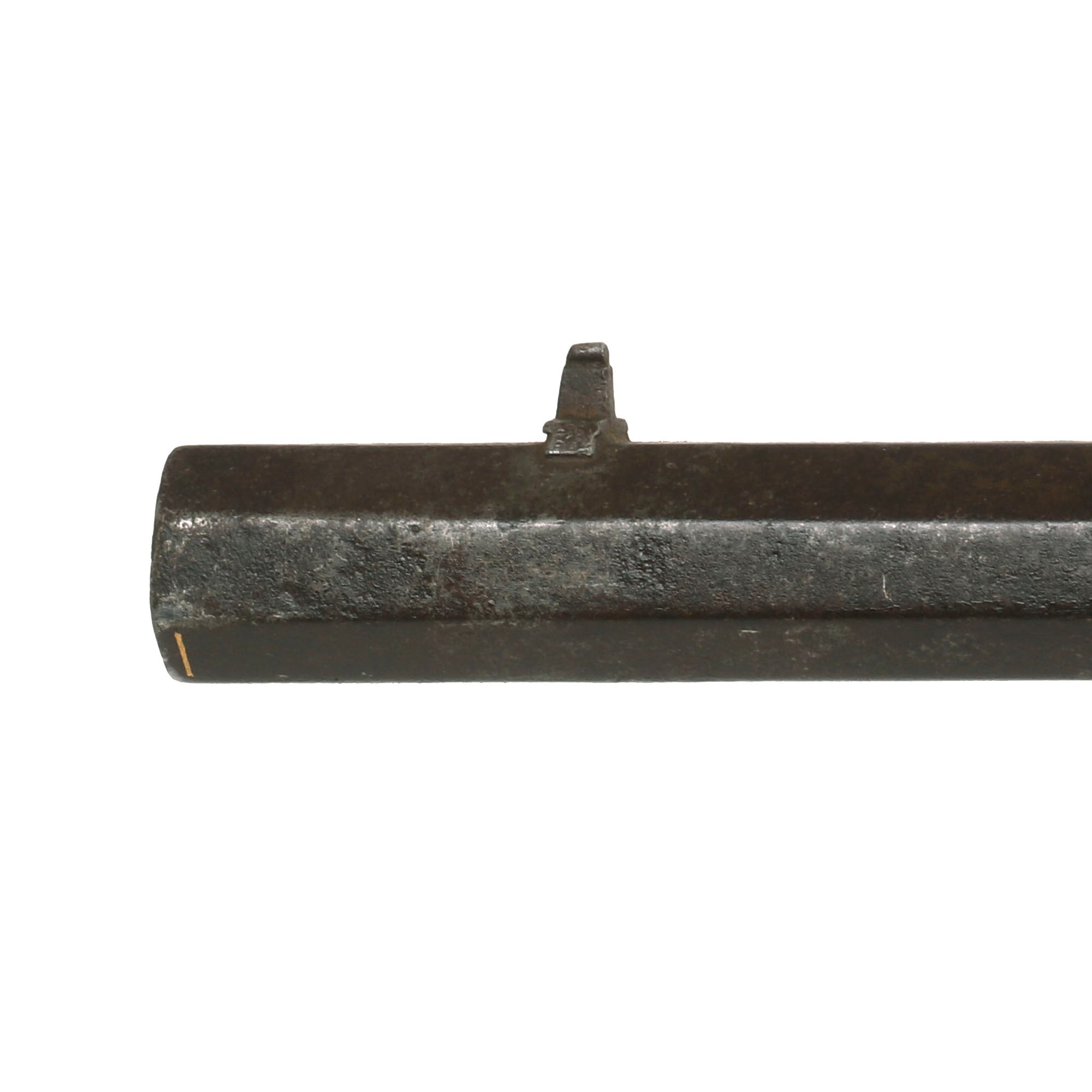 Functionally, it cycles very well in both single and double action. The cylinder indexes correctly, and it has a crisp dry fire. We did not notice any of the finicky behavior we sometimes see on pinfire revolving systems. The bore has 7 groove rifling, which is still easily visible, however the interior of the bore definitely shows past fouling and oxidation, and it is partly dark. It definitely looks to have seen a good amount of service, and was probably not cleaned properly after the last use. The rifle still has the steel ejector rod, which works correctly, however the loading gat is unfortunately missing.