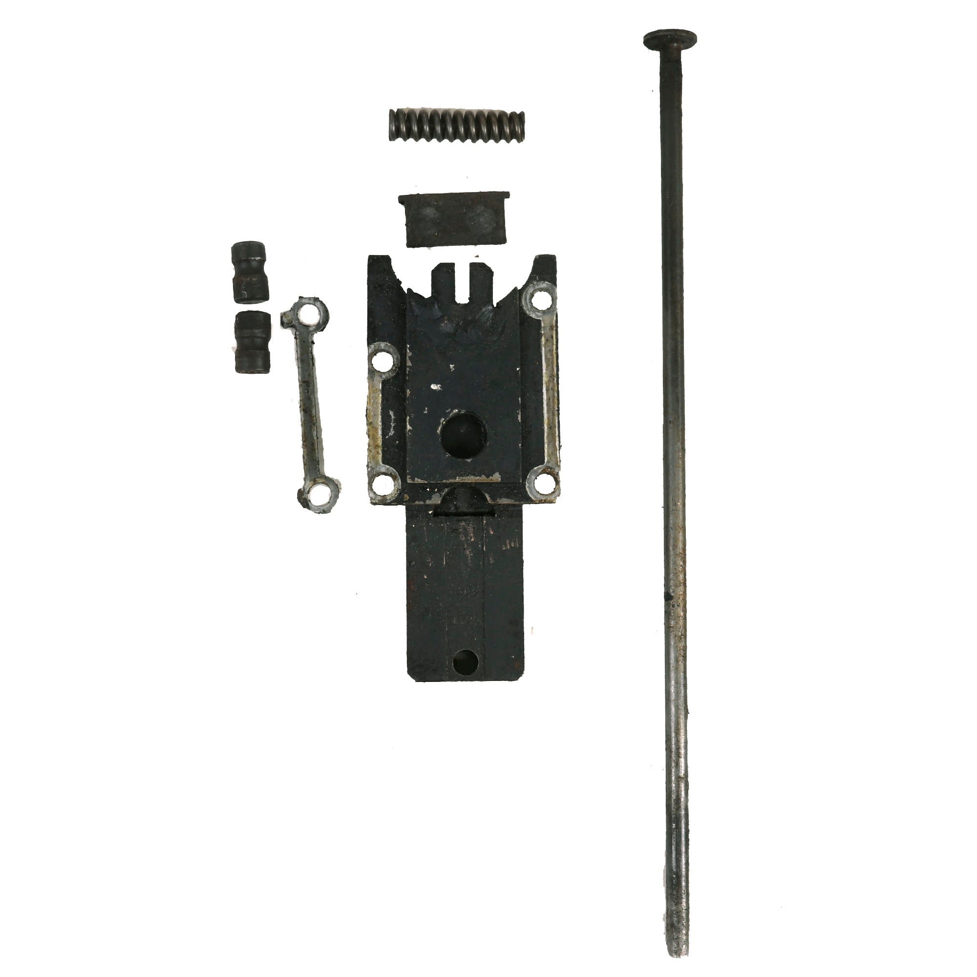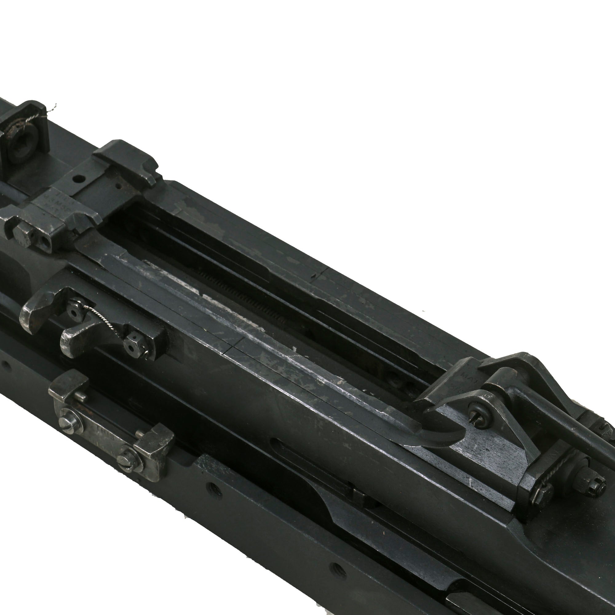 This indicates manufacture by Manufacture Nationale d’Armes de Tulle, one of the French National Arms factories, with a history going back to 1690. There is the MAT marking on various other places on the gun, which measures a very long 79 ½ inches in length. The gun is mounted on a carriage, which we believe was normally installed inside the aircraft, allowing the gun to be removed and serviced if needed. We noted that just about all of the nuts and bolts have holes through the heads, with many still having wire wrapped and twisted around. This was done to ensure that vibrations in the aircraft did not cause the bolts to come loose, as that would also possibly introduce a loose bolt that could fly around, damaging additional items.