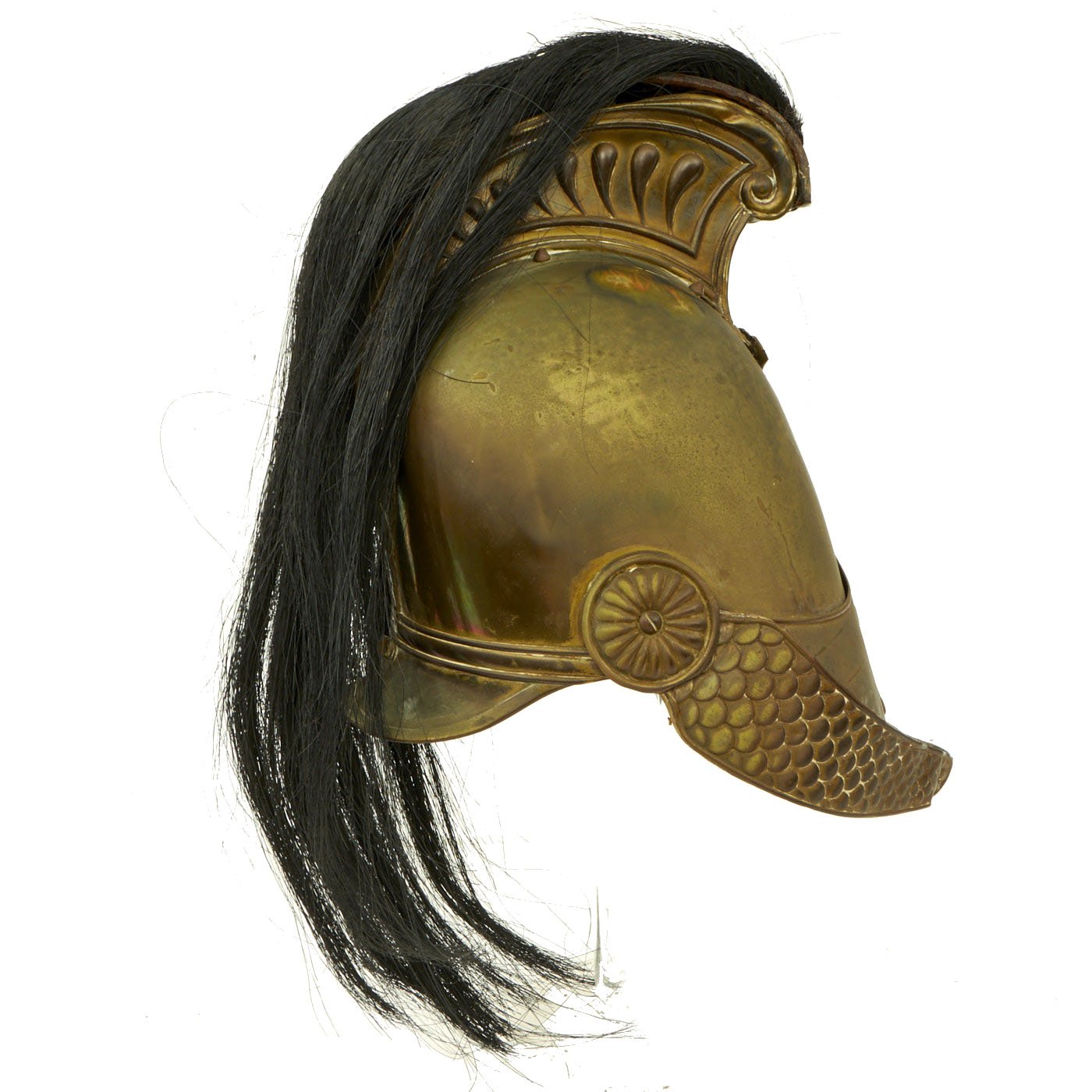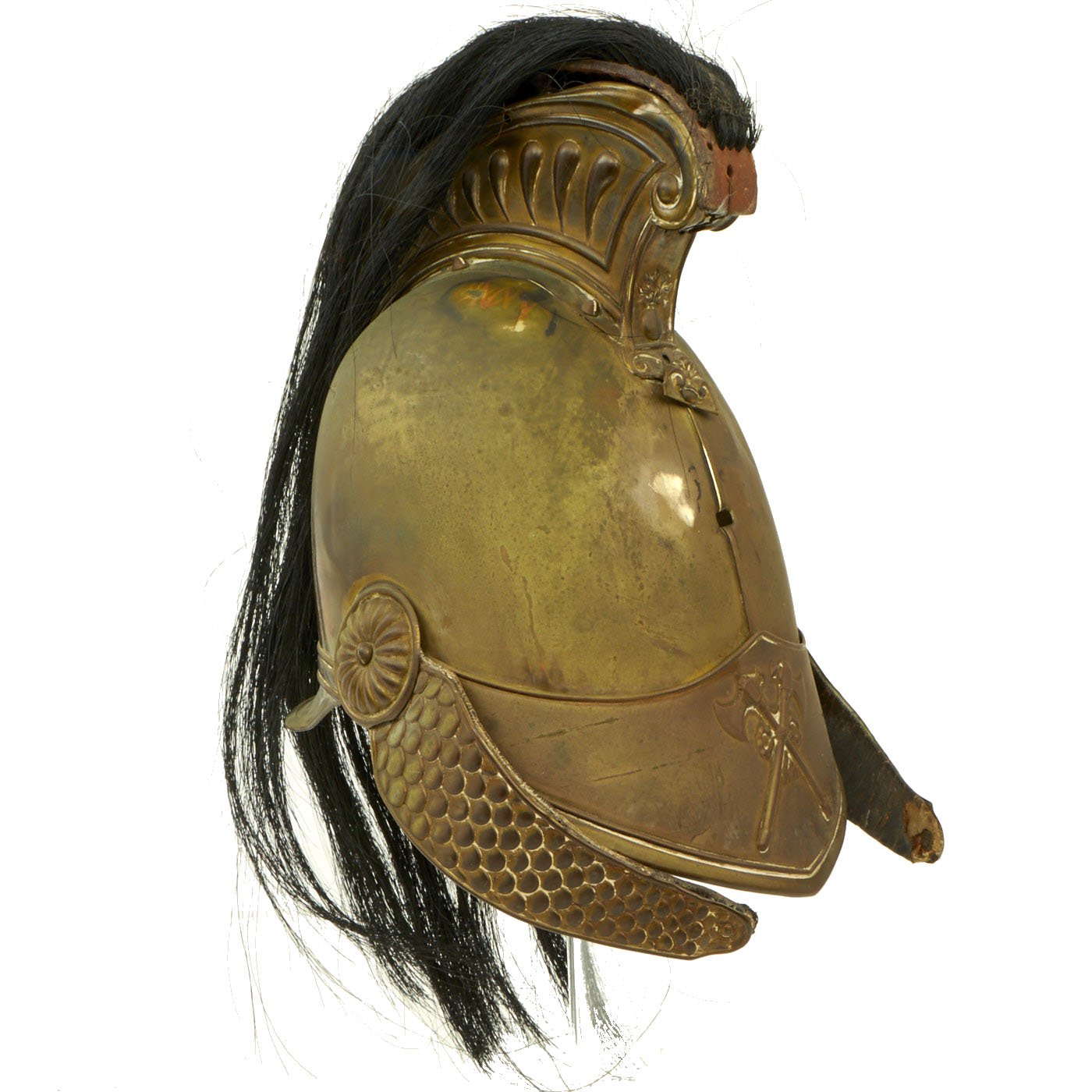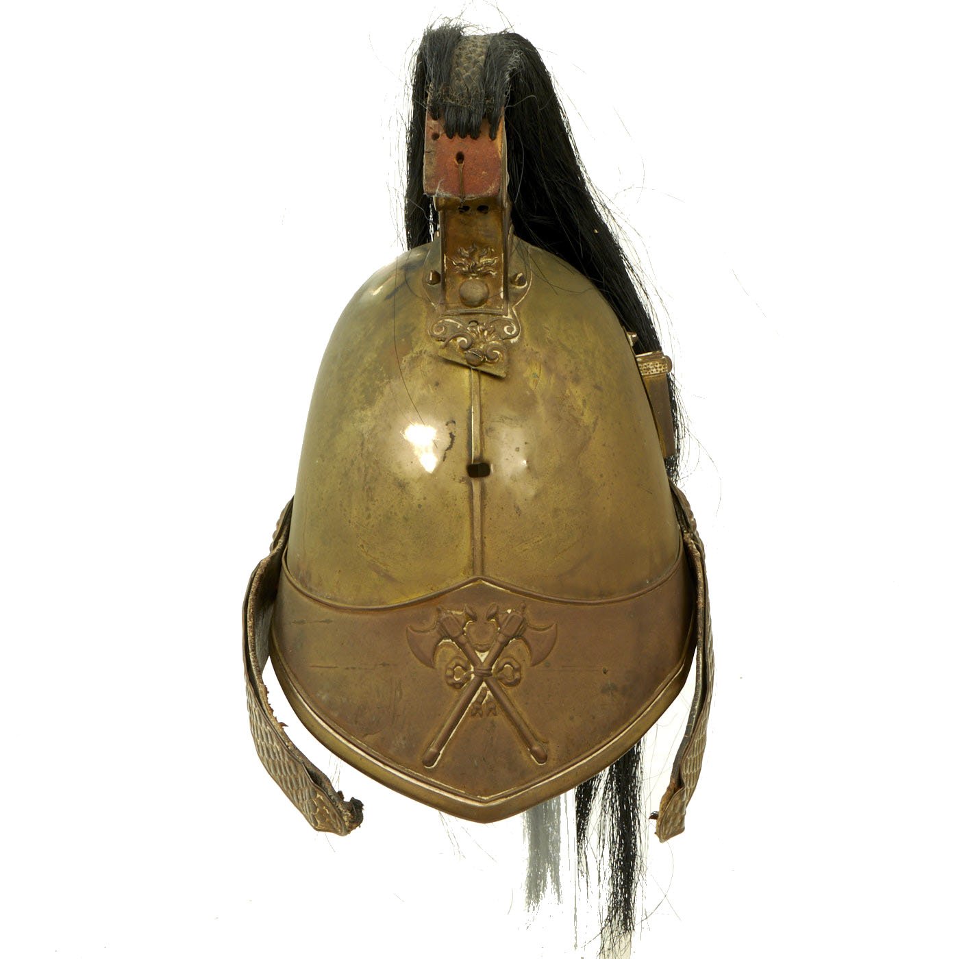 Original Item: Only One Available. This is a fine complete example of an all original French brass Casque de Pompier (fire helmet) shell, with horsehair attached to the top comb. The helmet is missing the front plate, which would have identified the area it was used in, however it still has the movable front visor with the crossed fire axes, a definitely sign it is for fire brigade use. It has a lovely rigid brass chin strap, which was most likely kept secured together in the front of the helmet.