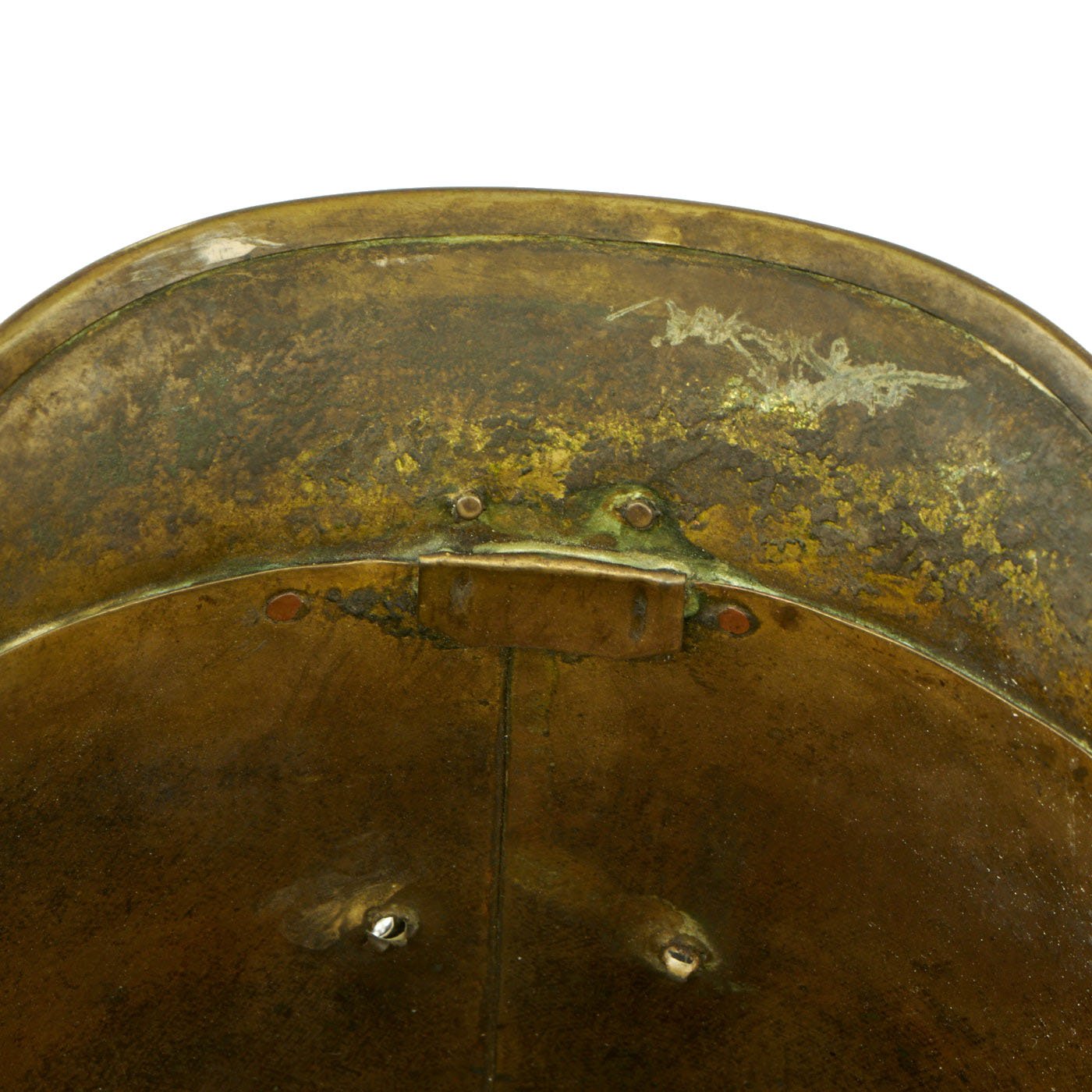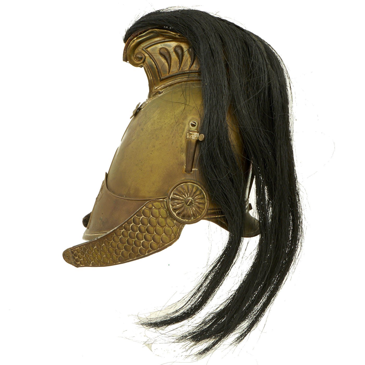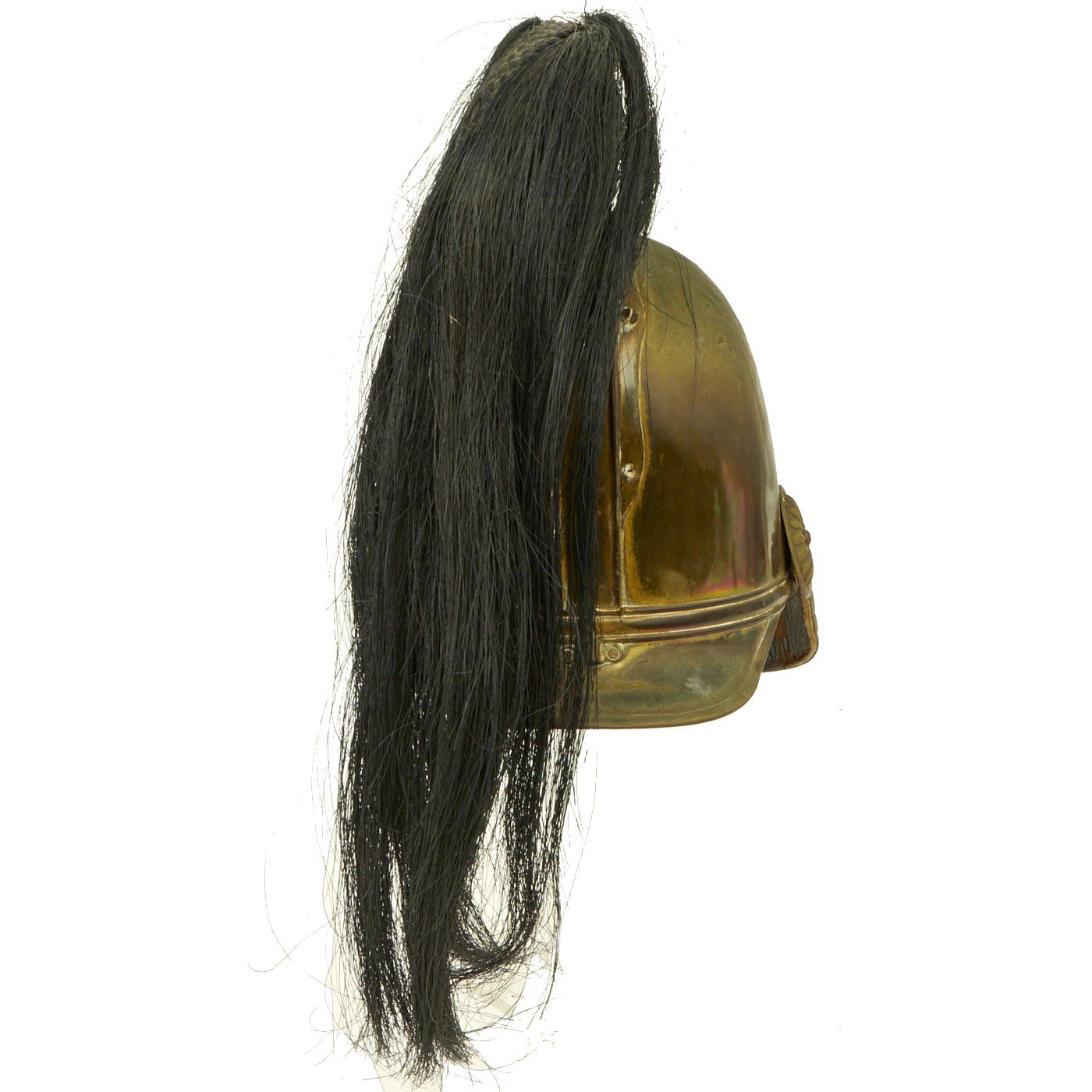 Original Item: Only One Available. This is a fine complete example of an all original French brass Casque de Pompier (fire helmet) shell, with horsehair attached to the top comb. The helmet is missing the front plate, which would have identified the area it was used in, however it still has the movable front visor with the crossed fire axes, a definitely sign it is for fire brigade use. It has a lovely rigid brass chin strap, which was most likely kept secured together in the front of the helmet.
