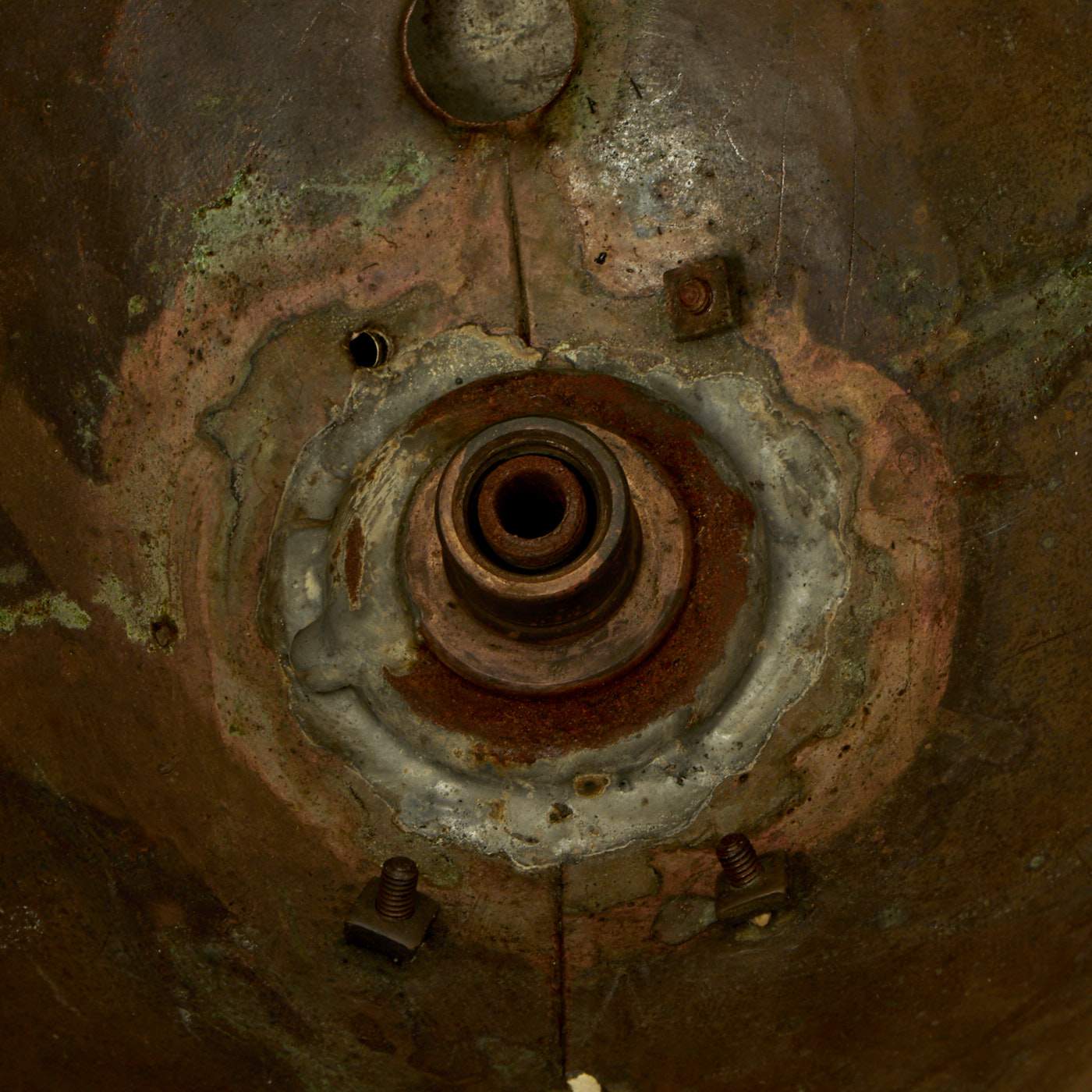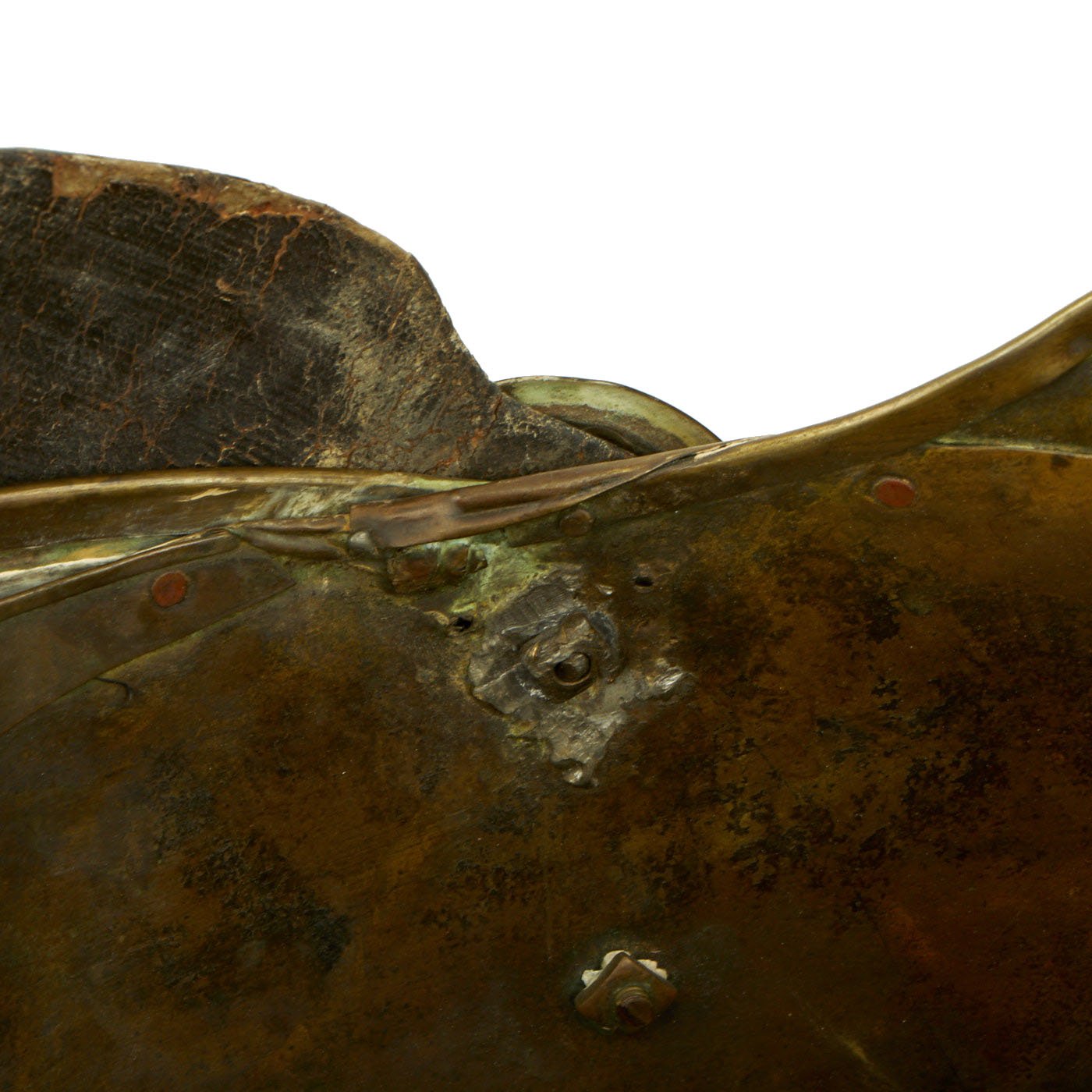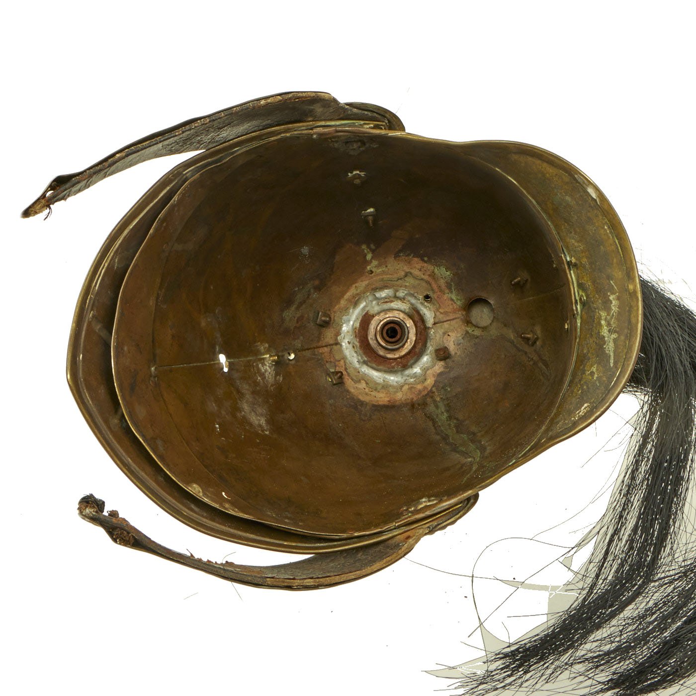 The Helmet shell is in good condition, though the liner and chin strap are completely missing. The small socket on the left side for a hackle or cockade is still present, but the cockade unfortunately isn't. There is definitely deformation to the top comb, which is crushed inward on the left side, and separated from the top strip that holds the horse hair.. This definitely looks like a helmet that saw actual service.
