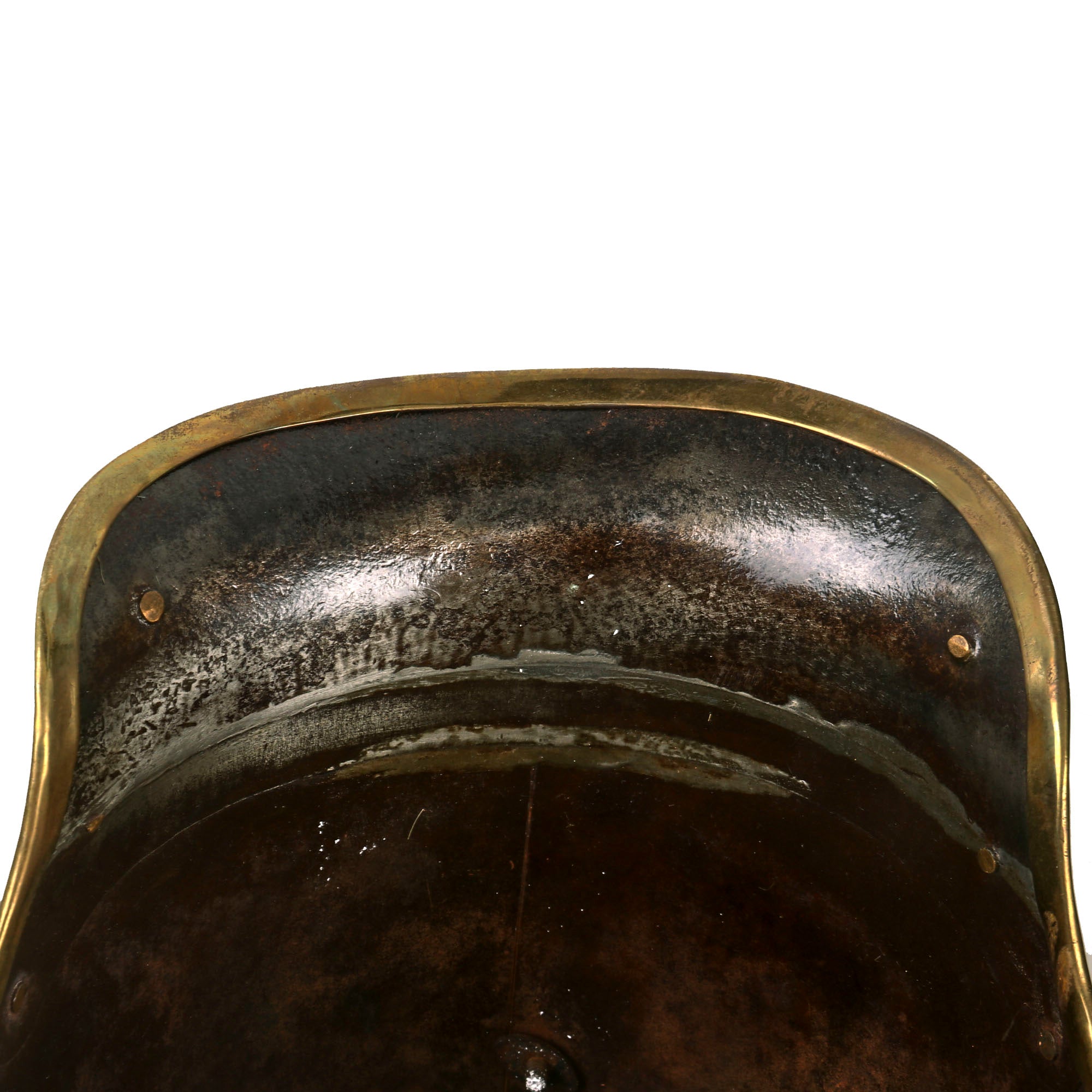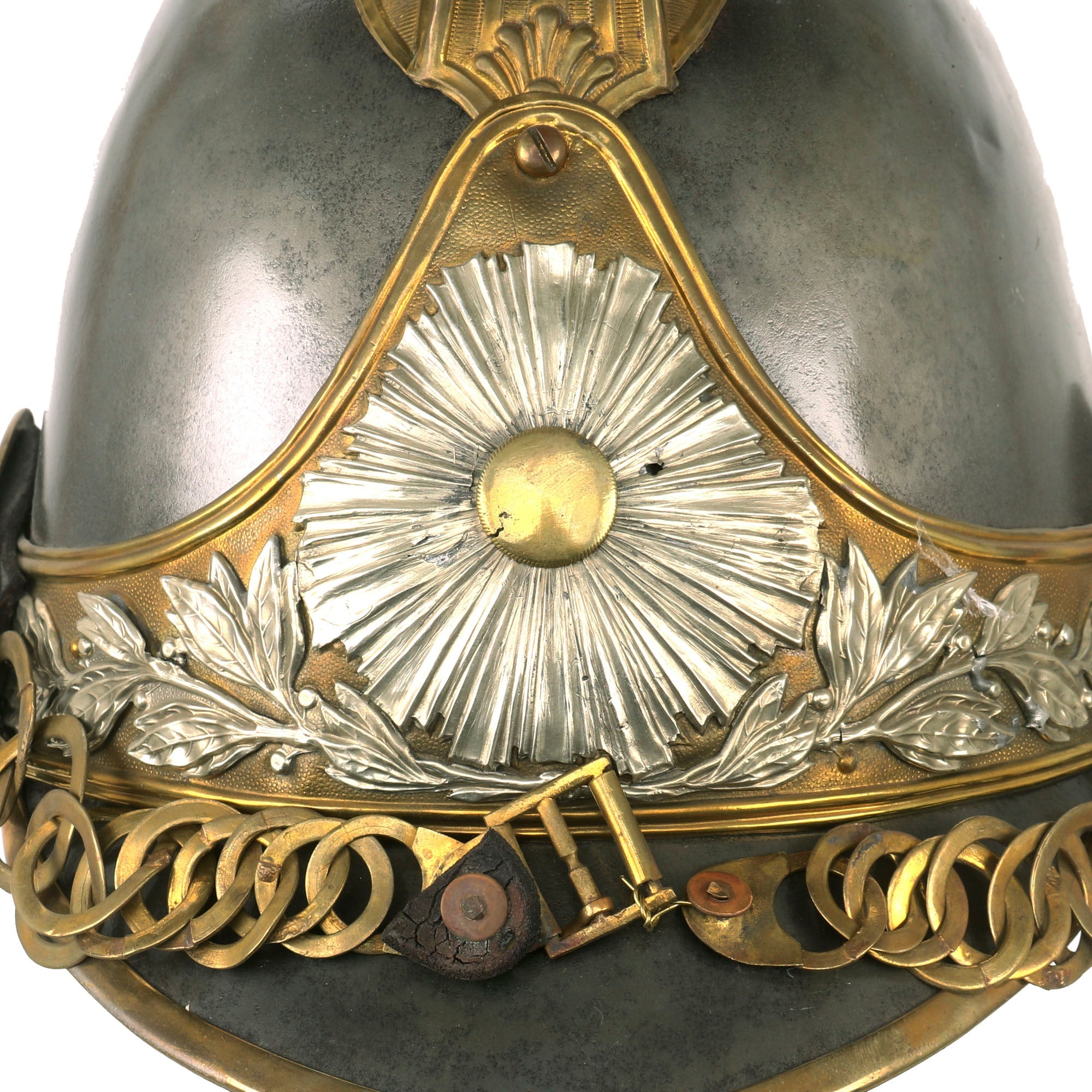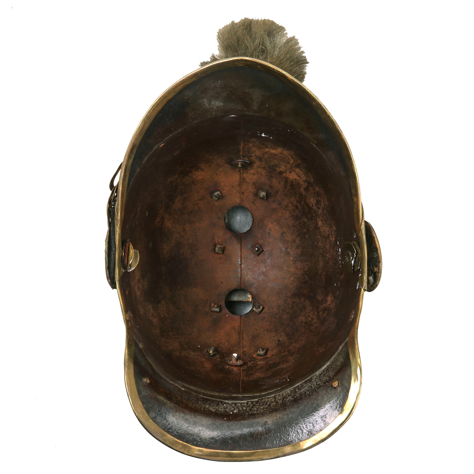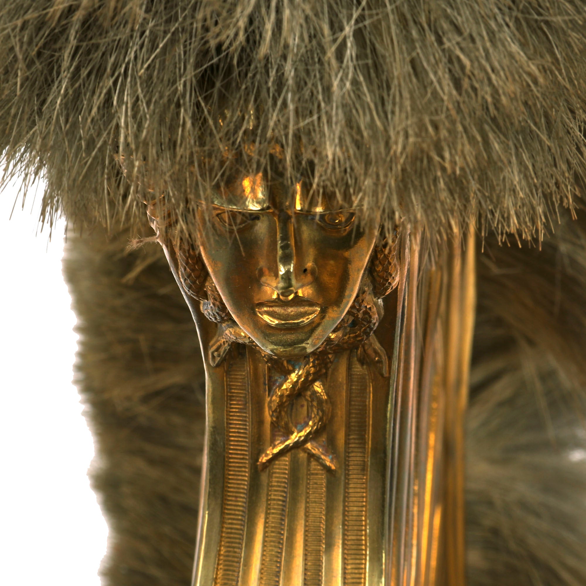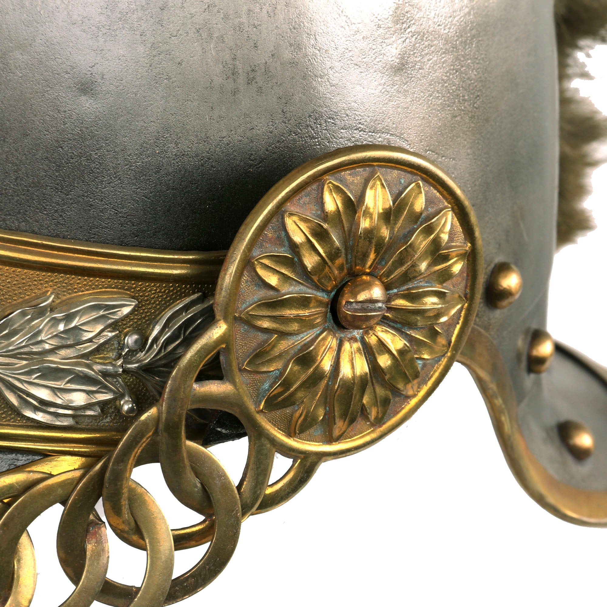Original French 2nd Empire Model 1825 Carabinier Brass and Steel Helmet: This is a wonderful French Model 1825 Carabinier Helmet, with steel skull, brass comb embossed with beaded fluting and terminating with the head of Medusa, and red horsehair mane. The brass helmet plate is embossed with sun rays flanked by laurel leaves, with brass bound front and back peaks. It still retains the chin rings (chinstrap) though any leather that may have been present is not.