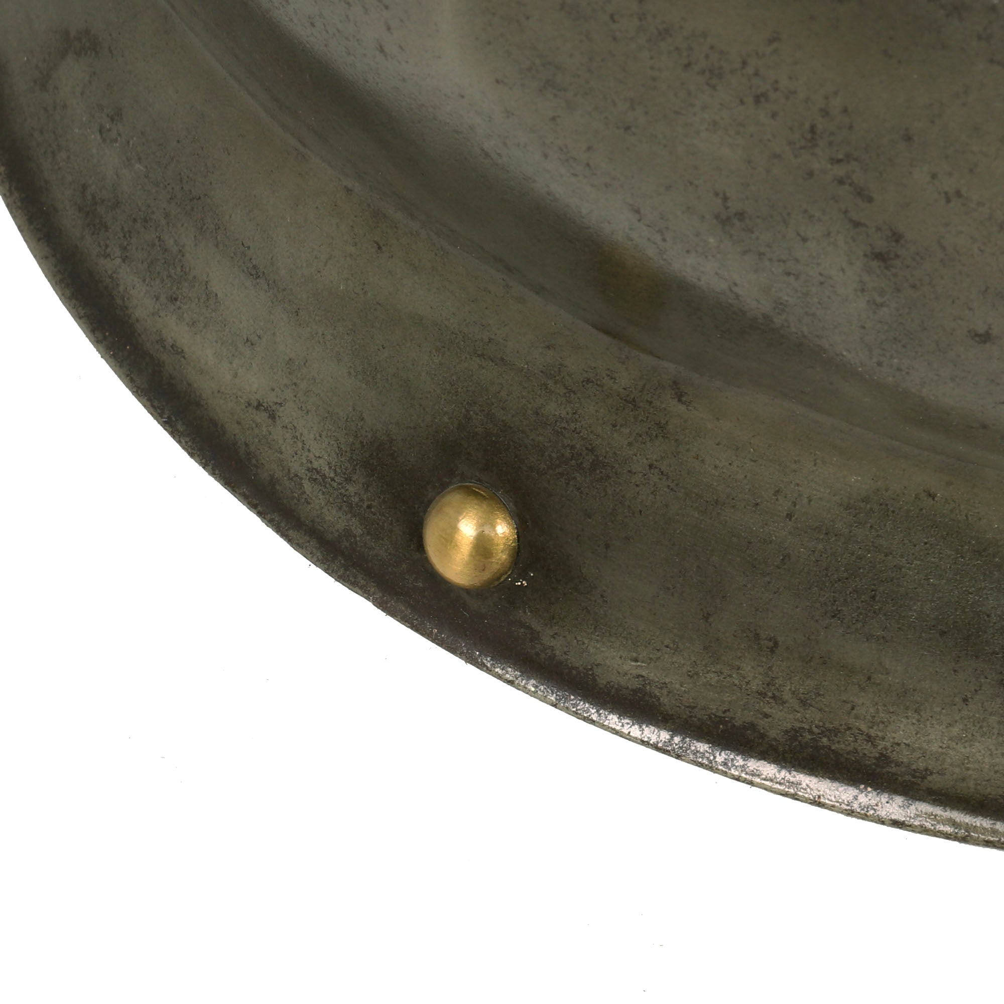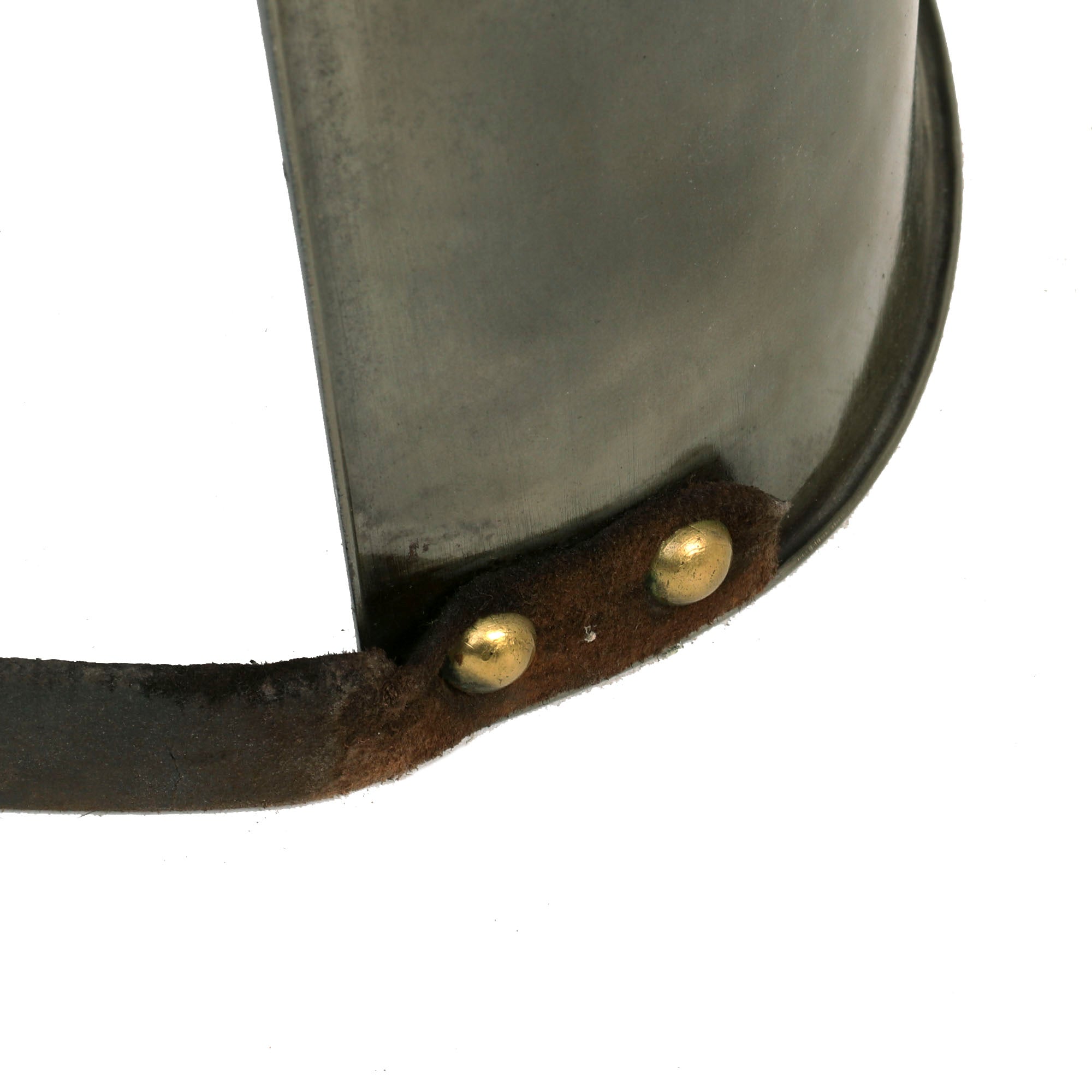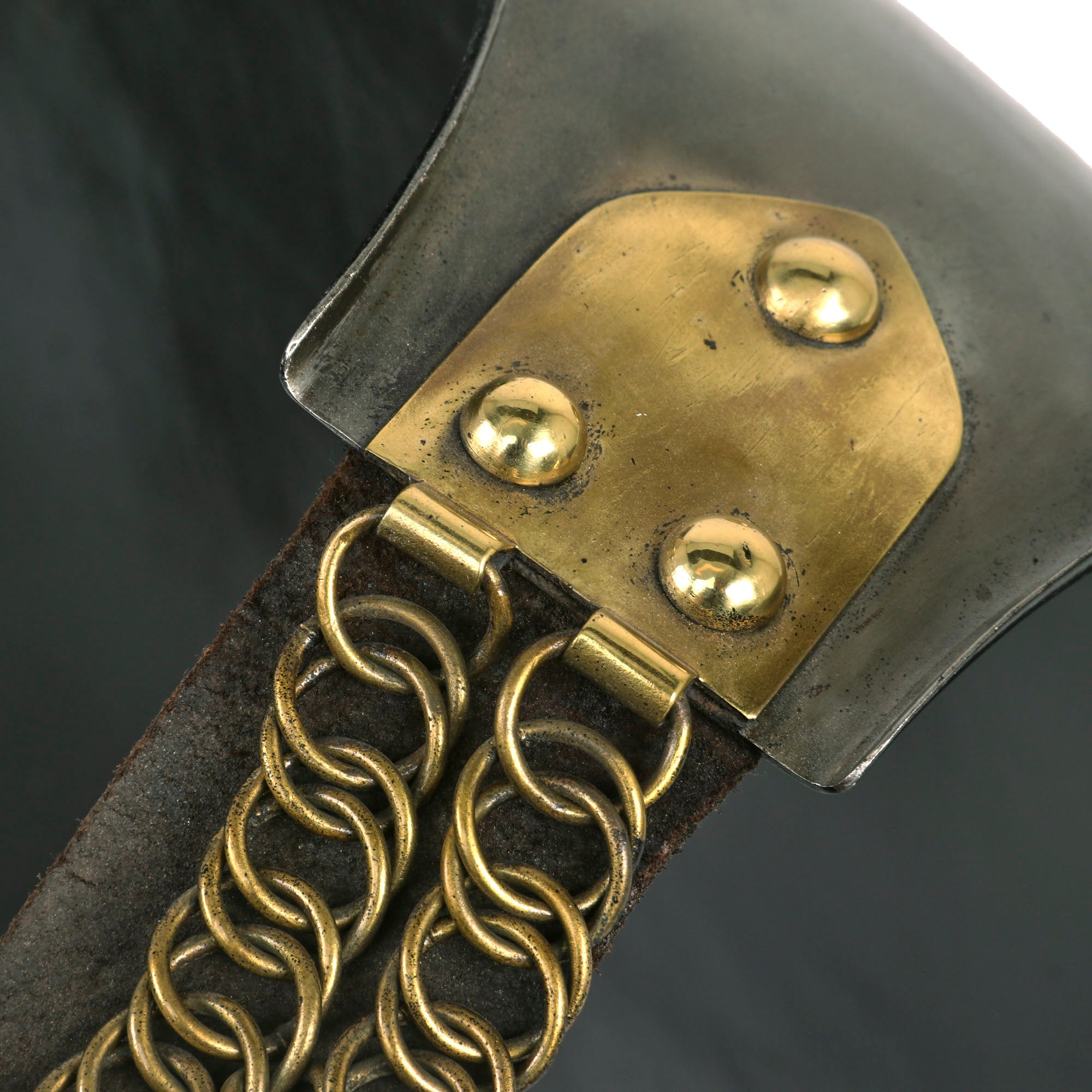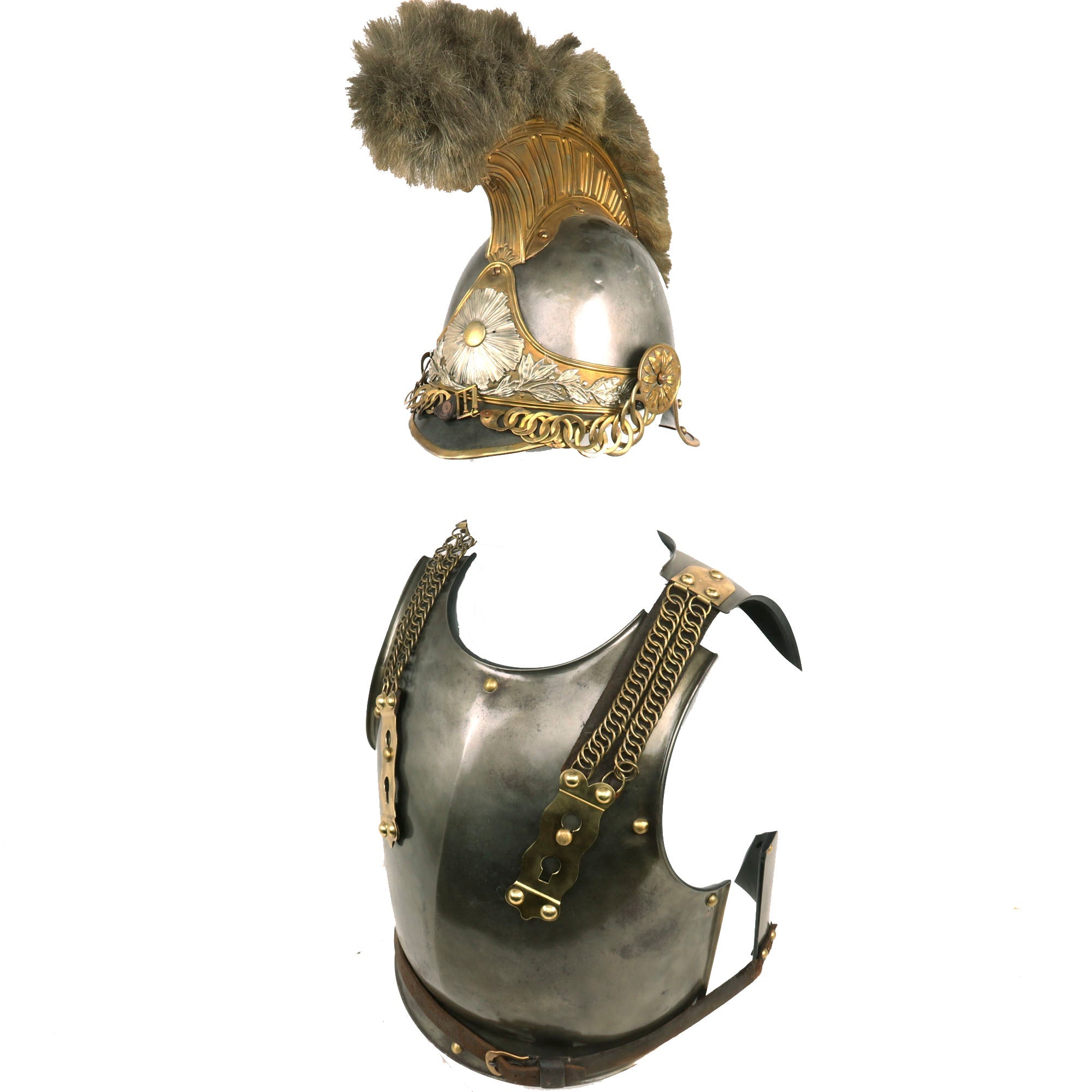 Original French Pattern 1814 Carabinier Cuirass Set: Here we offer an extremely rare set of M-1814 Brass faced Cuirass of the elite Carabiniere, the design from this tumultuous period. The Cuirass, both front and back plates retain their original substantial brass facings and both chained shoulder straps. All in all this is a wonderful set though it most certainly was cleaned and the interior repainted. There are still markings visible on the interior, giving it a lot of potential for further research!