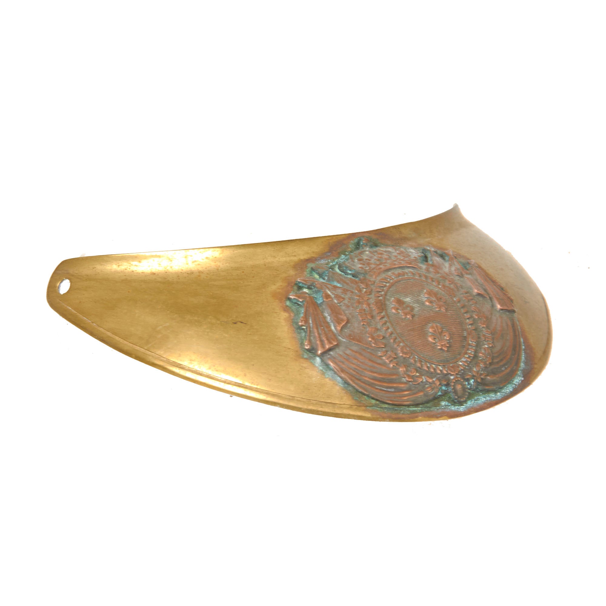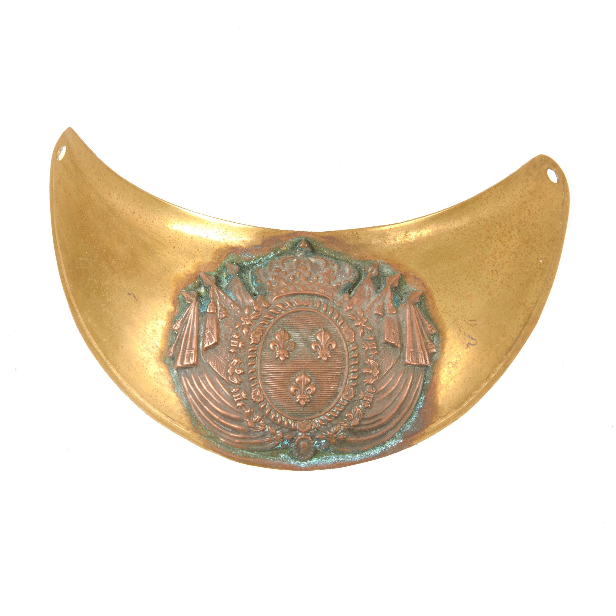 Original Item: Only One Available. This is a lovely example of a 19th Century French Second Empire Officer’s Gorget, as worn by the Royal Guard of the Restoriation. A gorget, from the French gorge meaning throat, was a band of linen wrapped around a woman's neck and head in the medieval period or the lower part of a simple chaperon hood. The term later described a steel or leather collar to protect the throat, a set of pieces of plate armor, or a single piece of plate armor hanging from the neck and covering the throat and chest. Later, particularly from the 18th century, the gorget became primarily ornamental, serving as a symbolic accessory on military uniforms, a use which has survived in some armies.