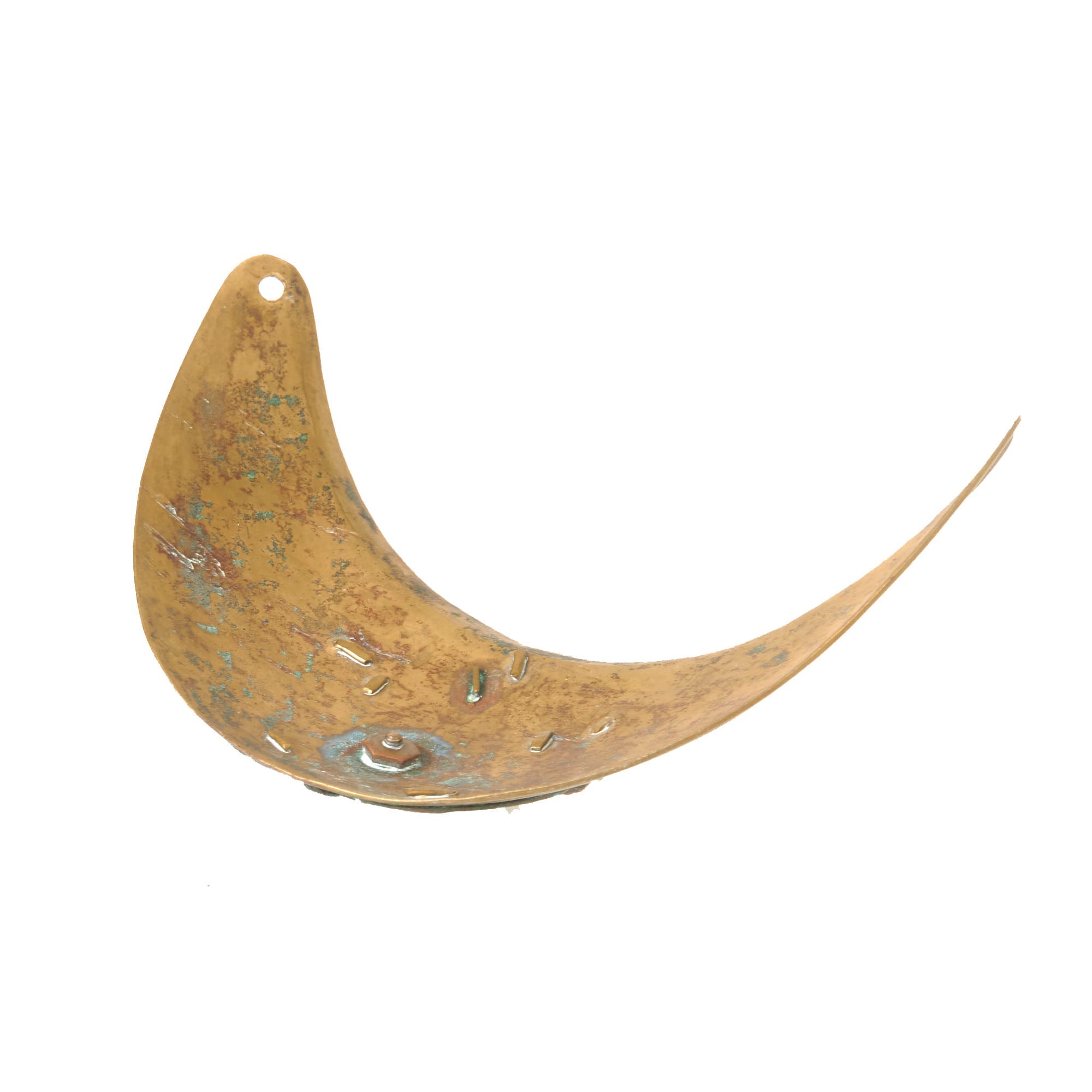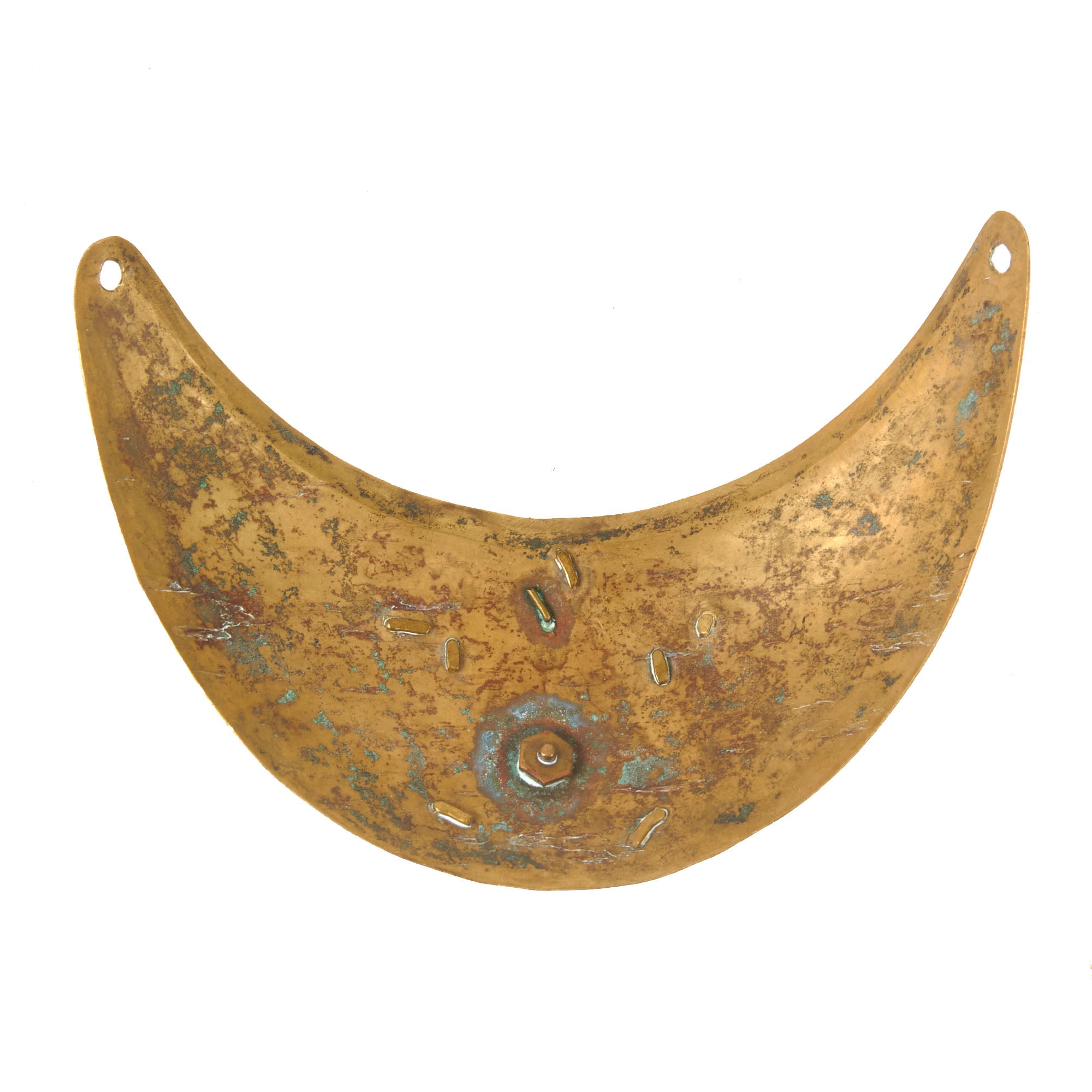 The gorget is constructed out of brass which has tarnished to a lovely patina, and features the copper arms of the Royal Guard of the Restoration period, which shows very heavy wear and very heavy verdigris around the border. There is minor pitting present on the reverse as well as scratching. The gorget measures 4⅞ x 3½”.