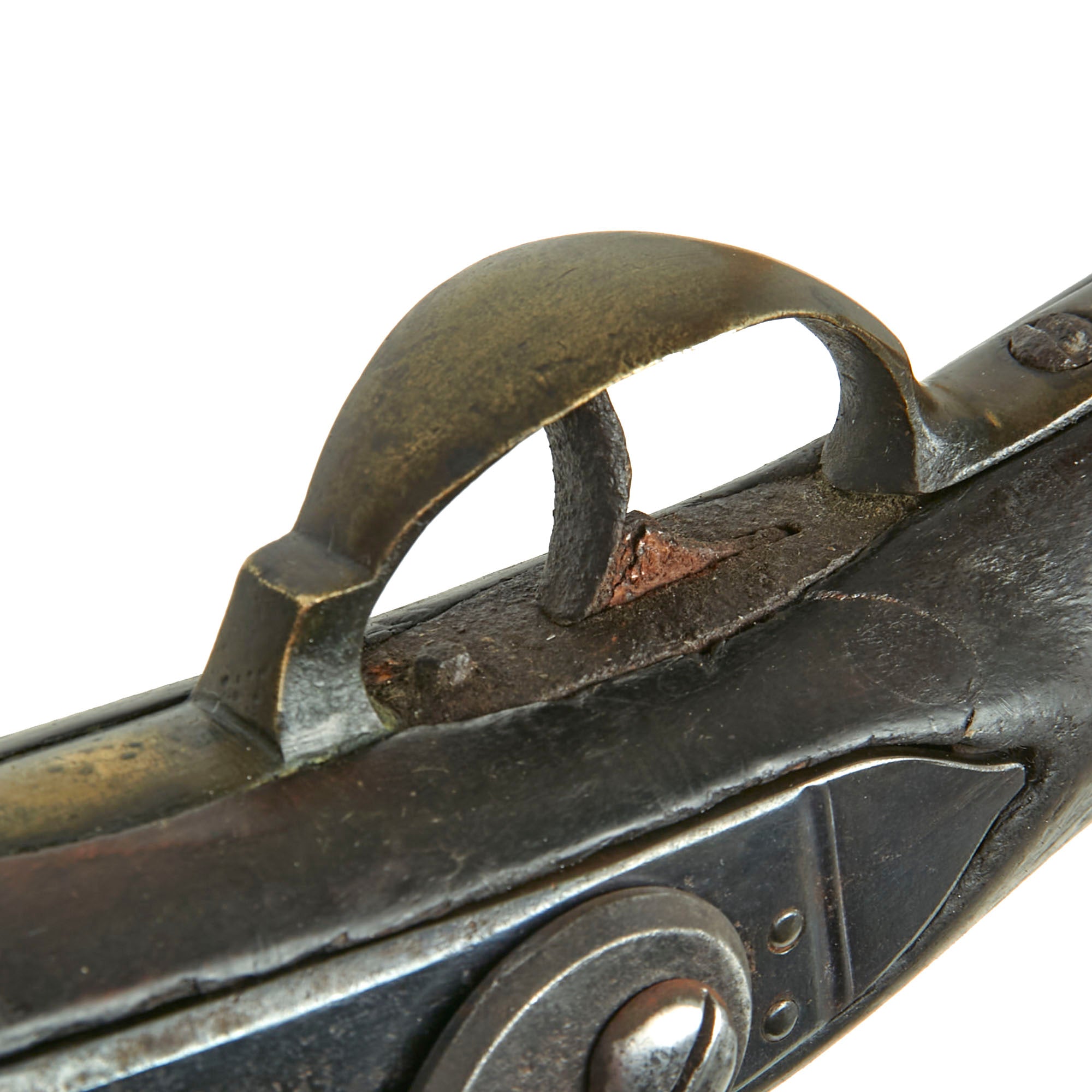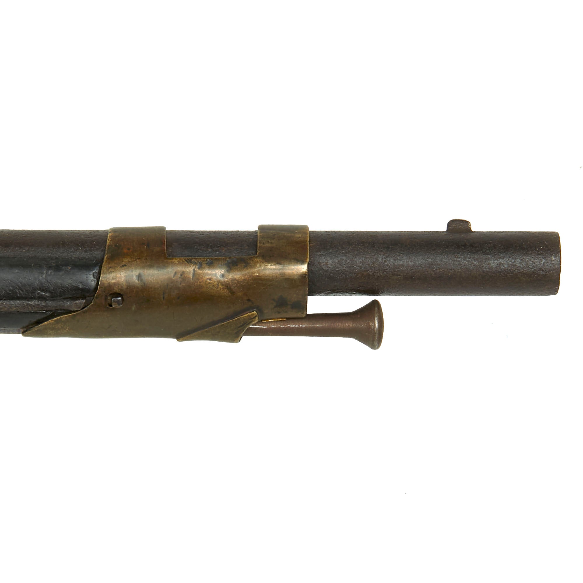 The musket is all brass fitted, as we would expect with one intended for Naval use, and the brass trigger guard was never drilled for a sling swivel, further solidifying use at sea. While there is a sling swivel bolster on the middle barrel band, we see no evidence that one was ever installed, as onboard ships leather slings would quickly deteriorate. The oxidized and past pitting on the barrel is also indicative of service at sea, where the corrosive salt spray would rapidly degrade iron and steel.