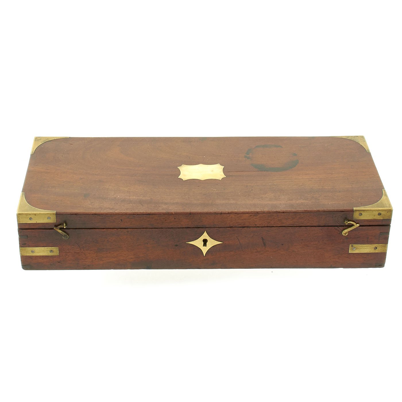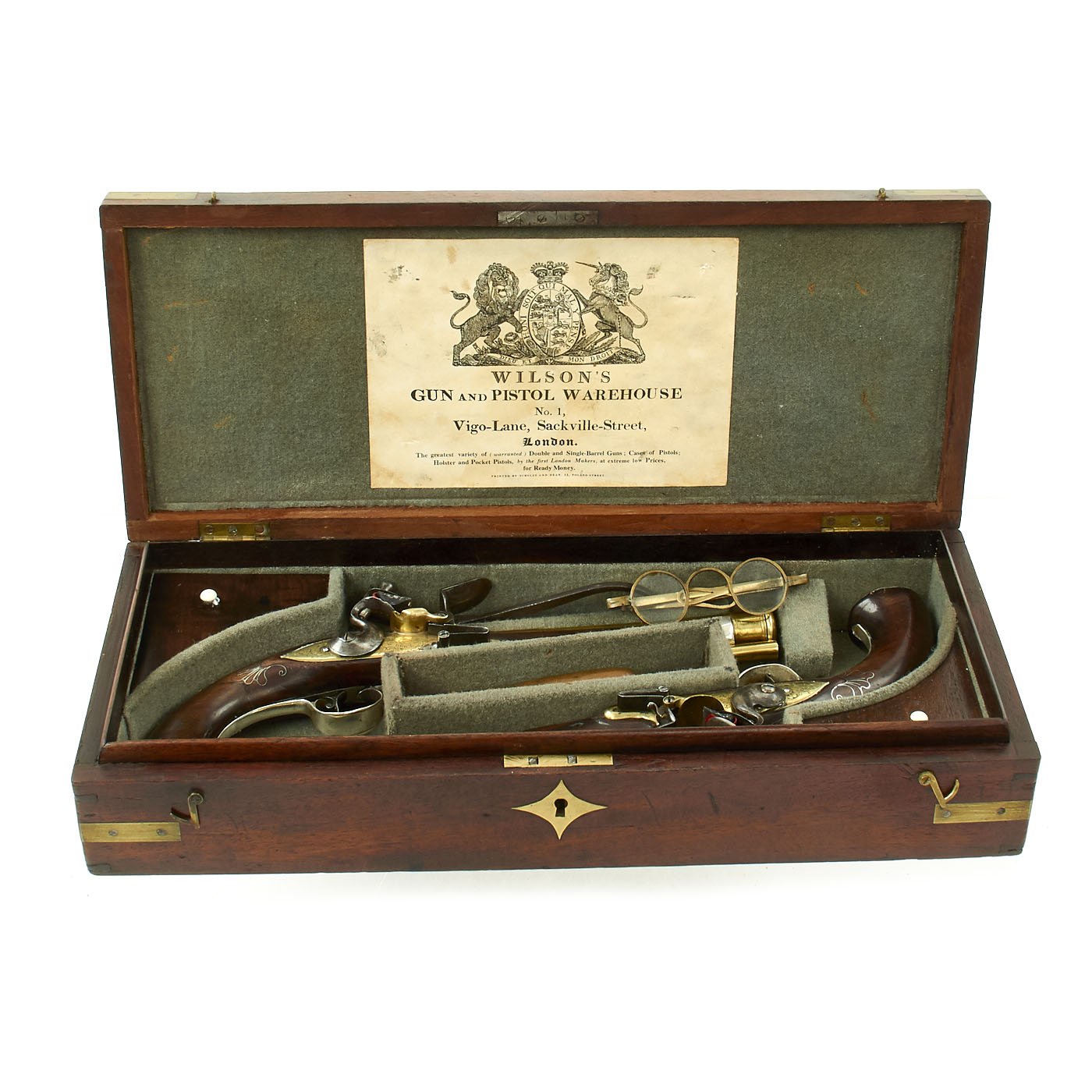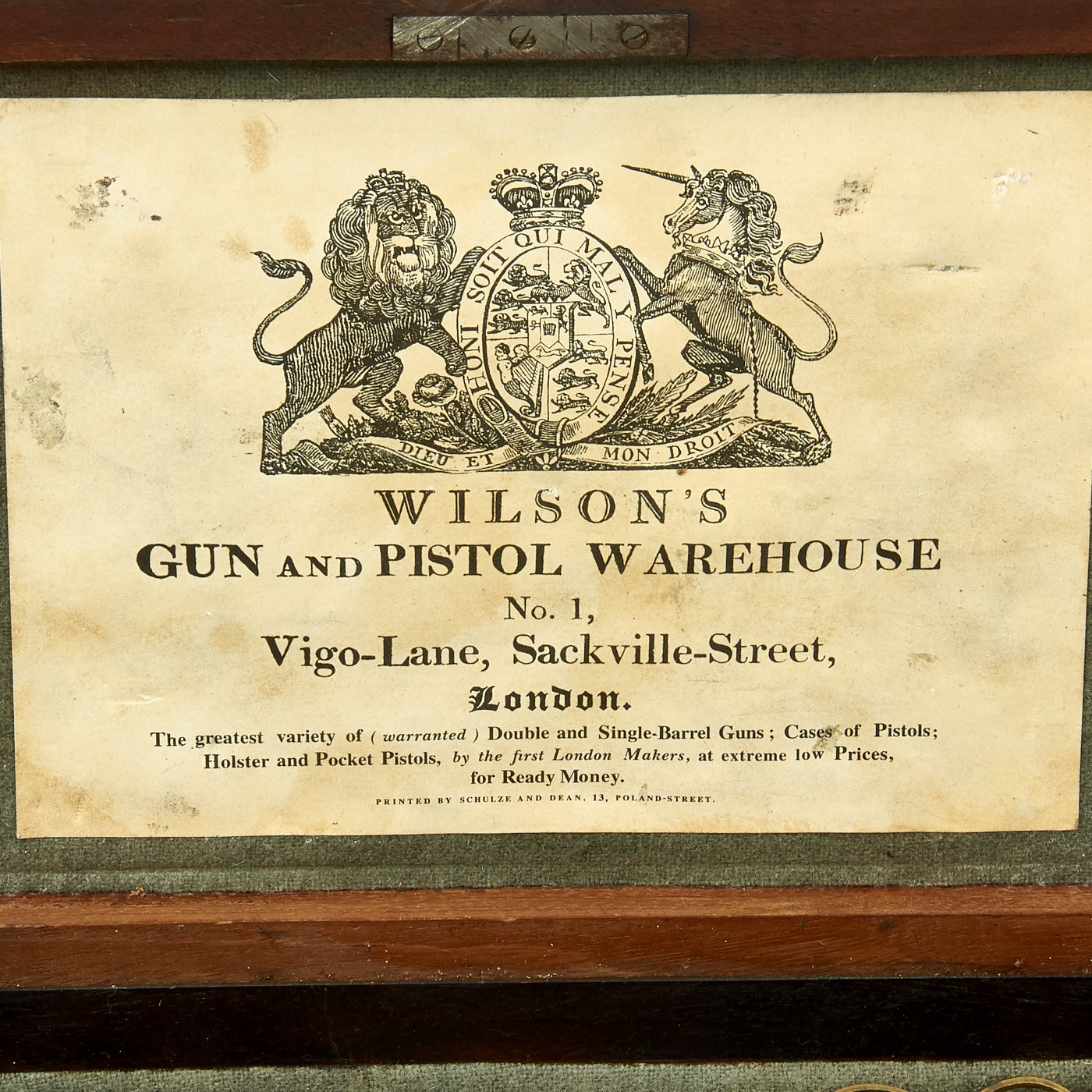 These pistols predate the case by 10-20 years, and later, perhaps at the owner's instruction, were cased up with accessories by WILSON, a very prolific London Gun Maker who also worked in London up until 1820.