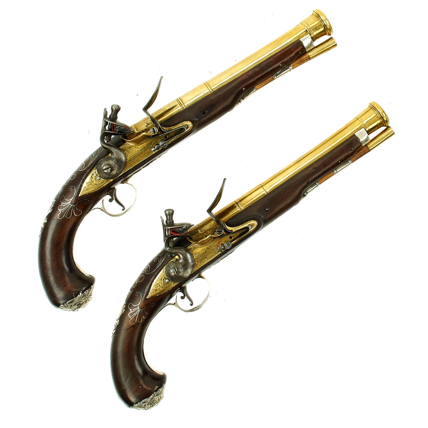 The pistols themselves are really quite nice, and fully functional, with locks that hold correctly at half cock, and fire at full. The stocks are solid, with some evidence of past repairs. Please consult the high resolution photographs for condition details.