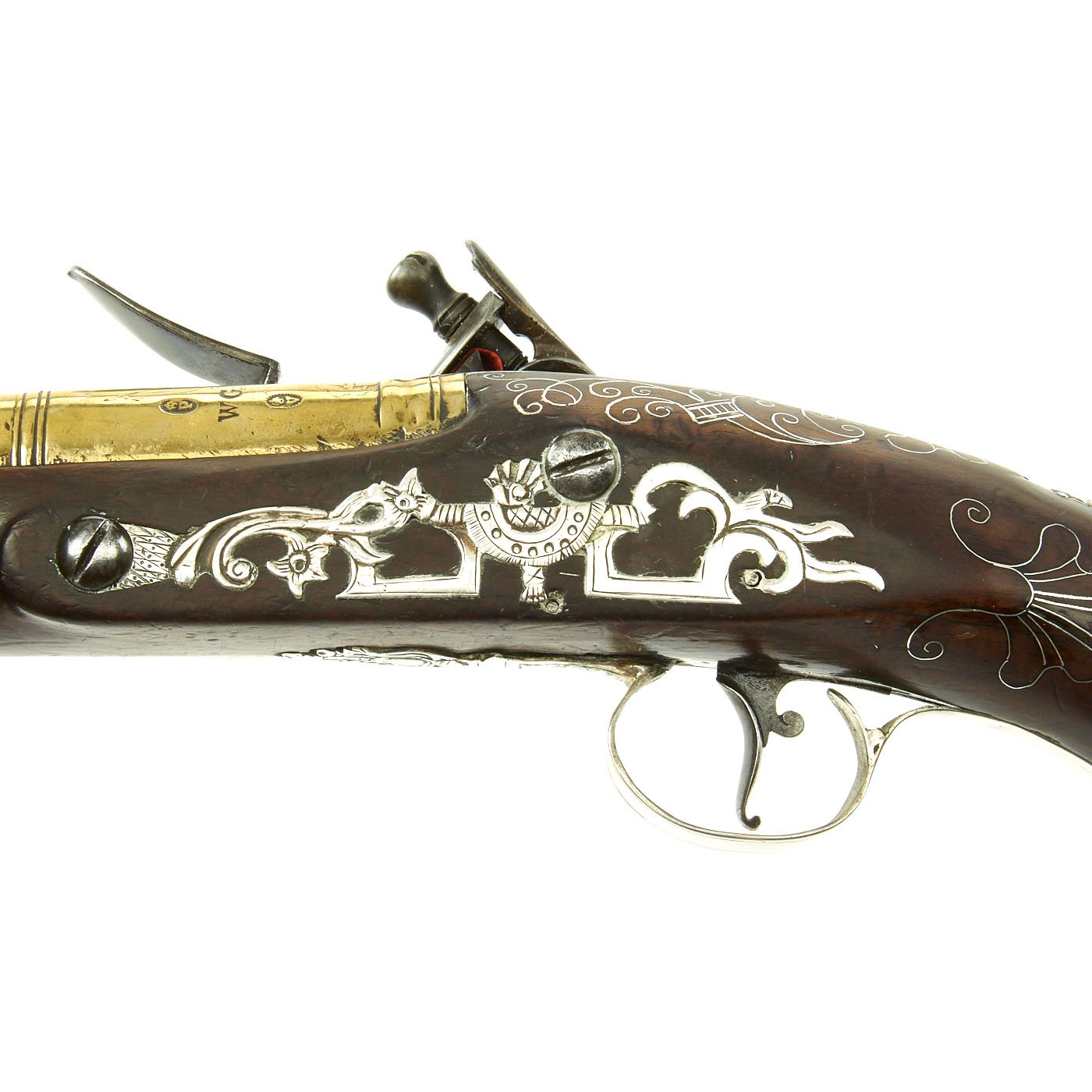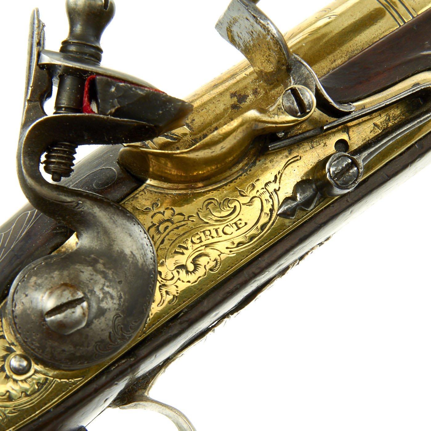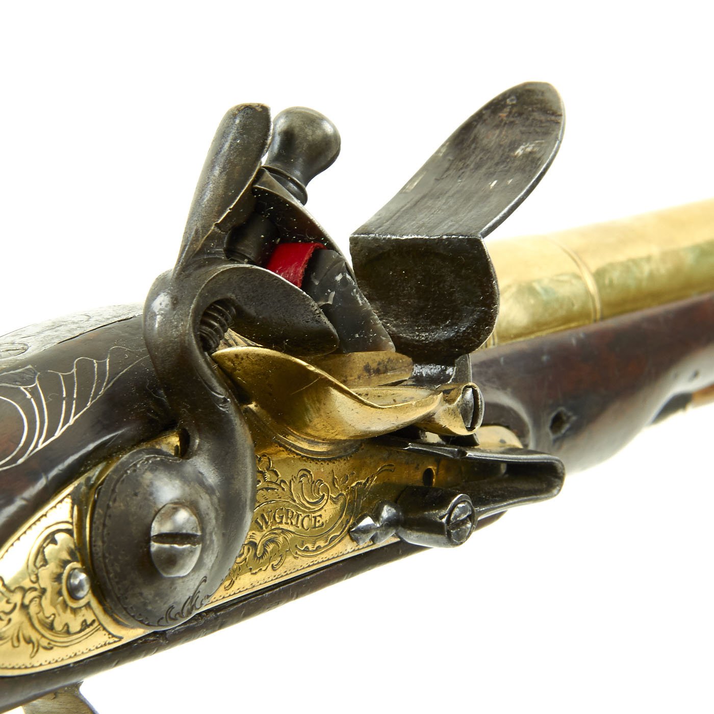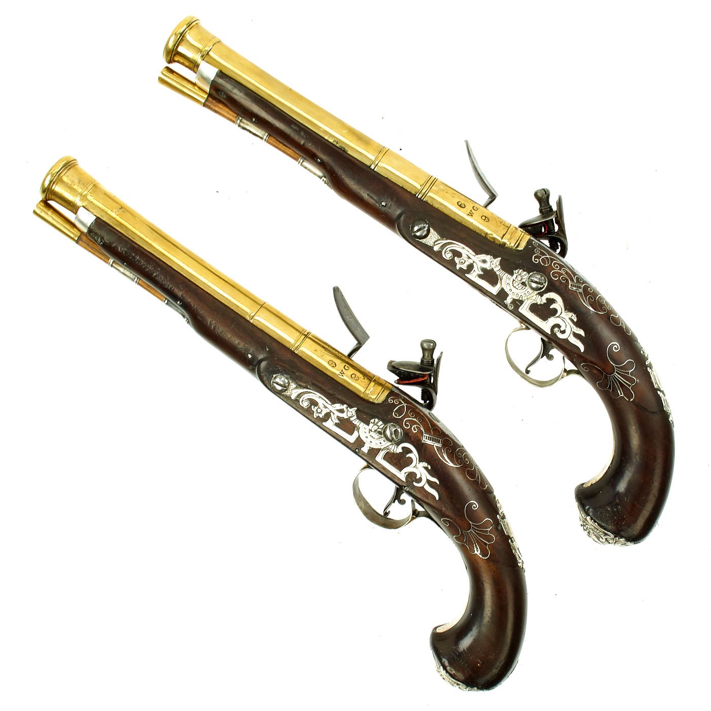 Original Items: One of a Kind Set. This is a lovely pair of French and Indian War (Seven Years' War 1756 - 1763) era Flintlock pistols by WILLIAM GRICE, who worked in London from 1740 to 1780. They are fitted with brass 8 inch barrel Blunderbuss barrels, together with engraved brass lock plates, each marked W. GRICE in an engraved banner. All mountings are sterling silver, including the ornate side plates, and there are hallmarks on the butt caps, though they are not legible. The fine walnut stocks are decorated by intricate silver wire inlay and are quite attractive. The brass barrels are both marked LONDON and WG, with the correct London CROWN / P proof and CROWN / V viewed markings.