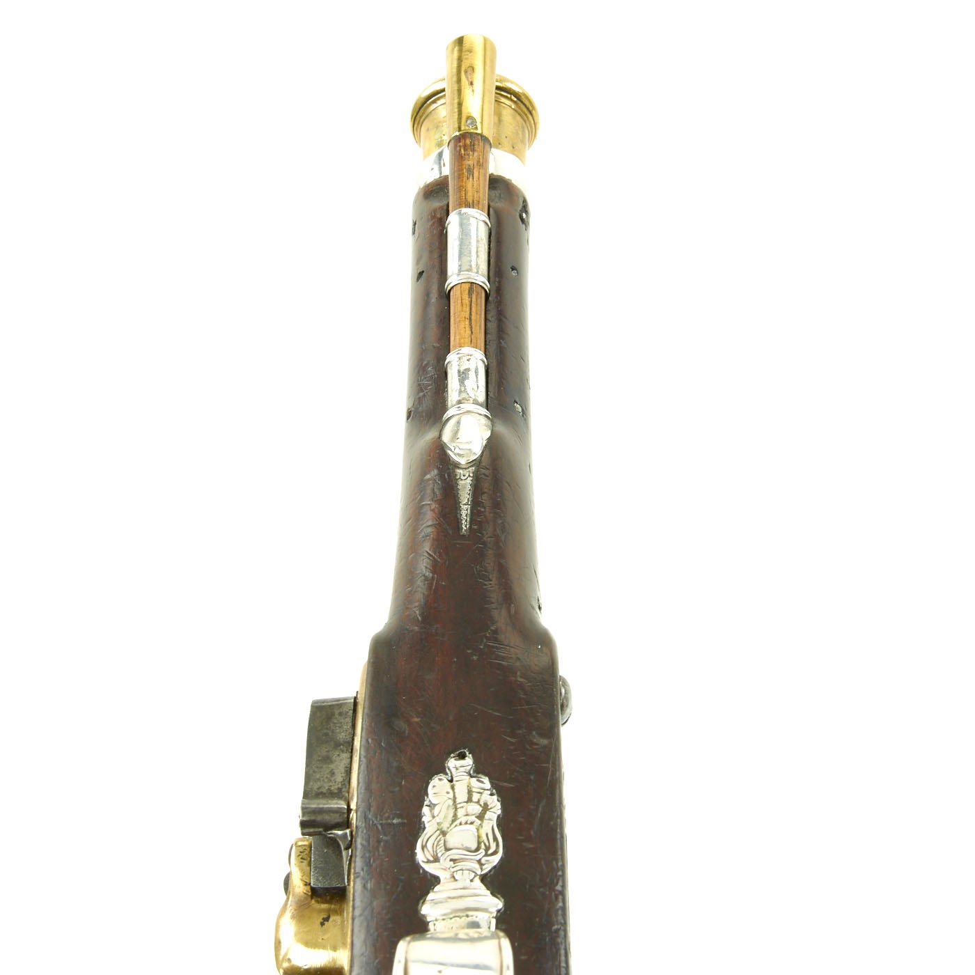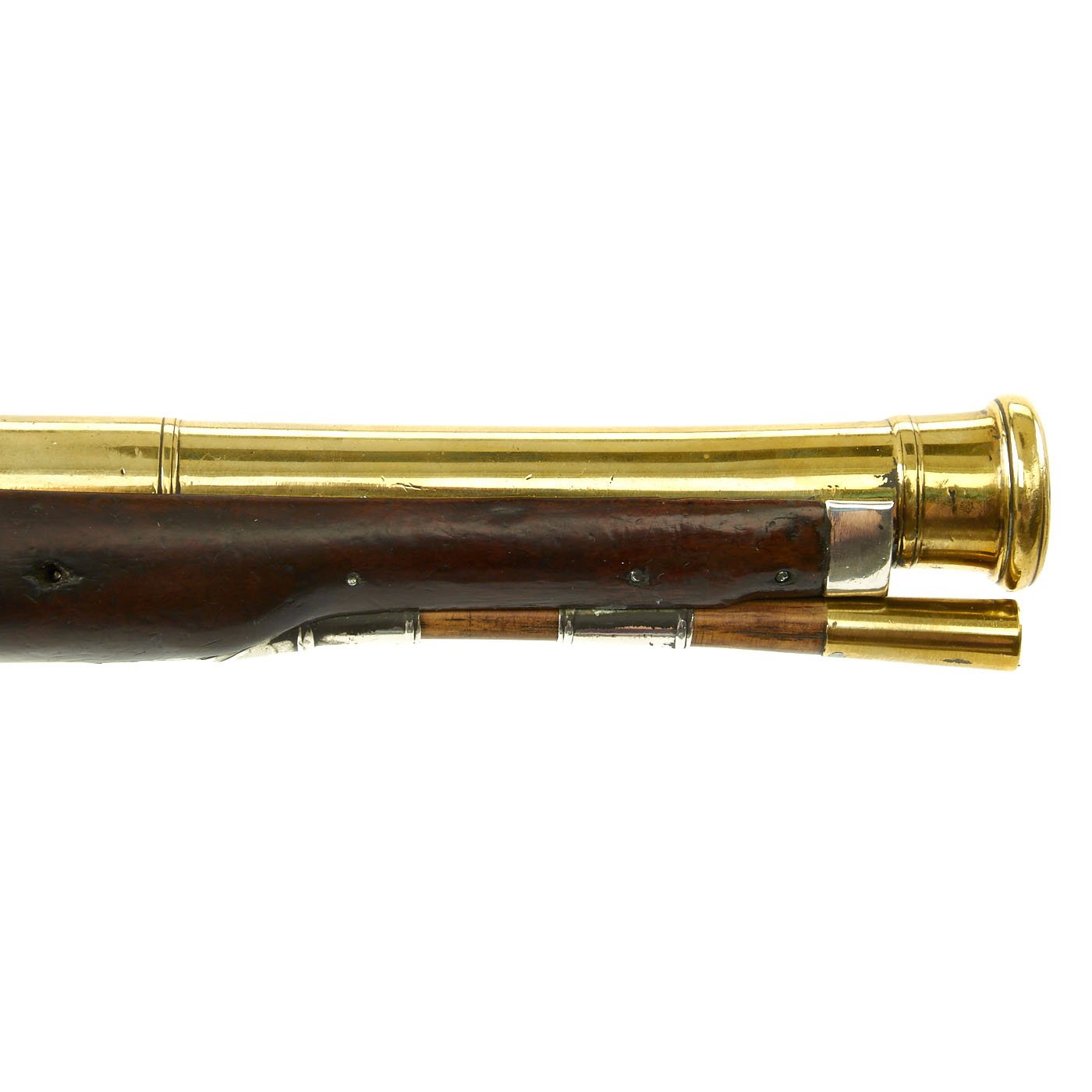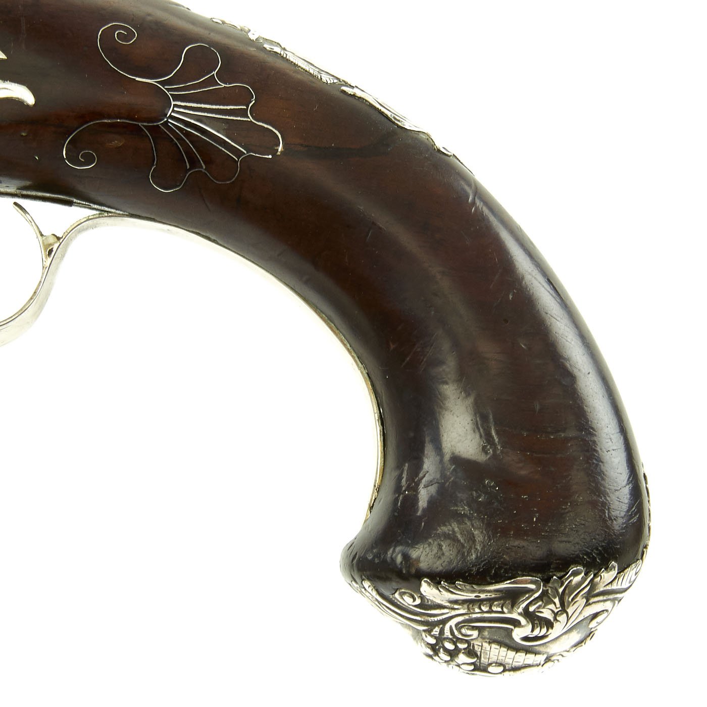 Original Items: One of a Kind Set. This is a lovely pair of French and Indian War (Seven Years' War 1756 - 1763) era Flintlock pistols by WILLIAM GRICE, who worked in London from 1740 to 1780. They are fitted with brass 8 inch barrel Blunderbuss barrels, together with engraved brass lock plates, each marked W. GRICE in an engraved banner. All mountings are sterling silver, including the ornate side plates, and there are hallmarks on the butt caps, though they are not legible. The fine walnut stocks are decorated by intricate silver wire inlay and are quite attractive. The brass barrels are both marked LONDON and WG, with the correct London CROWN / P proof and CROWN / V viewed markings.