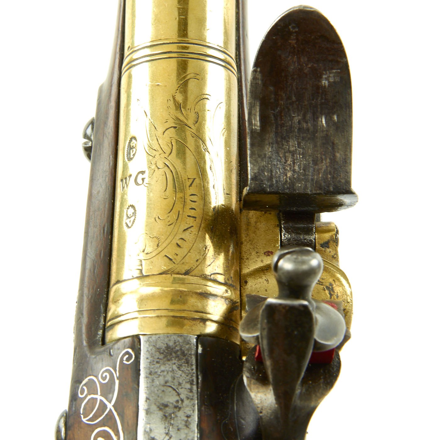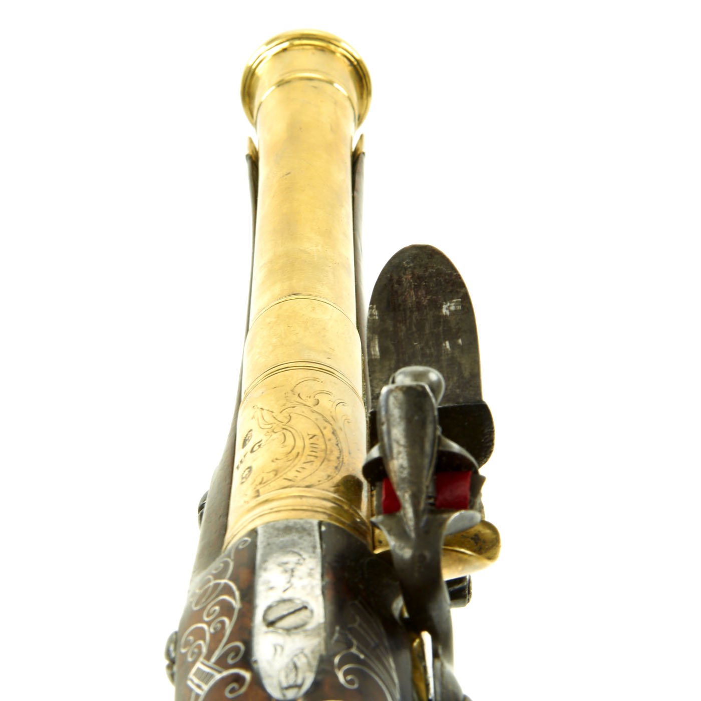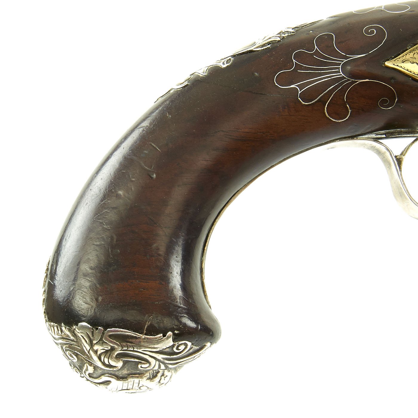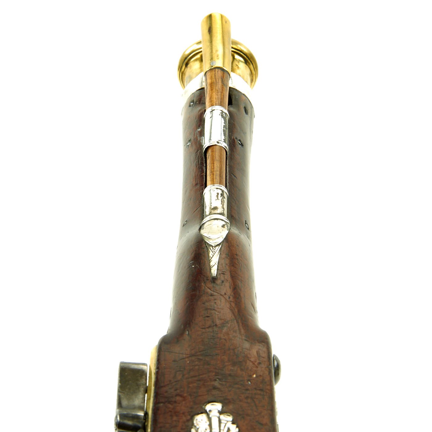 Original Items: One of a Kind Set. This is a lovely pair of French and Indian War (Seven Years' War 1756 - 1763) era Flintlock pistols by WILLIAM GRICE, who worked in London from 1740 to 1780. They are fitted with brass 8 inch barrel Blunderbuss barrels, together with engraved brass lock plates, each marked W. GRICE in an engraved banner. All mountings are sterling silver, including the ornate side plates, and there are hallmarks on the butt caps, though they are not legible. The fine walnut stocks are decorated by intricate silver wire inlay and are quite attractive. The brass barrels are both marked LONDON and WG, with the correct London CROWN / P proof and CROWN / V viewed markings.