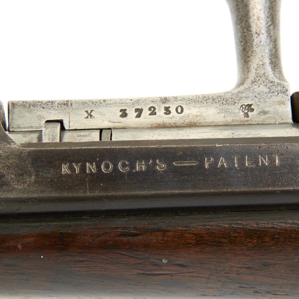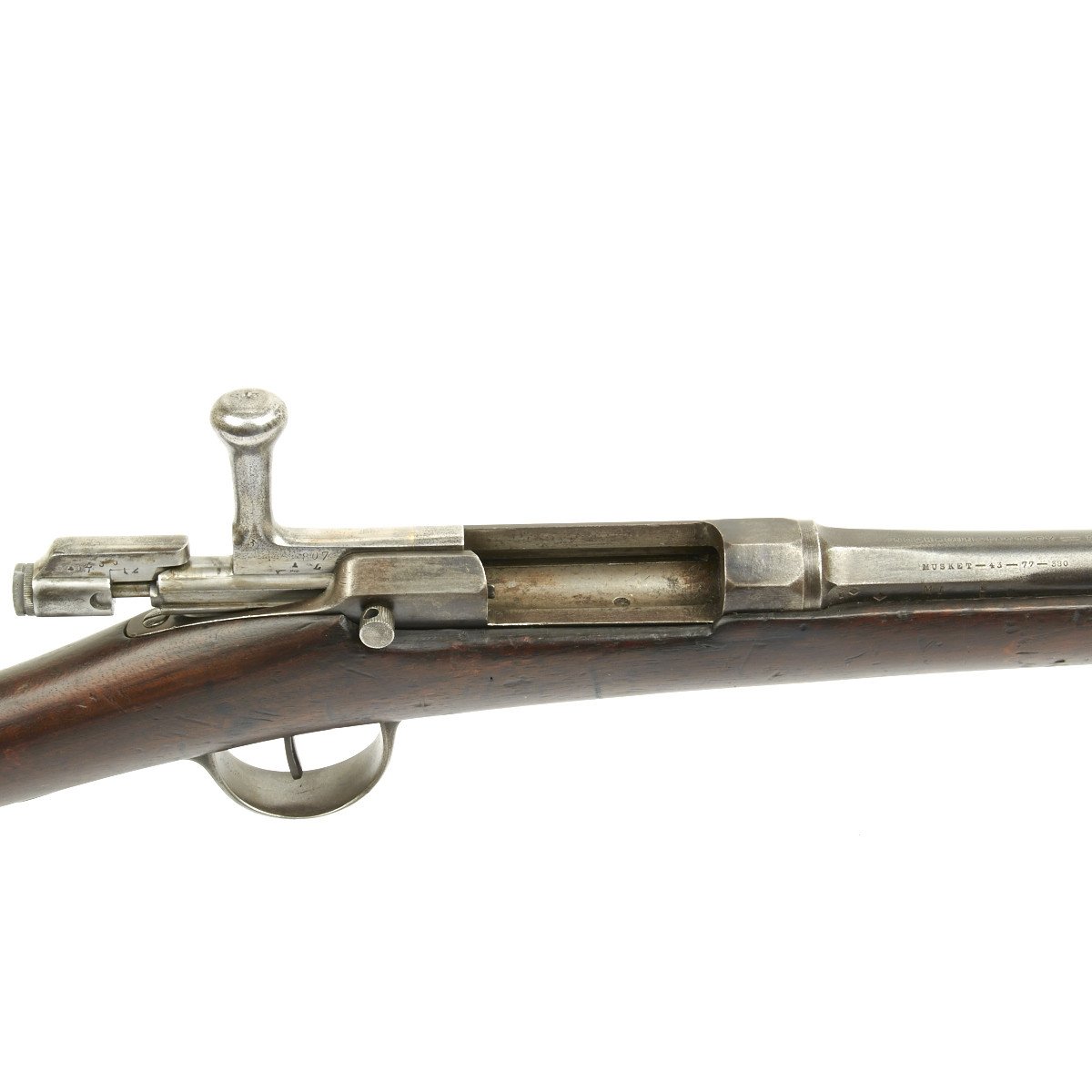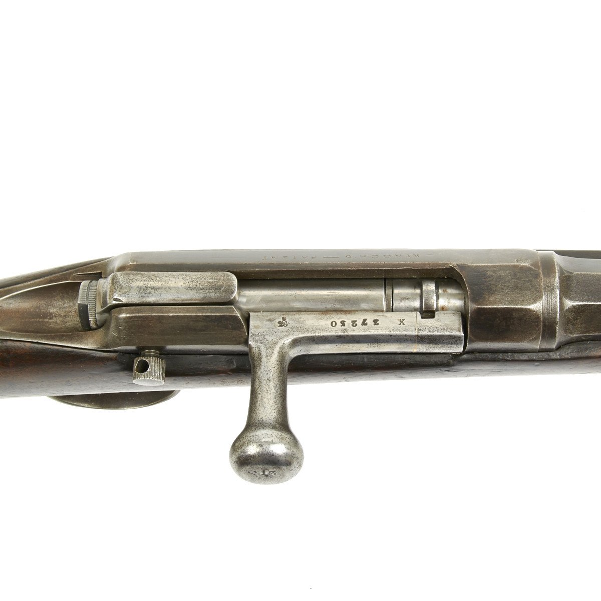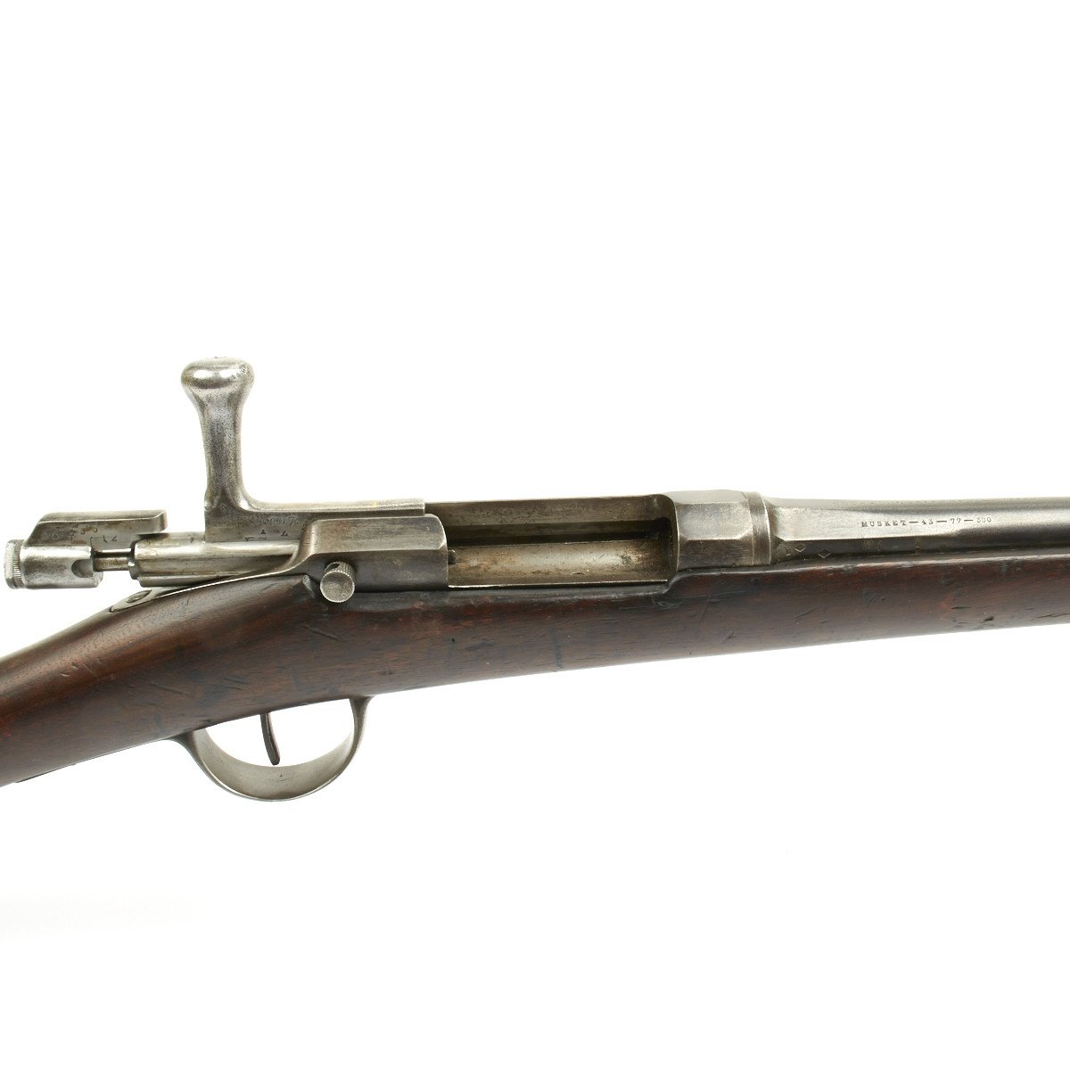 In 1873, France contracted with the Kynoch Gun Factory of Aston, England to modify the existing Chassepot bolt for use with center-fire metallic cartridges. These modified rifles were designated the Chassepot Model 1873 rifle and can be identified by the stampings Musket 43-77-380 and Kynoch - Gun - Factory - Aston on the barrel flats forward of the receiver.