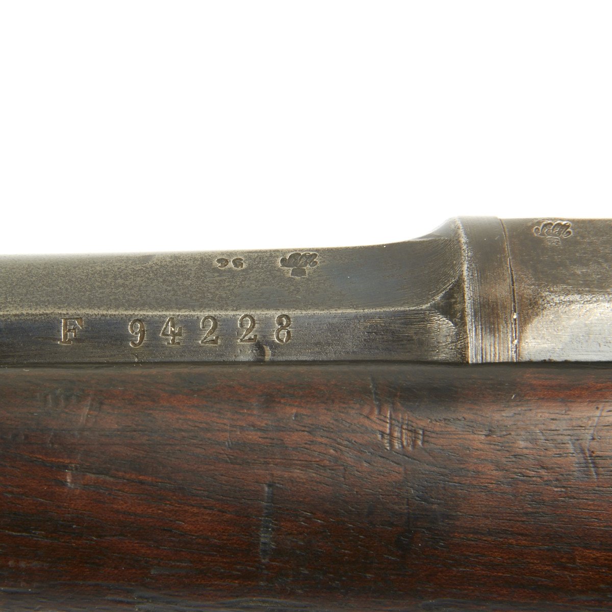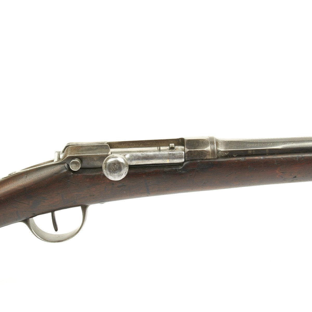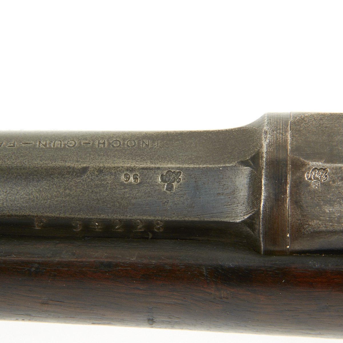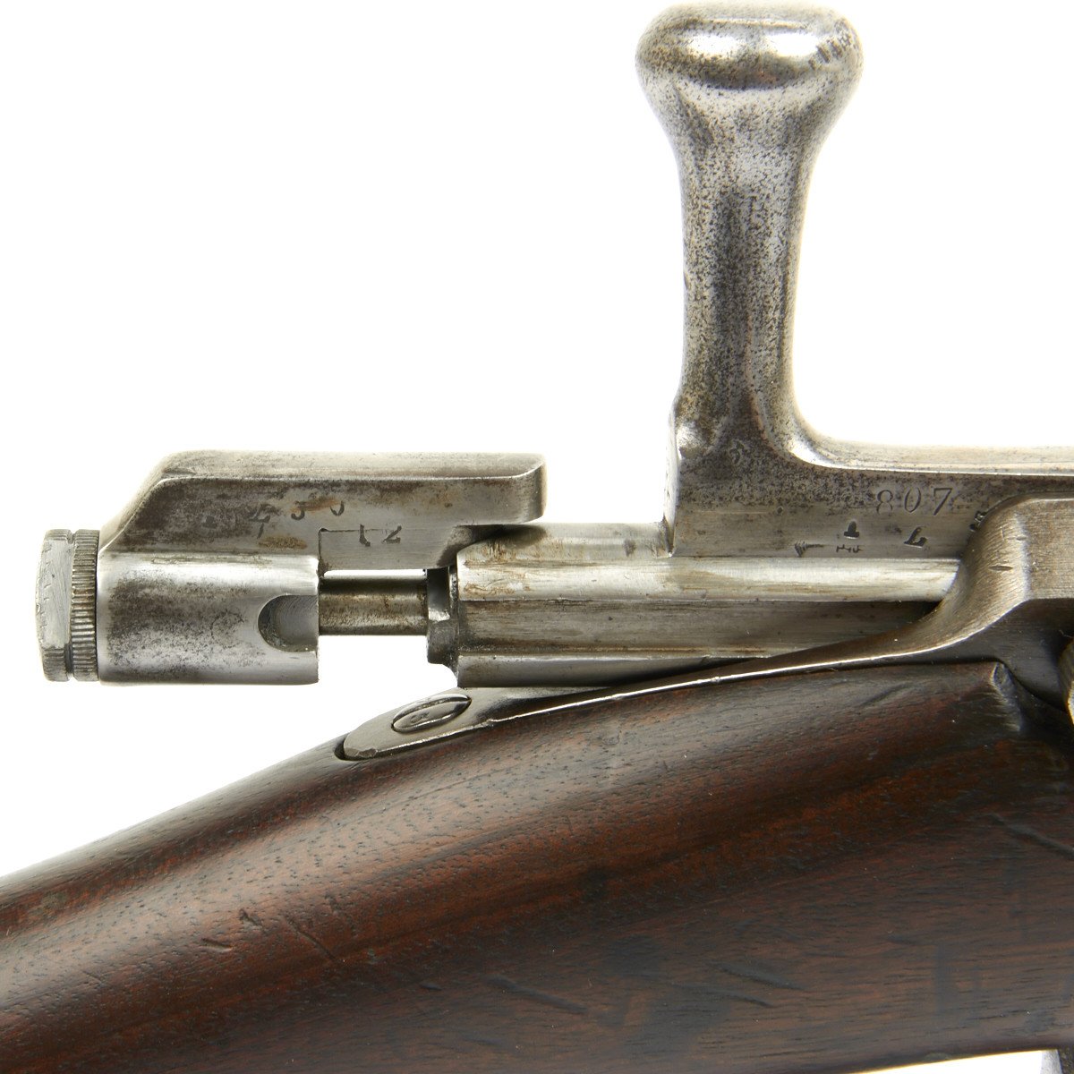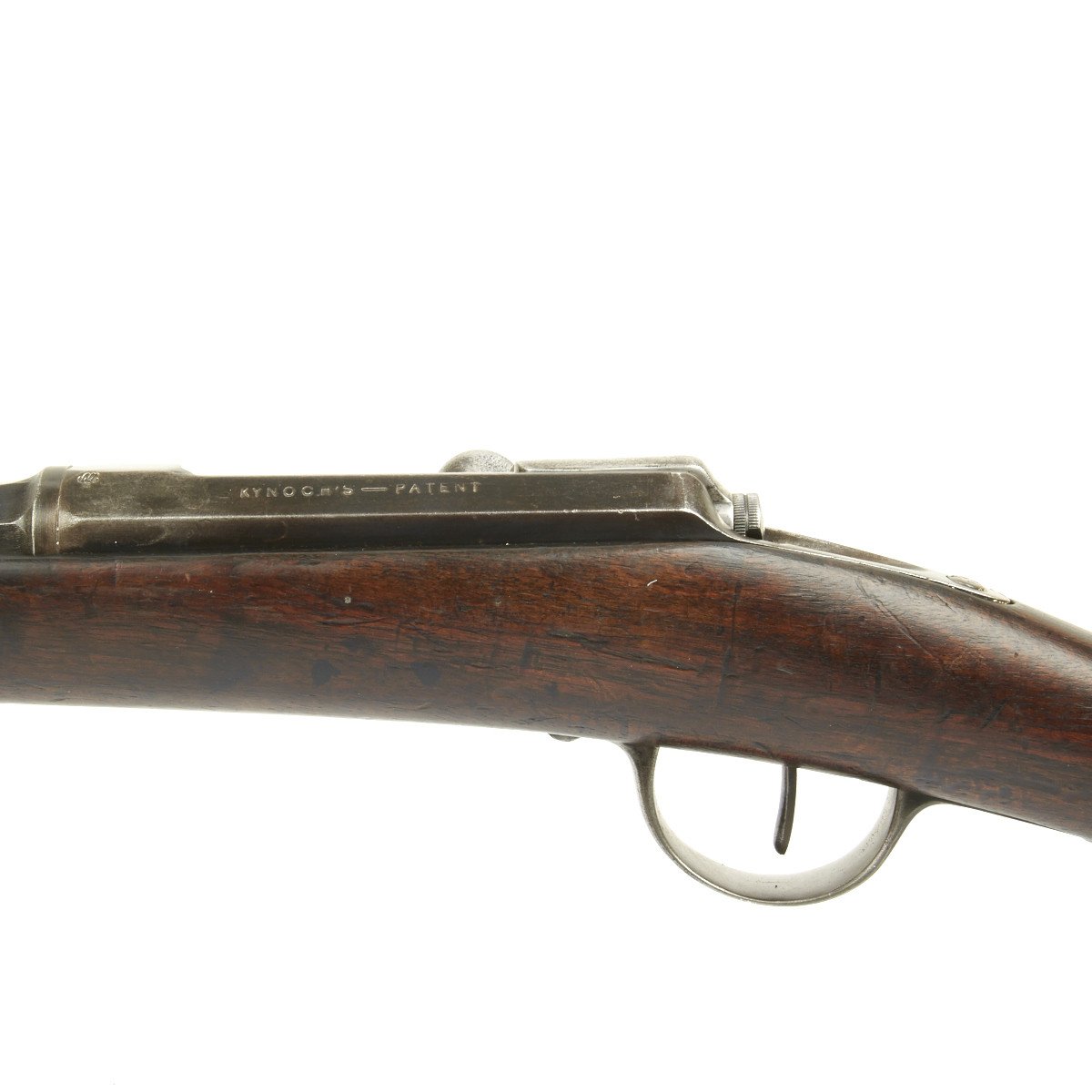 In 1873, France contracted with the Kynoch Gun Factory of Aston, England to modify the existing Chassepot bolt for use with center-fire metallic cartridges. These modified rifles were designated the Chassepot Model 1873 rifle and can be identified by the stampings Musket 43-77-380 and Kynoch - Gun - Factory - Aston on the barrel flats forward of the receiver.