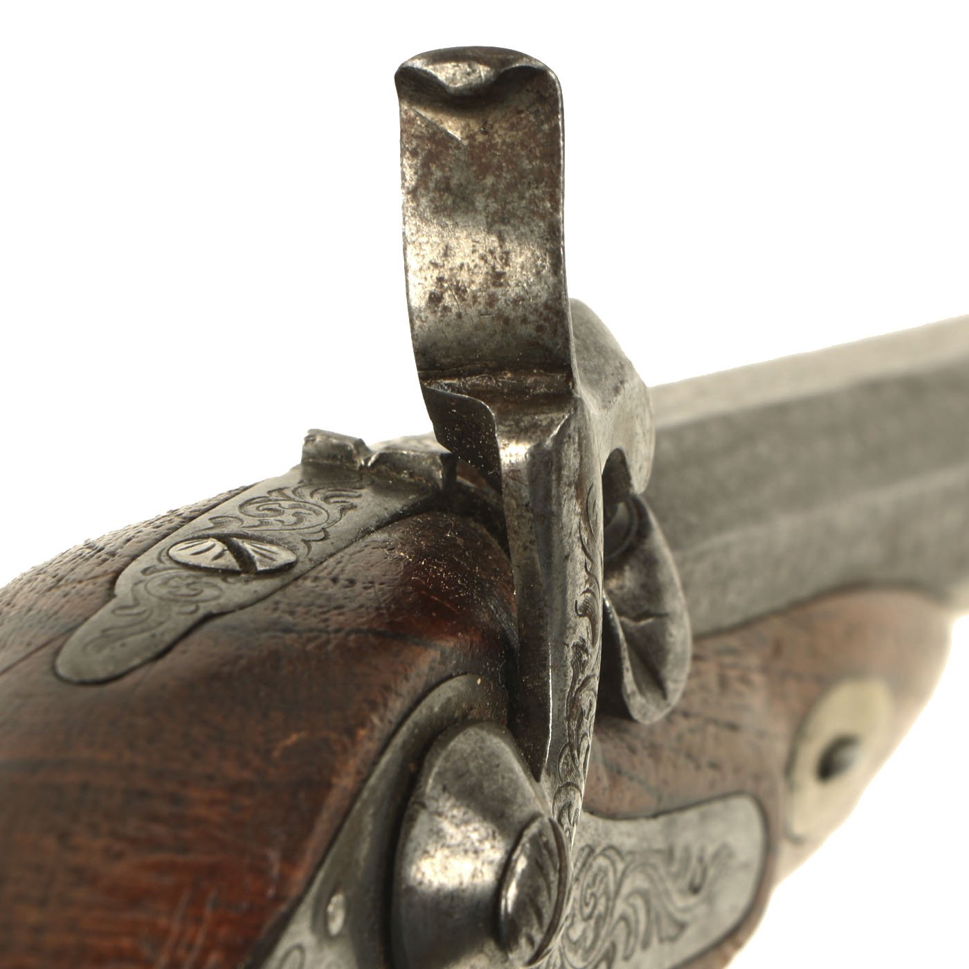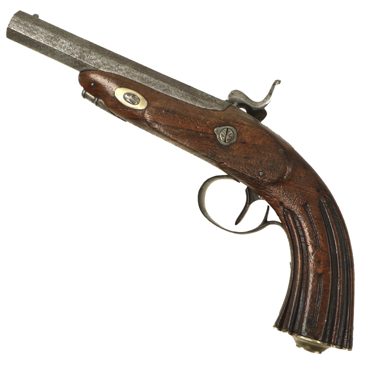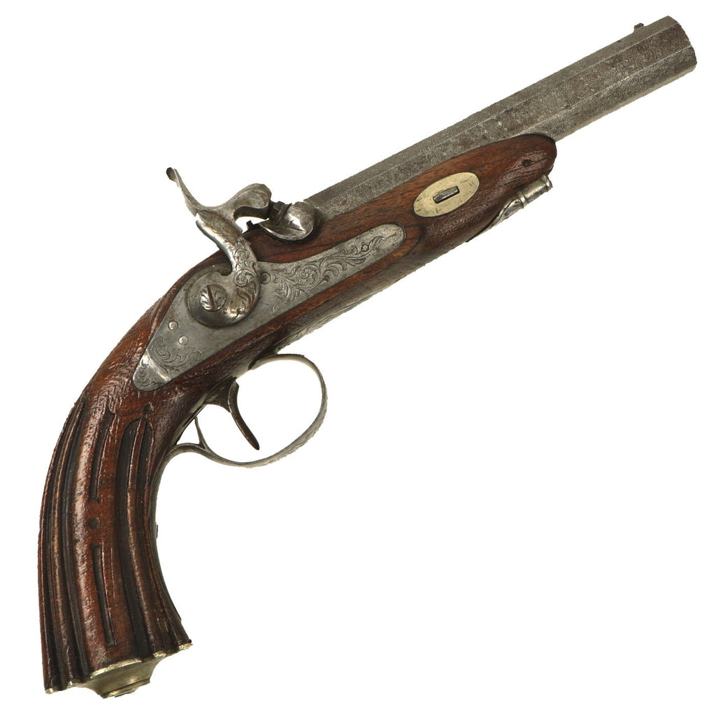 Original Item: Only One Available. This is a very nice example of a mid 19th Century French Continental style percussion pistol, most likely made in Liège, Belgium. The pistol features a 5 1/2inch octagonal barrel, which has had texture added to the outside to give the look of "Damascus" steel. Close examination shows that it is just a simple pattern repeated over and over. The left side of the barrel is marked with the E / L G / * in an oval proof mark of Liège, Belgium.