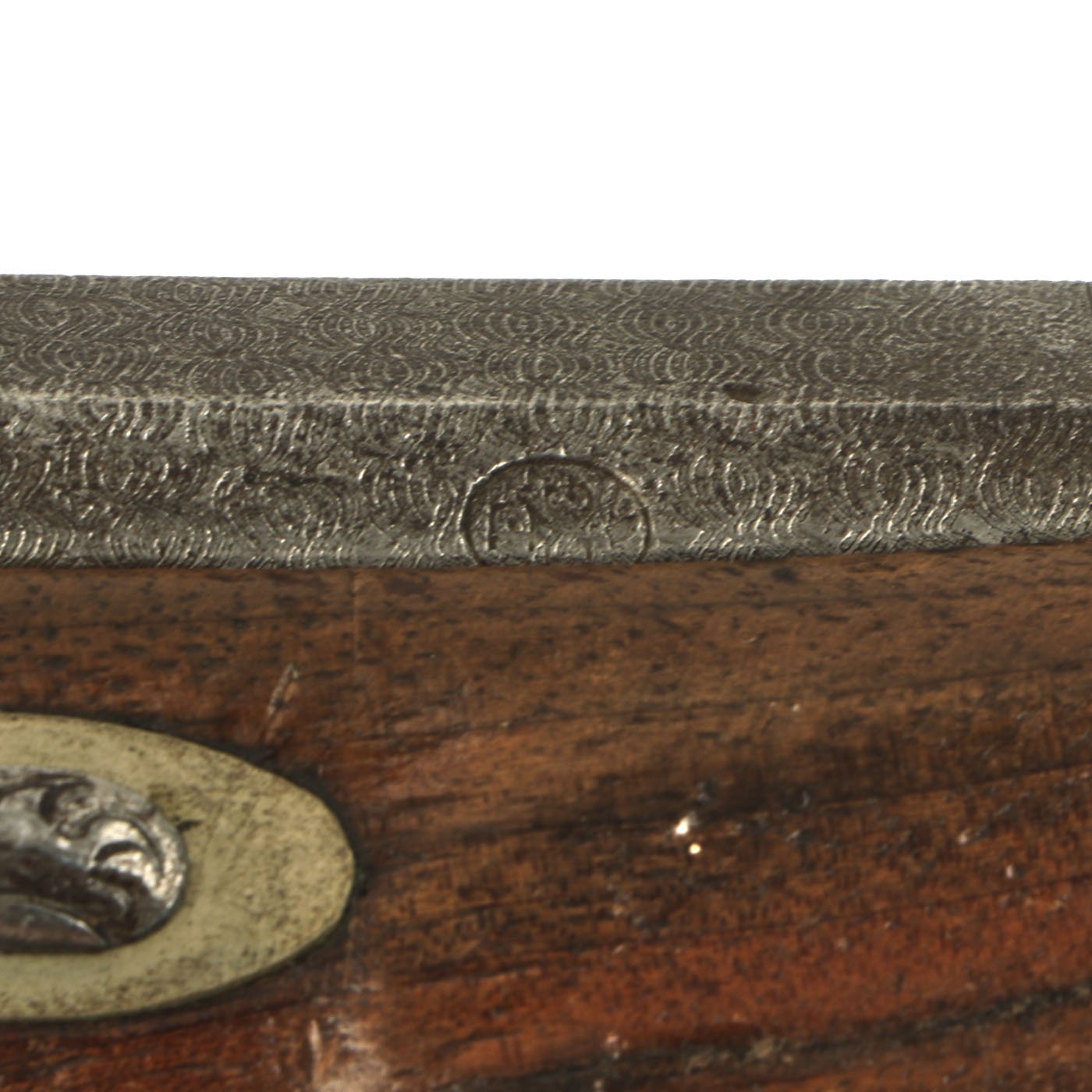 It has fine walnut wood stock which has a French style "Fluted" grip with a butt cap. It is equipped with mostly nickel silver mounts, though the ramrod pipe and trigger guard are steel. All of the fittings are nicely engraved, giving the pistol a great look. It has a nice .53" caliber octagonal barrel, a very popular style at the time. We checked out the lock, and it functions correctly, holding at half cock and firing at full. The original ramrod is unfortunately missing.