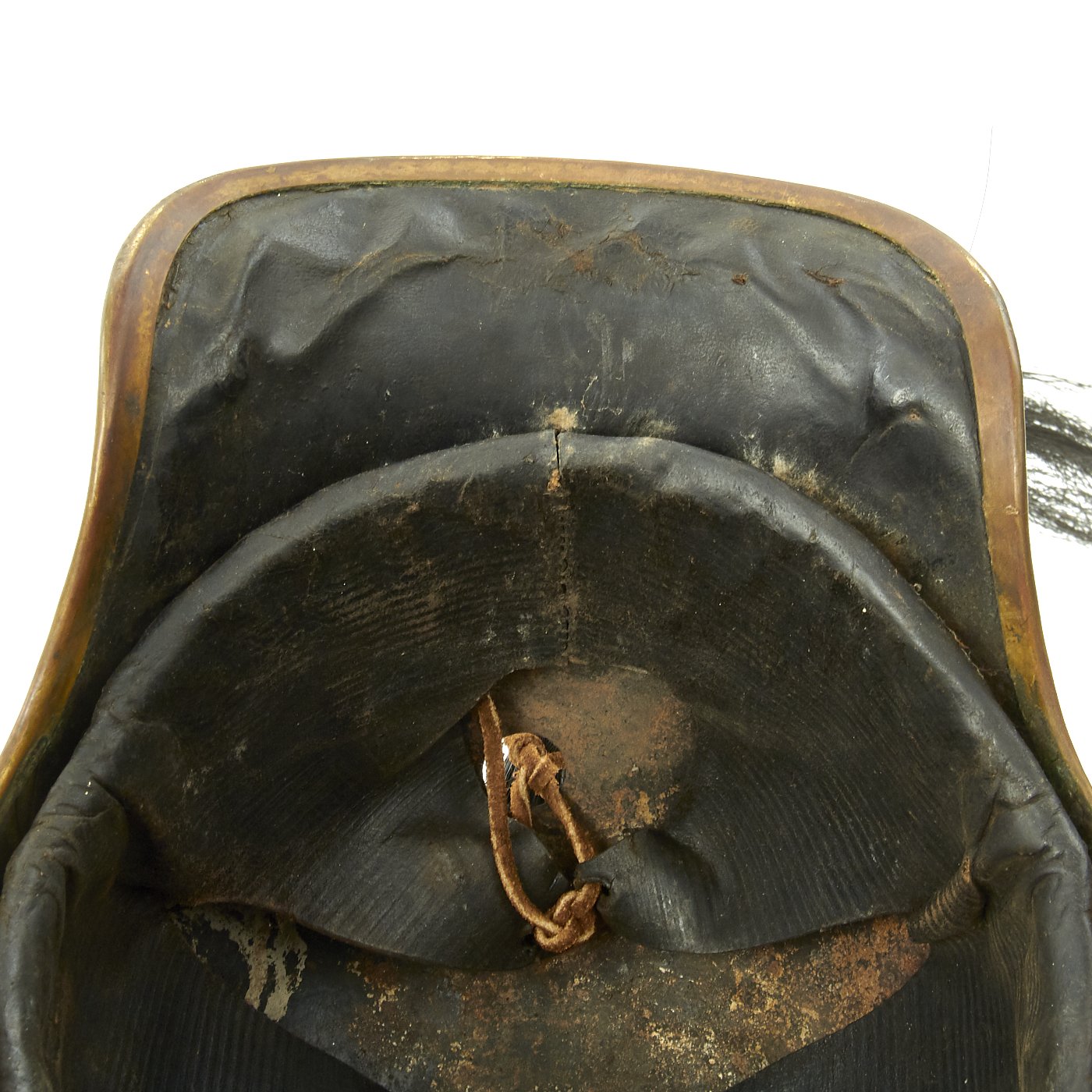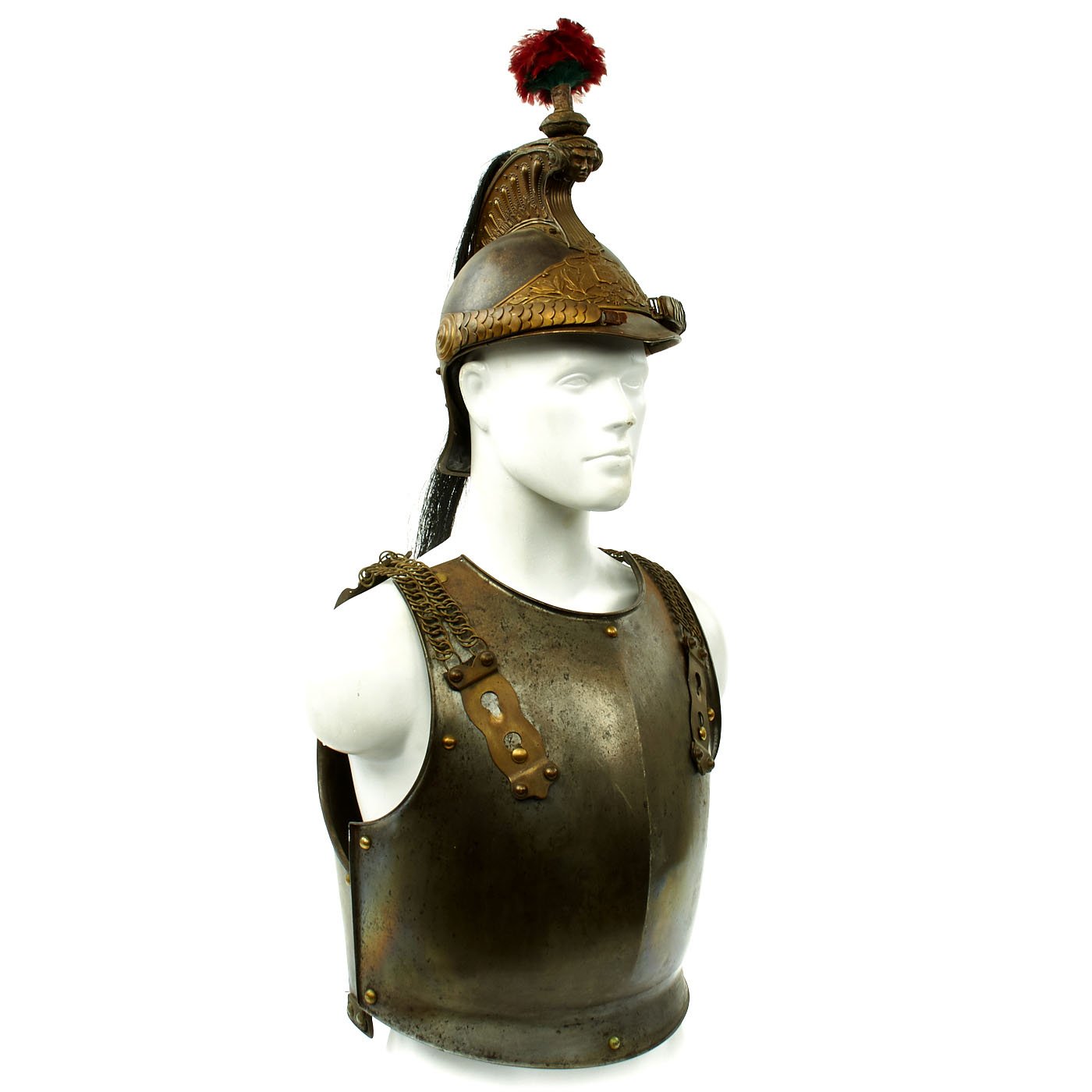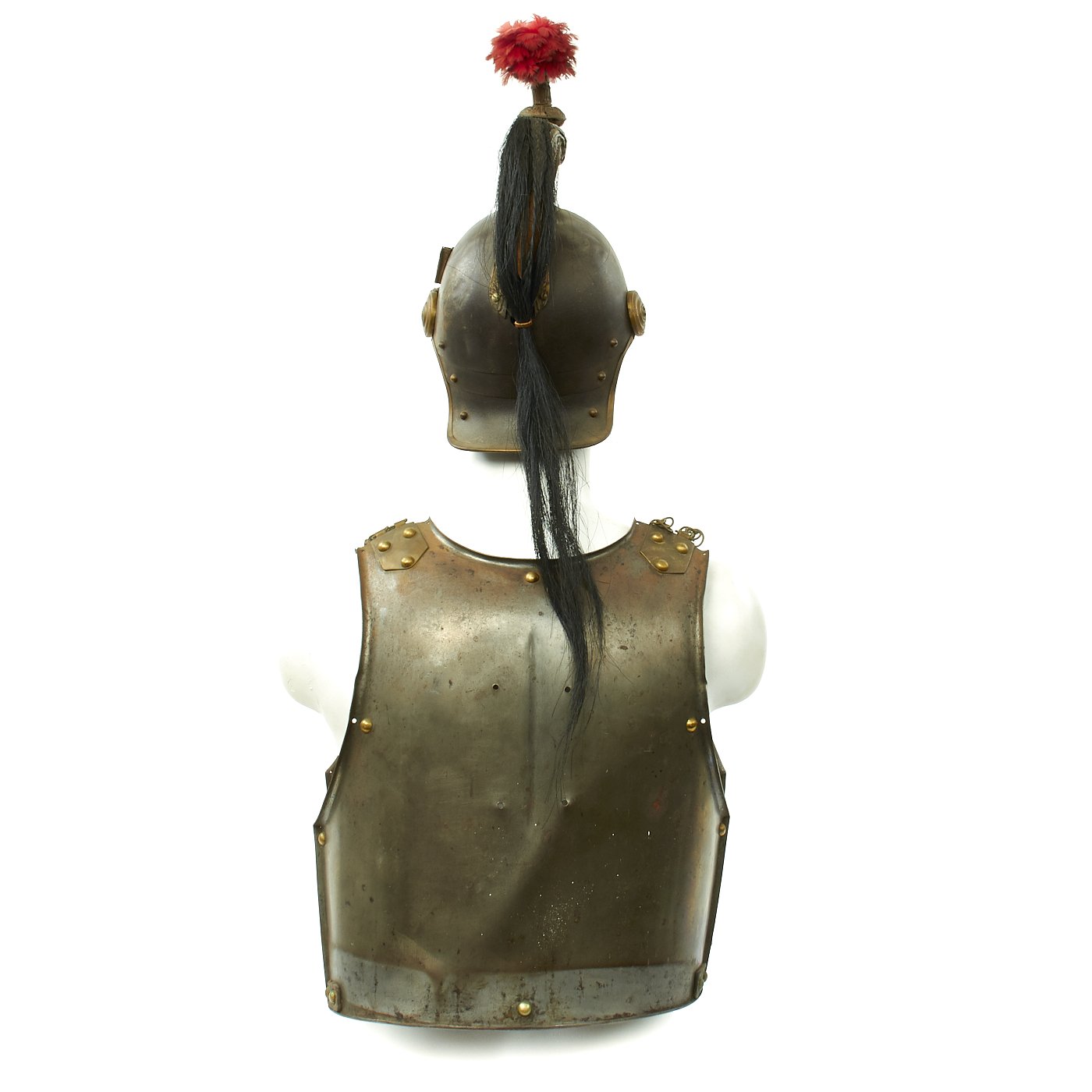 Original Item. Only One Set Available. This has comes right out of the attic and has not been cleaned or restored in any way. It is a French Heavy Cavalry (CUIRASSIER) Armor set of front and back plate connected by over the shoulder brass chain shoulder straps. It comes with a Cuirassier's correct brass mounted steel helmet with red feather plume and black Horse tail hanging down the back of the Trooper. It is all very impressive.