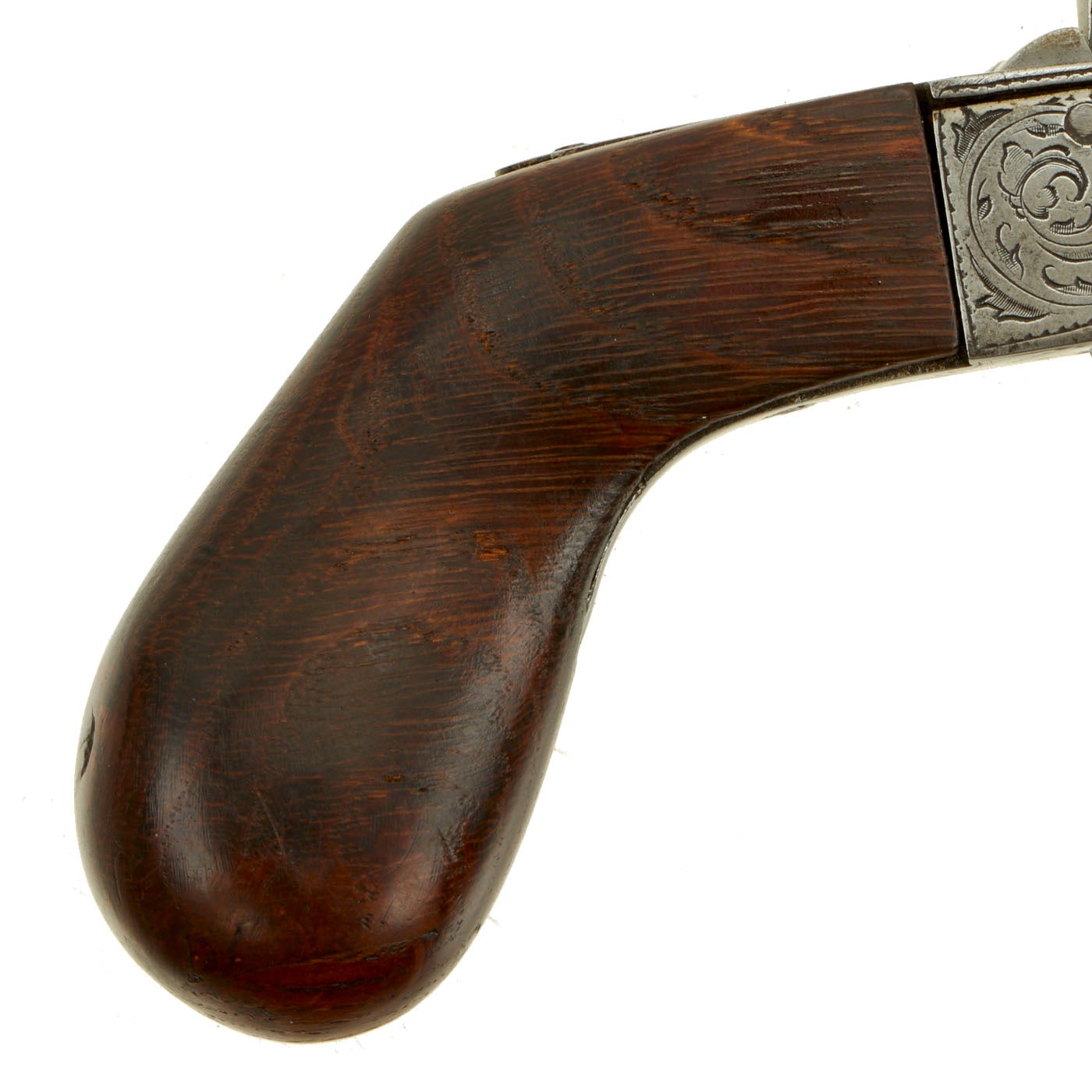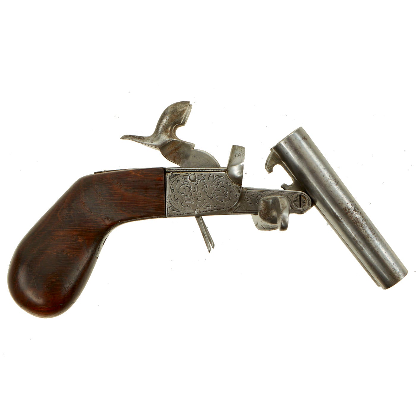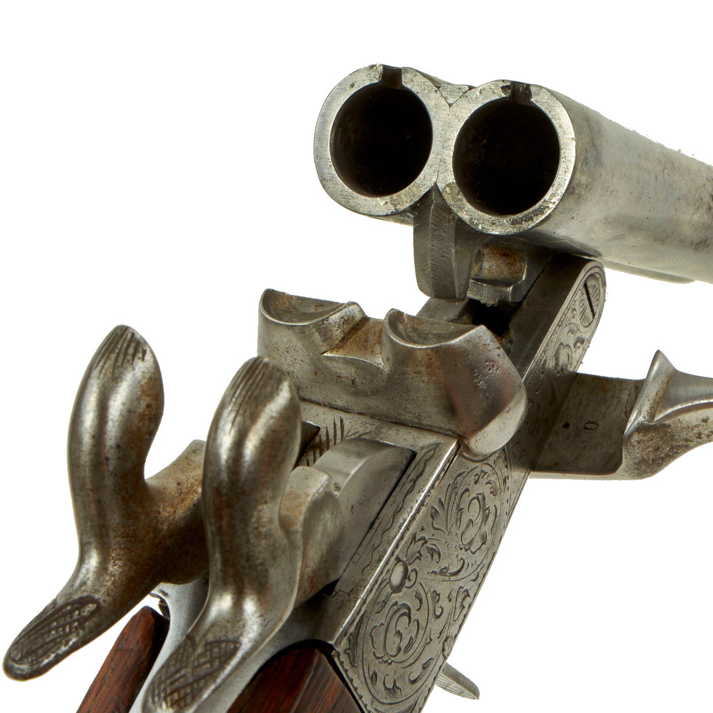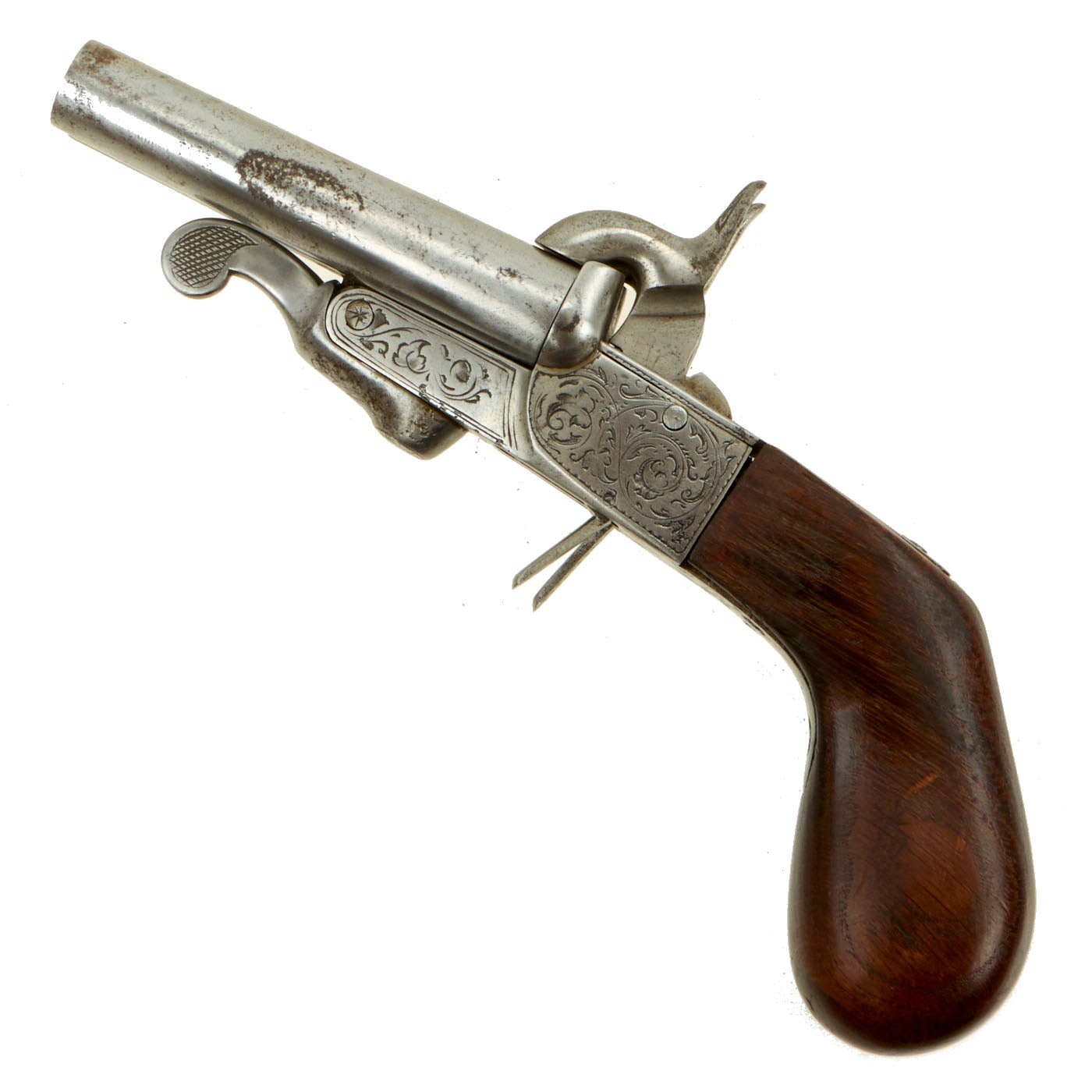 Original item. Only One Available. This is a very nice French style double barrel pinfire pistol, made by well-known maker Paul Berjat. When this was produced around 1855, the "NEW" French "Pinfire" cartridge had just been introduced, which featured a pin extending from the rear side of the cartridge that when depressed discharged the round. These were imported in some numbers for use during the U.S. Civil war. However, the firing system was never as popular as might have been expected and by 1870 quite obsolete.
