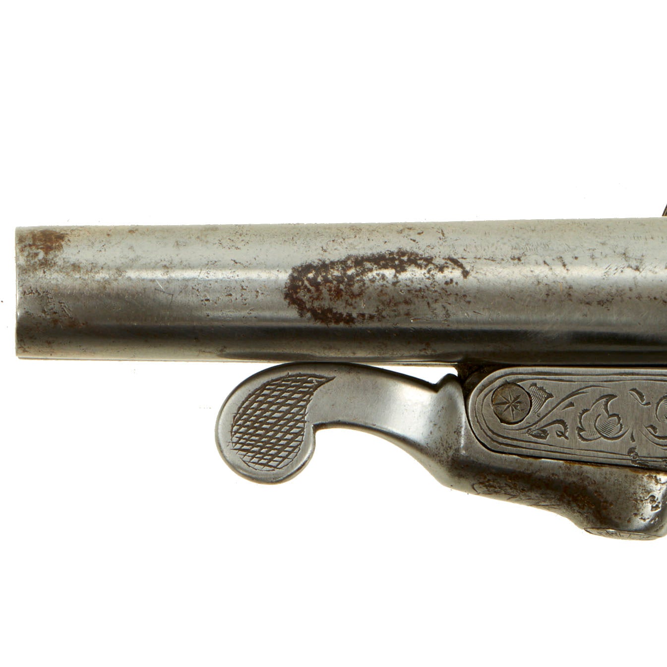 This example measures 7 1/2" in overall length with 3" barrels. The steel frame is fully engraved with foliate and floral designs, with more on the lever that breaks open the action. It features two side by side heavily rifled barrels of about 11mm caliber. Pushing the left side release button allows the barrel to tip up, putting the two pinfire chambers into the reloading position.