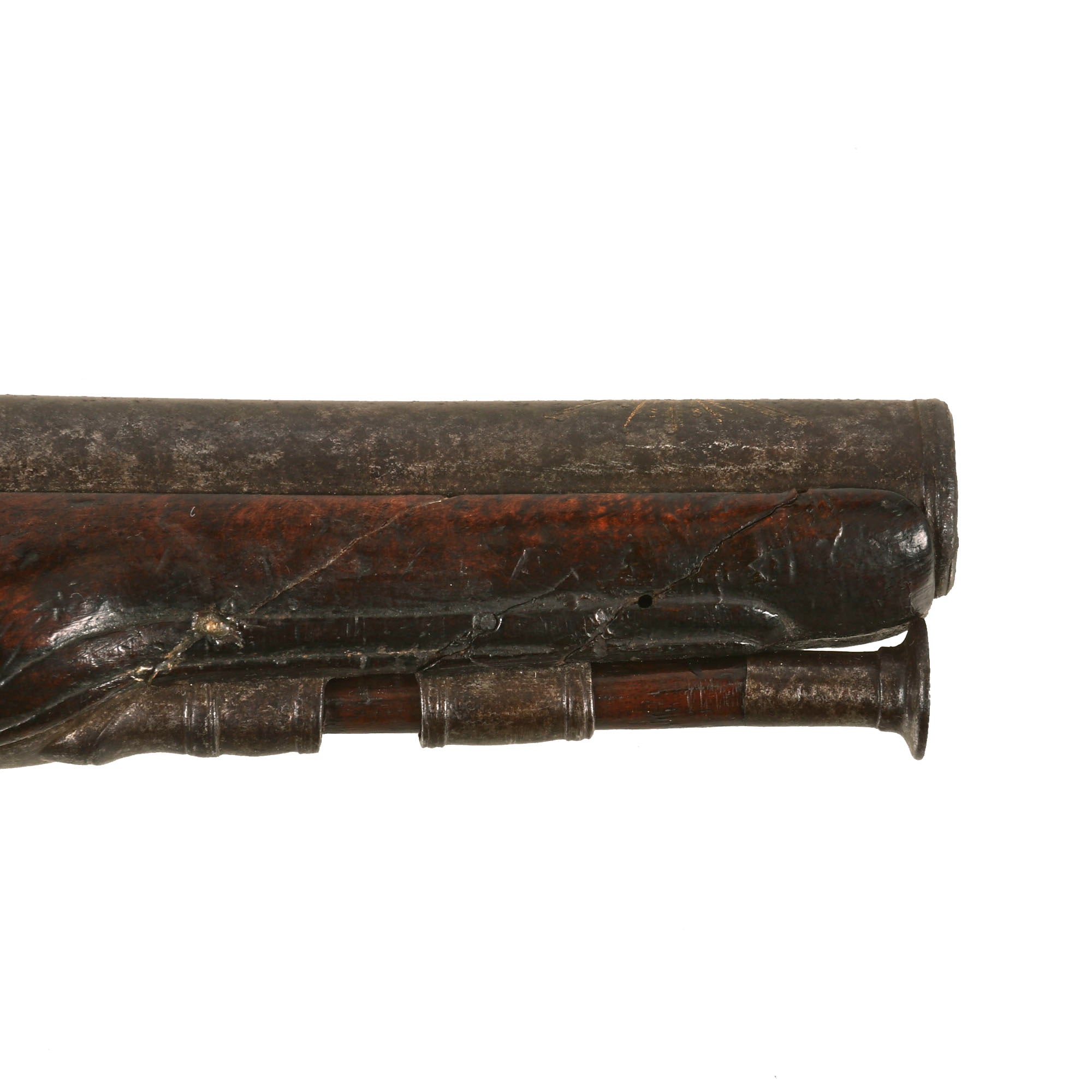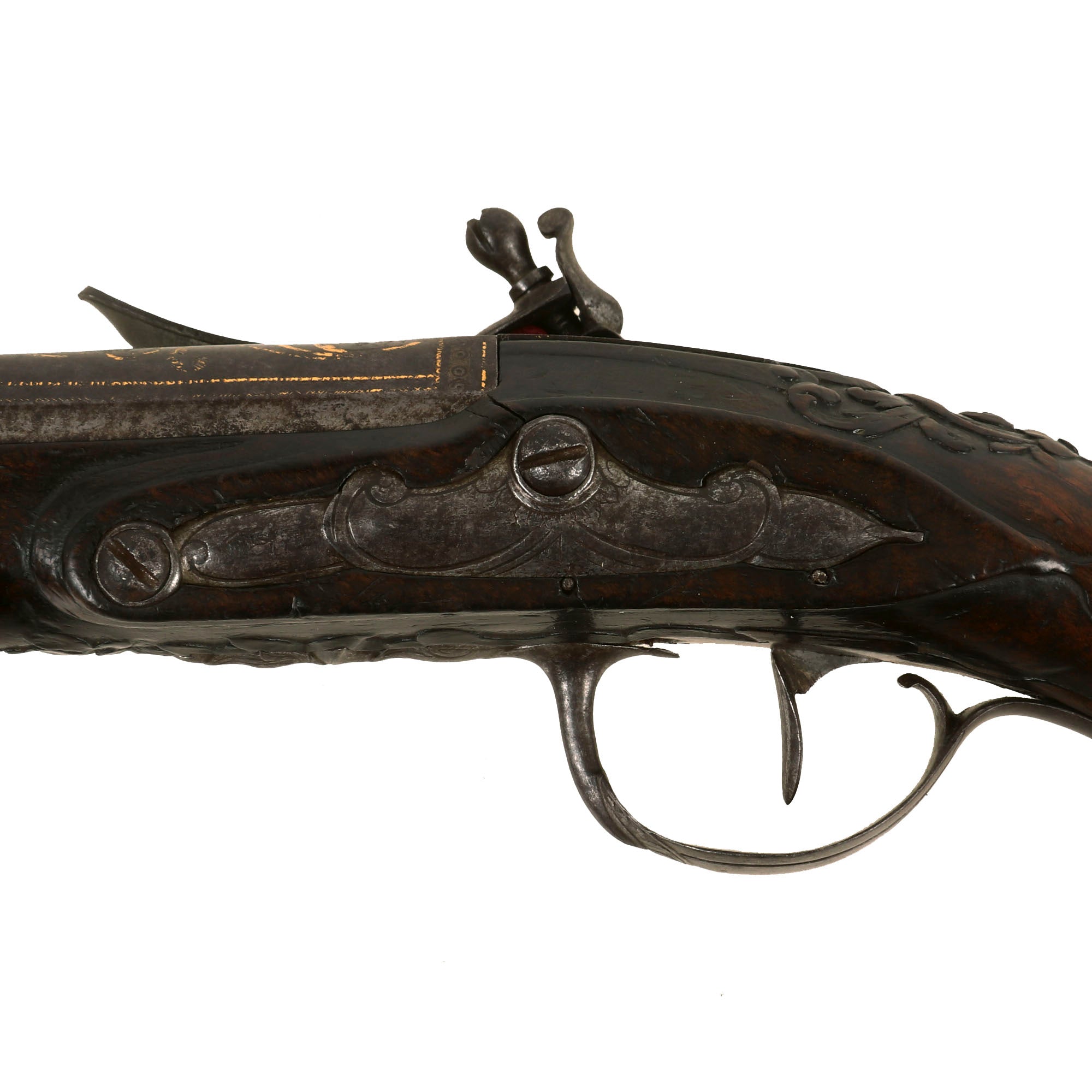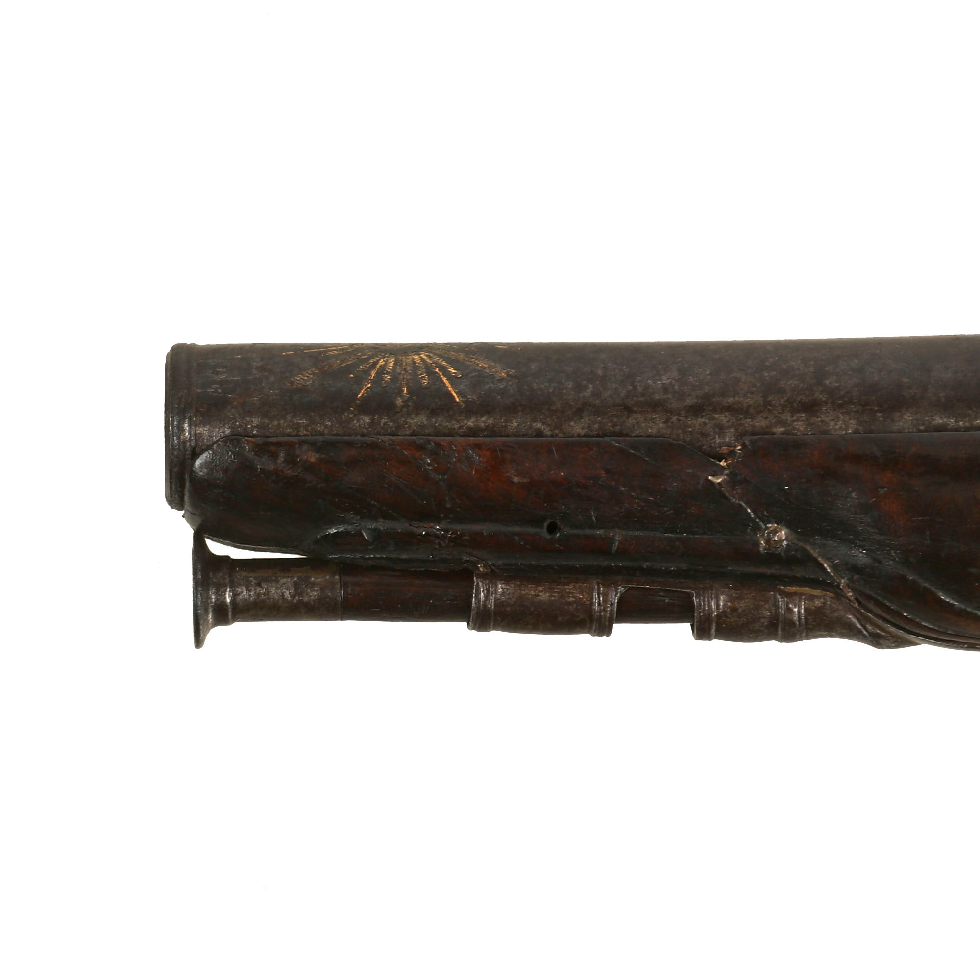 Condition is very nice, showing wear from age and use, and shows a lovely aged patina on the metalwork, making the gold easier to see on the barrel. The wood stock is in very good shape, though there are some repaired splits on the fore stock near the muzzle, as we often see on these older pistols. The lock is fully functional, holding at half cock and firing at full.