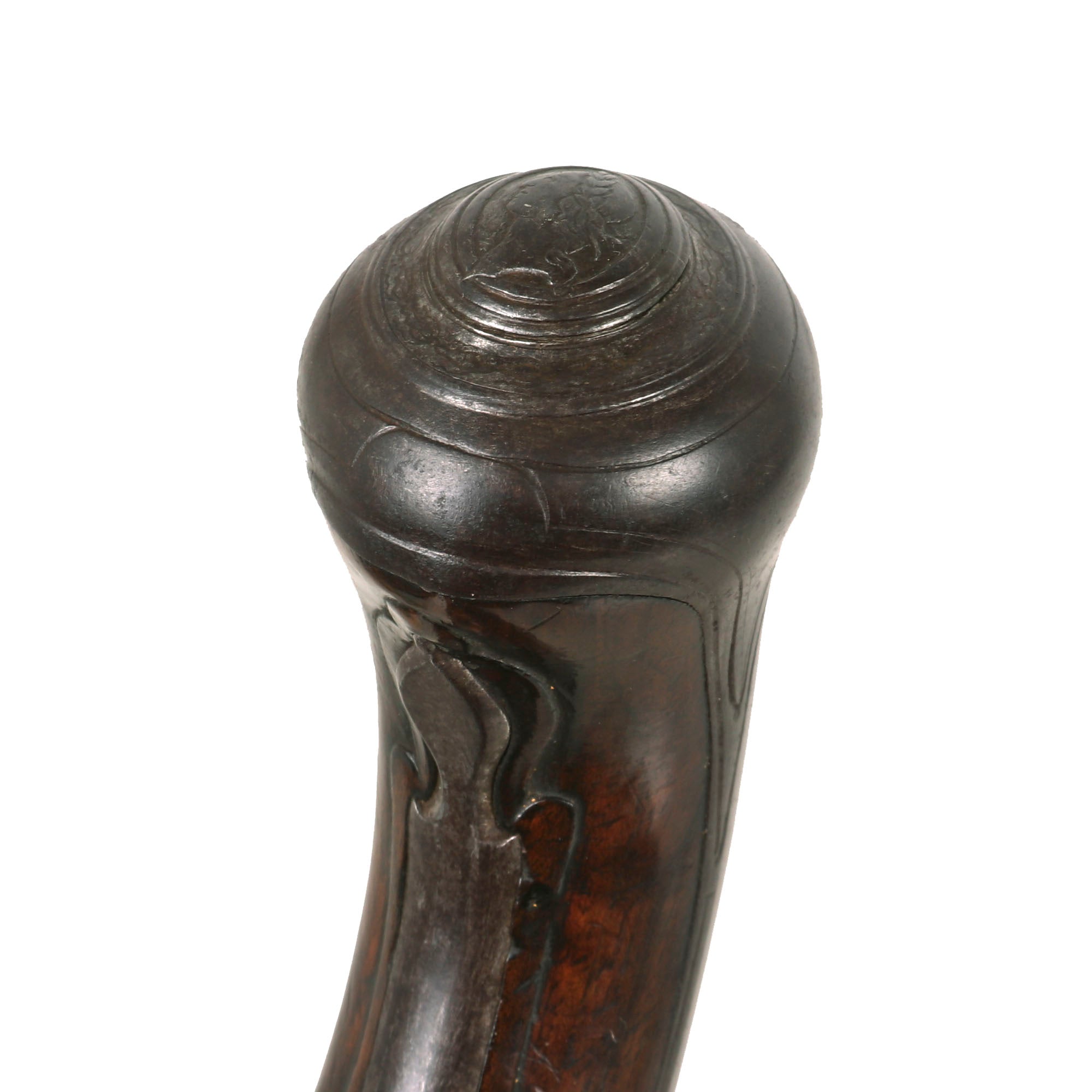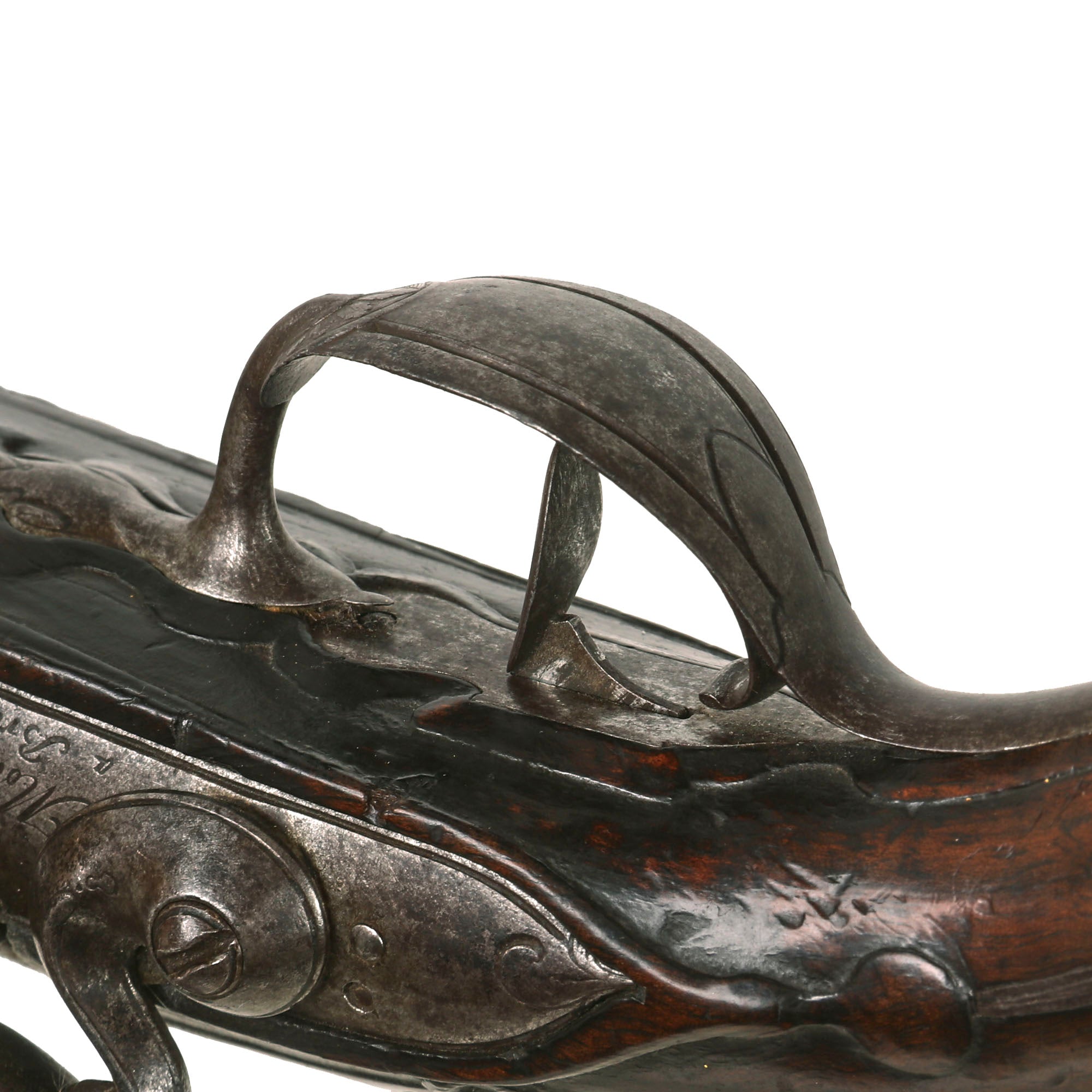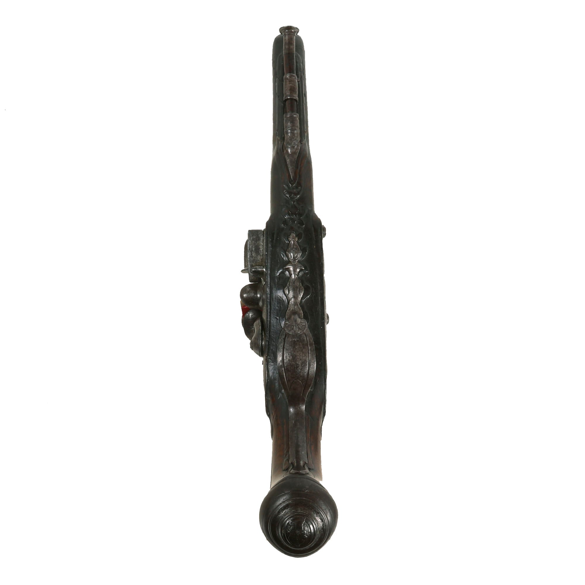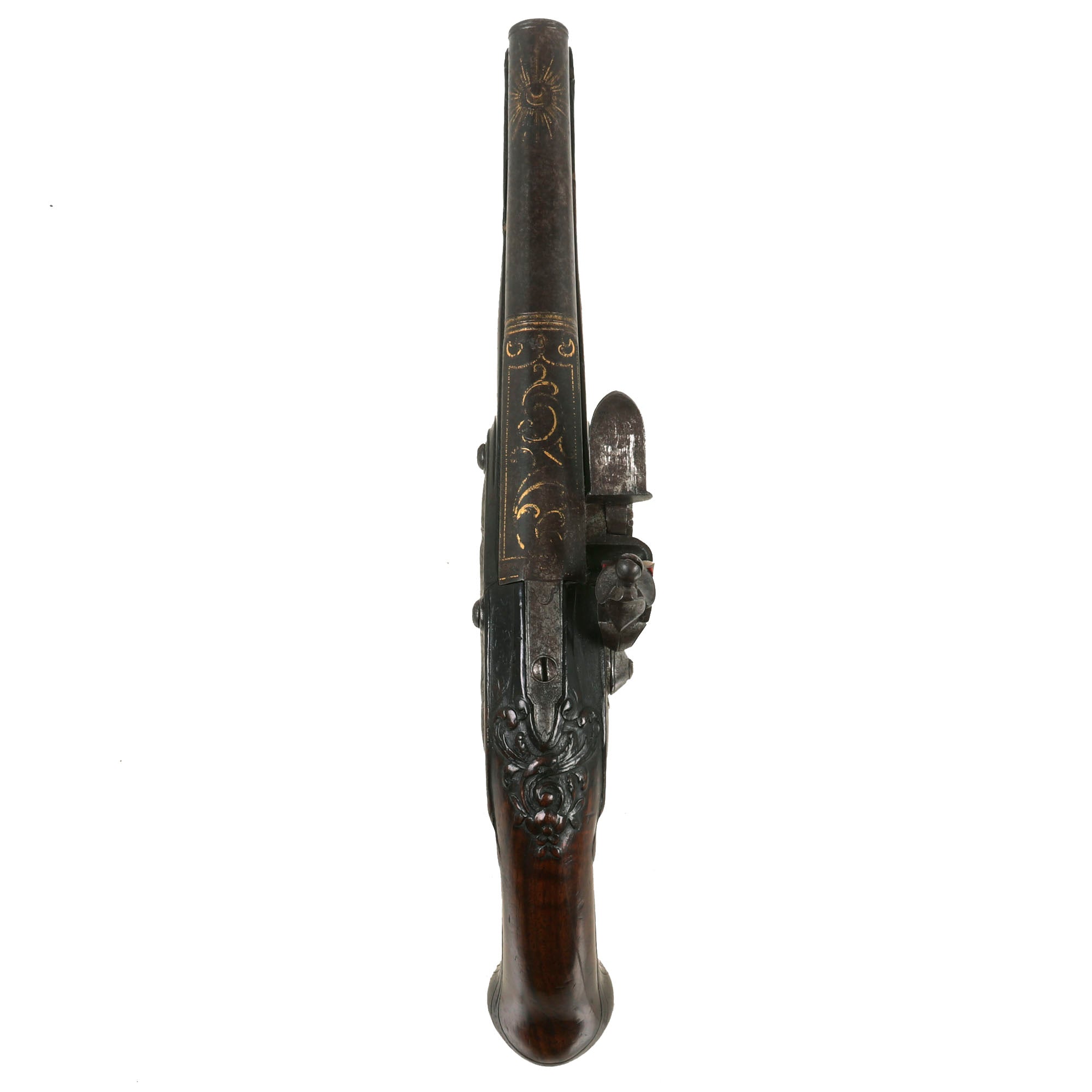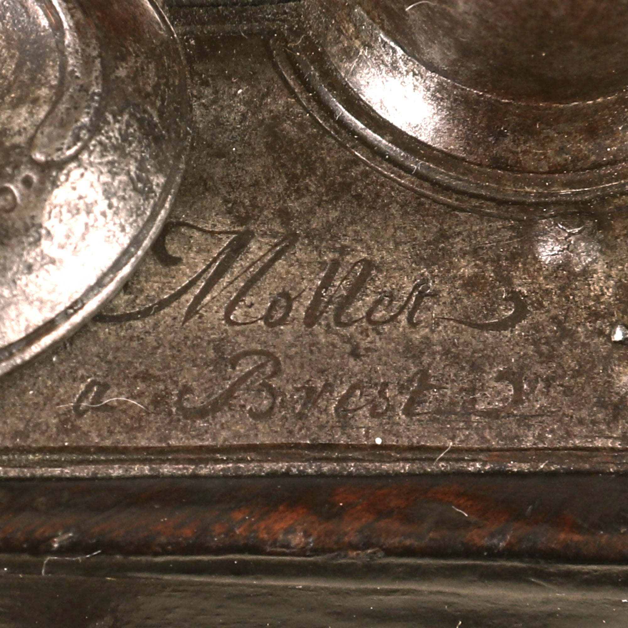 Original Item: Only One Available. Here we have a lovely mid 18th Century French flintlock overcoat pistol, all iron mounted with lovely etched gold embellishments on the top of the barrel. The fittings are all sculpted and decorated either engraving, and the wood stock has some beautiful relief-carved designs around the fittings. The lock is marked Mollet a Brest, indicating it was made or retailed by Mollet of Brest. We have researched this maker, and were not able to find any gunmakers by this name, but there are definitely other flintlock pistols with this lock marking. Brest is a port city in the far west of Brittany, France.