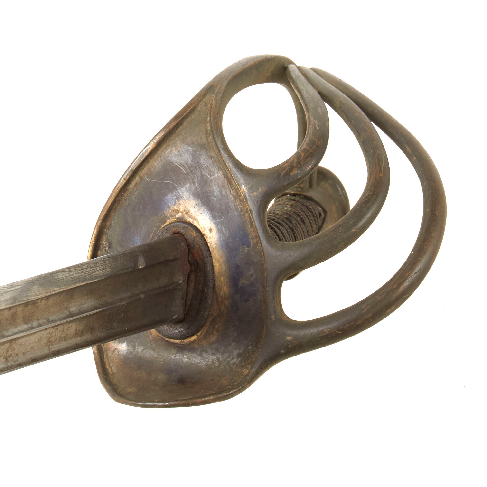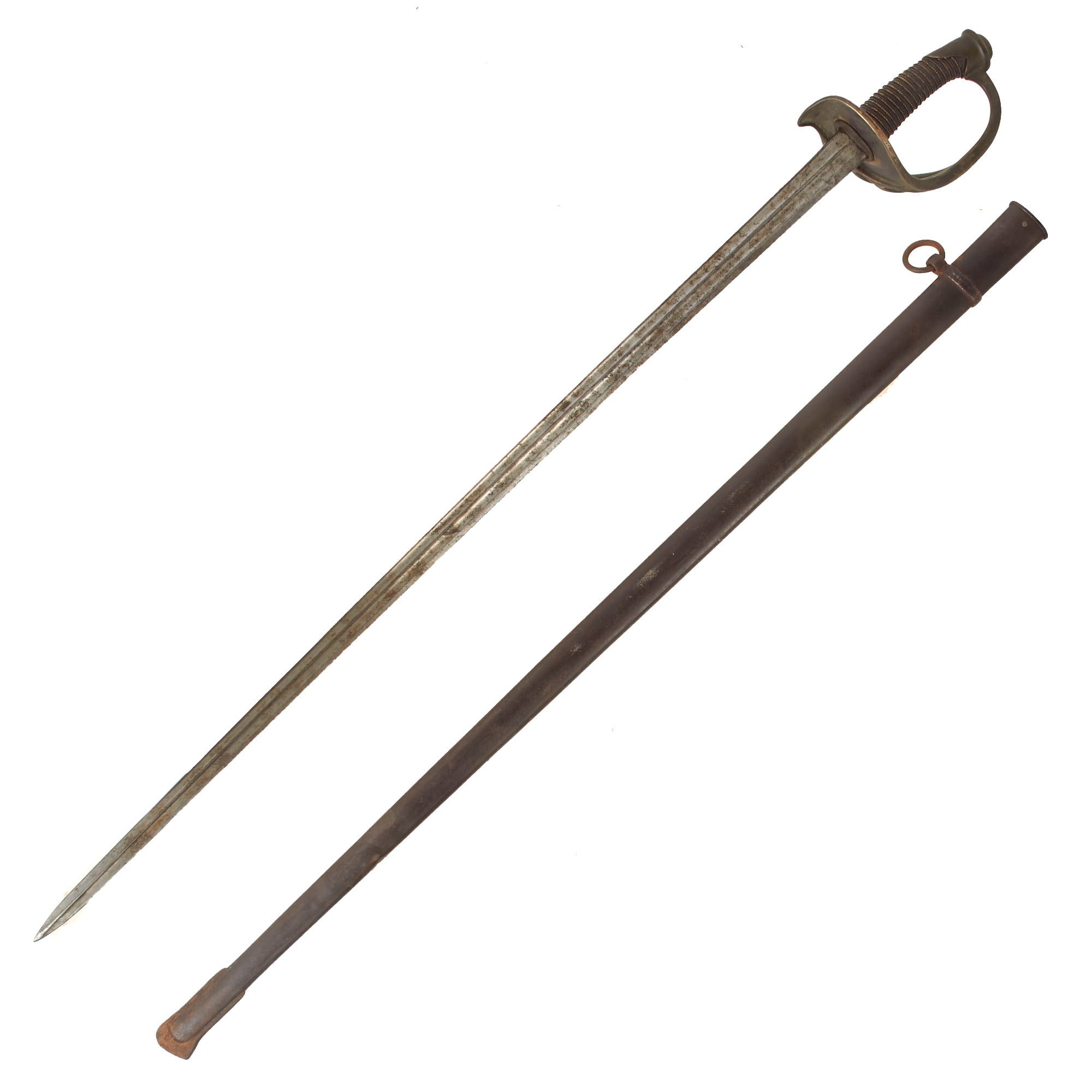 Original Item. One-of-a-Kind. This is a truly phenomenal example of a French Cuirassier Dragoon Saber which was captured during the war by a German “Kuirassier” of the 7th (Magdeburg) Cuirassiers "von Seydlitz", who then scrubbed the French markings and added German Kuirassier unit markings on both the saber guard and the scabbard throat! This is particularly notable as the 7th Cuirassiers took part in what would become known as “Von Bredow’s Death Ride”. This battle-worn example will become a centerpiece in any Franco-Prussian War collection!