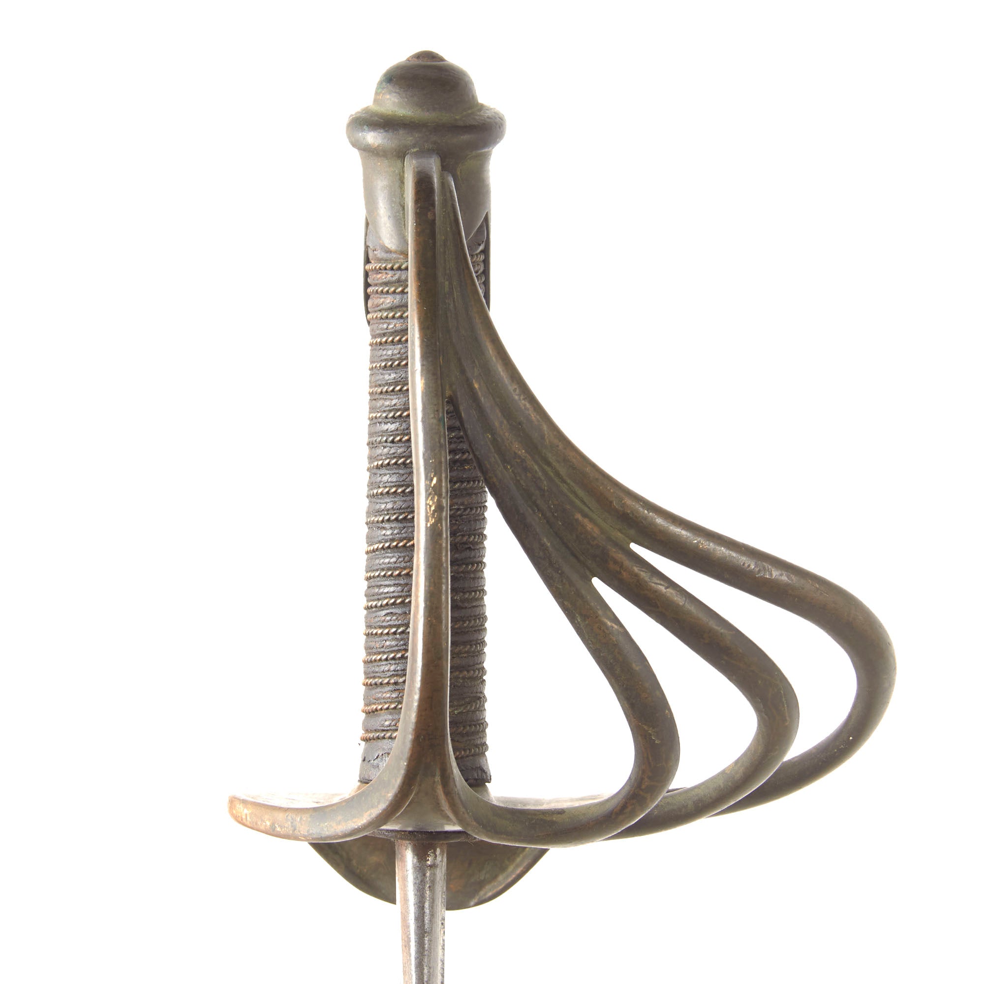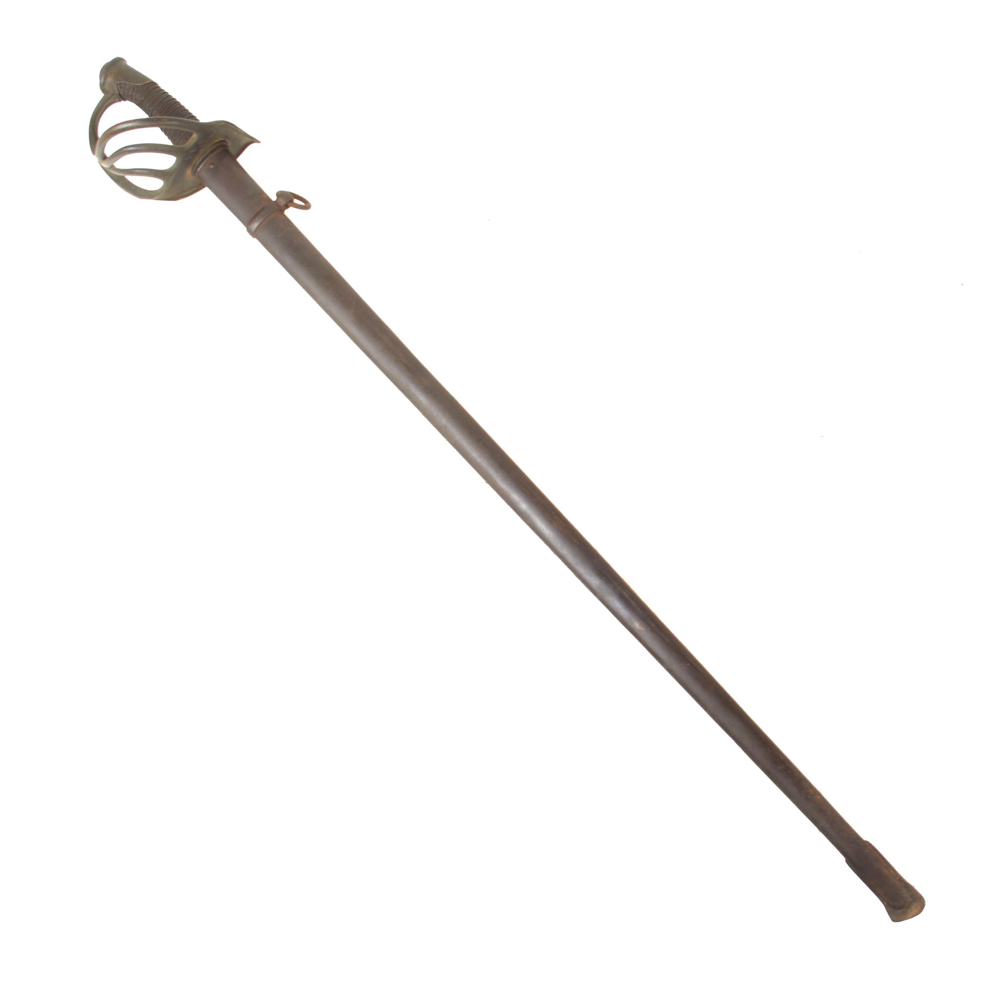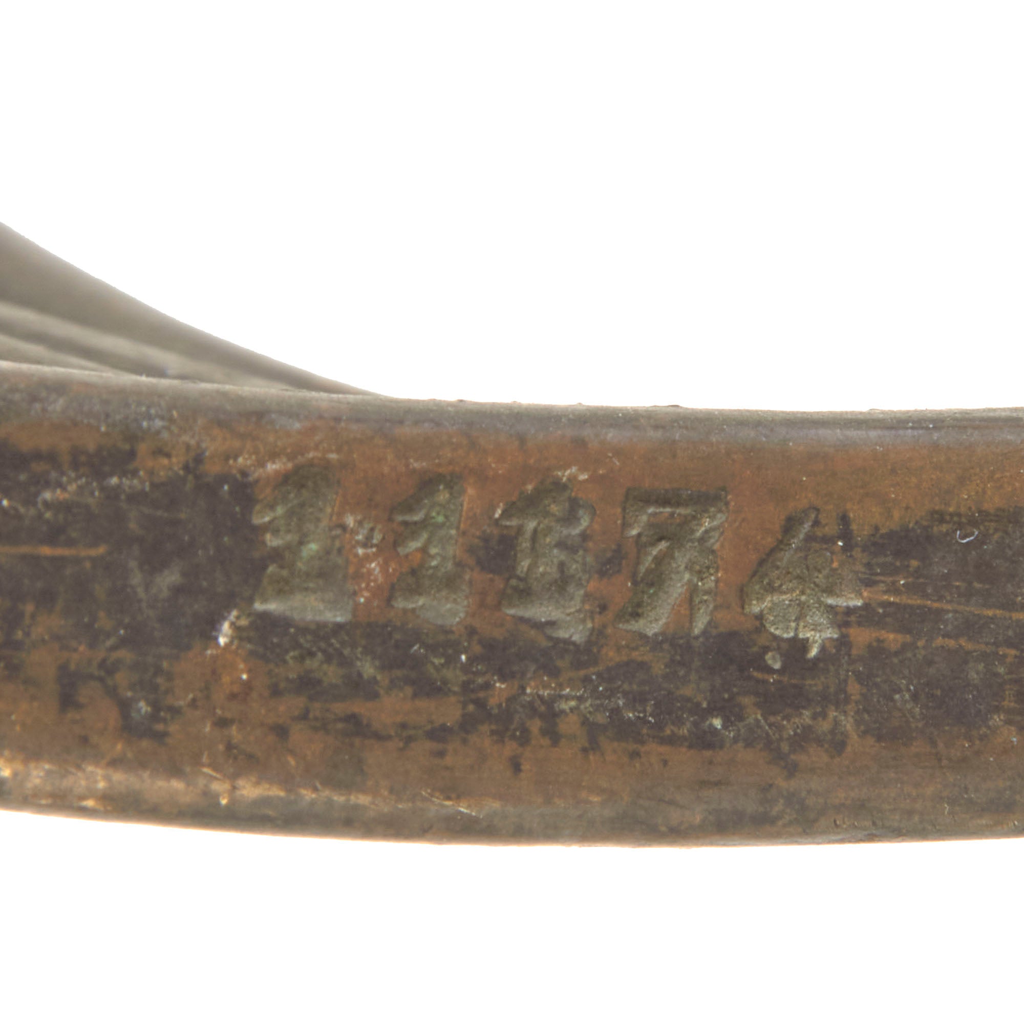 The brass hilt is now extremely dark from battle wear and age. The side of the guard is stamped with a serial number, 11574, that was stamped out by the German. The same serial number is on the suspension ring mount of the scabbard, but not stamped out. The wire-wrapped leather grip shows very heavy wear with minor loss of material but it is rather stable. The saber measures 43” overall.