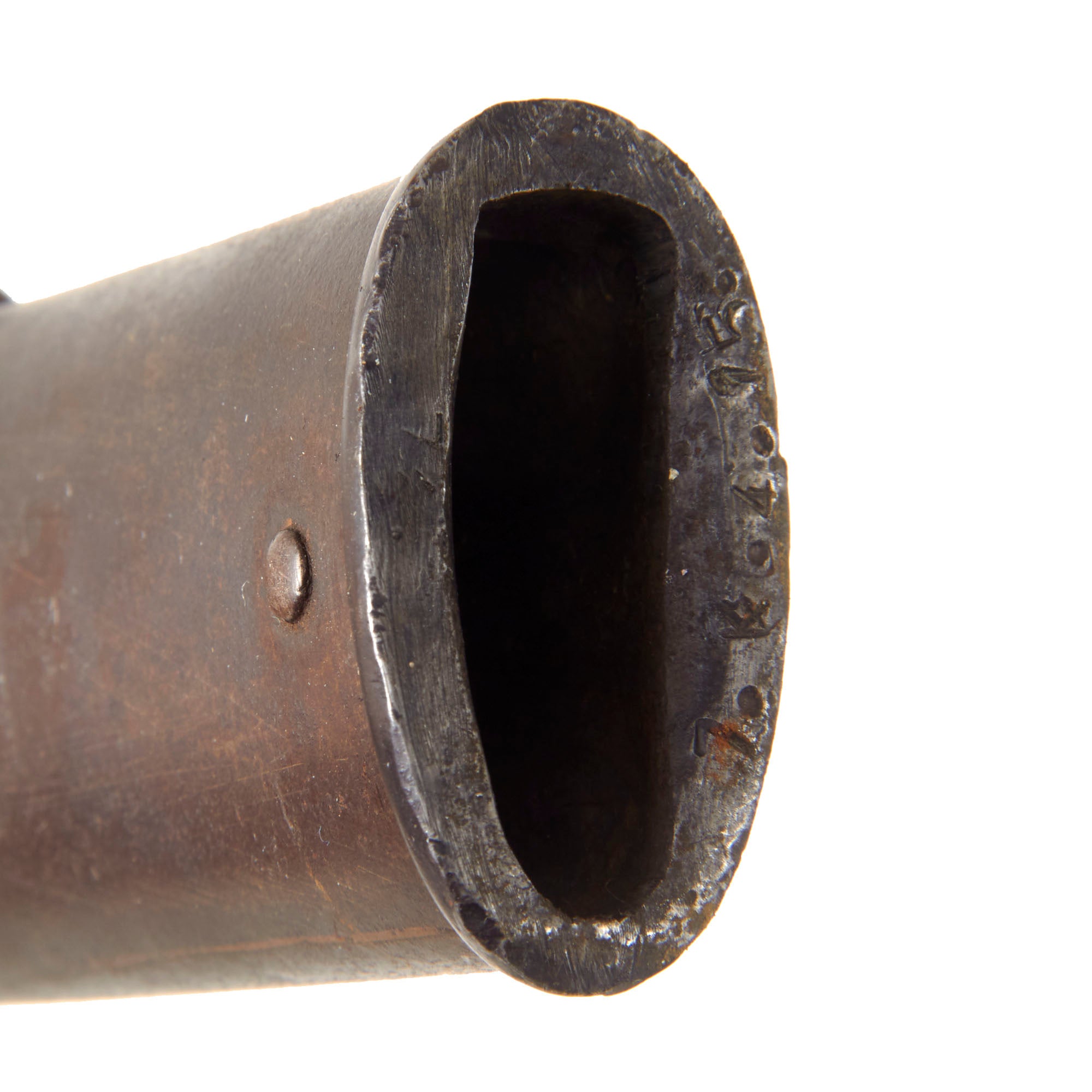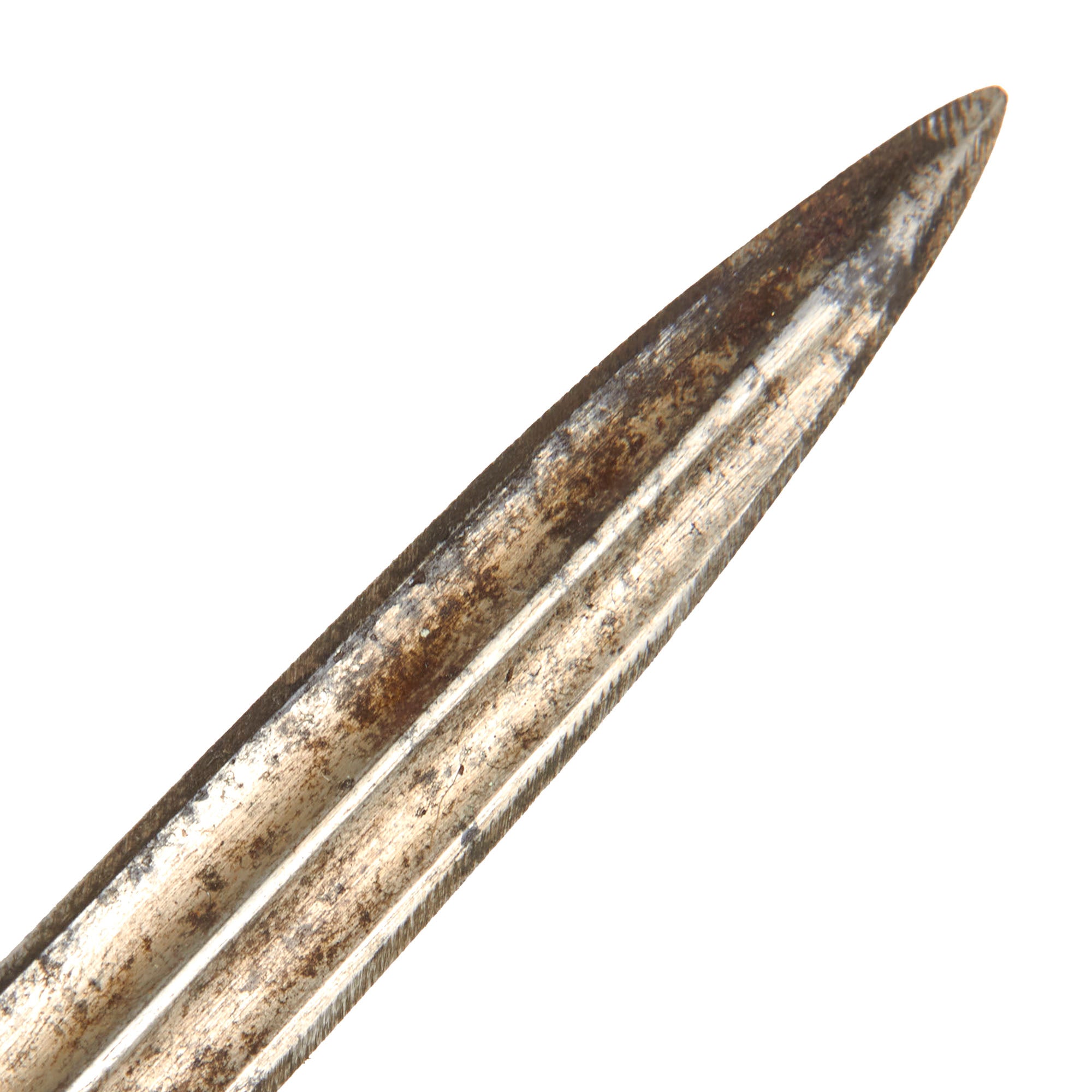 The 37 ¼” scabbard is still mostly straight with some surface oxidation, mostly near the drag. There is minor denting but the suspension ring is still well-retained. As mentioned, the top of the throat is stamped with the same German unit marking as on the top of the guard, 7. K. 4. 15.