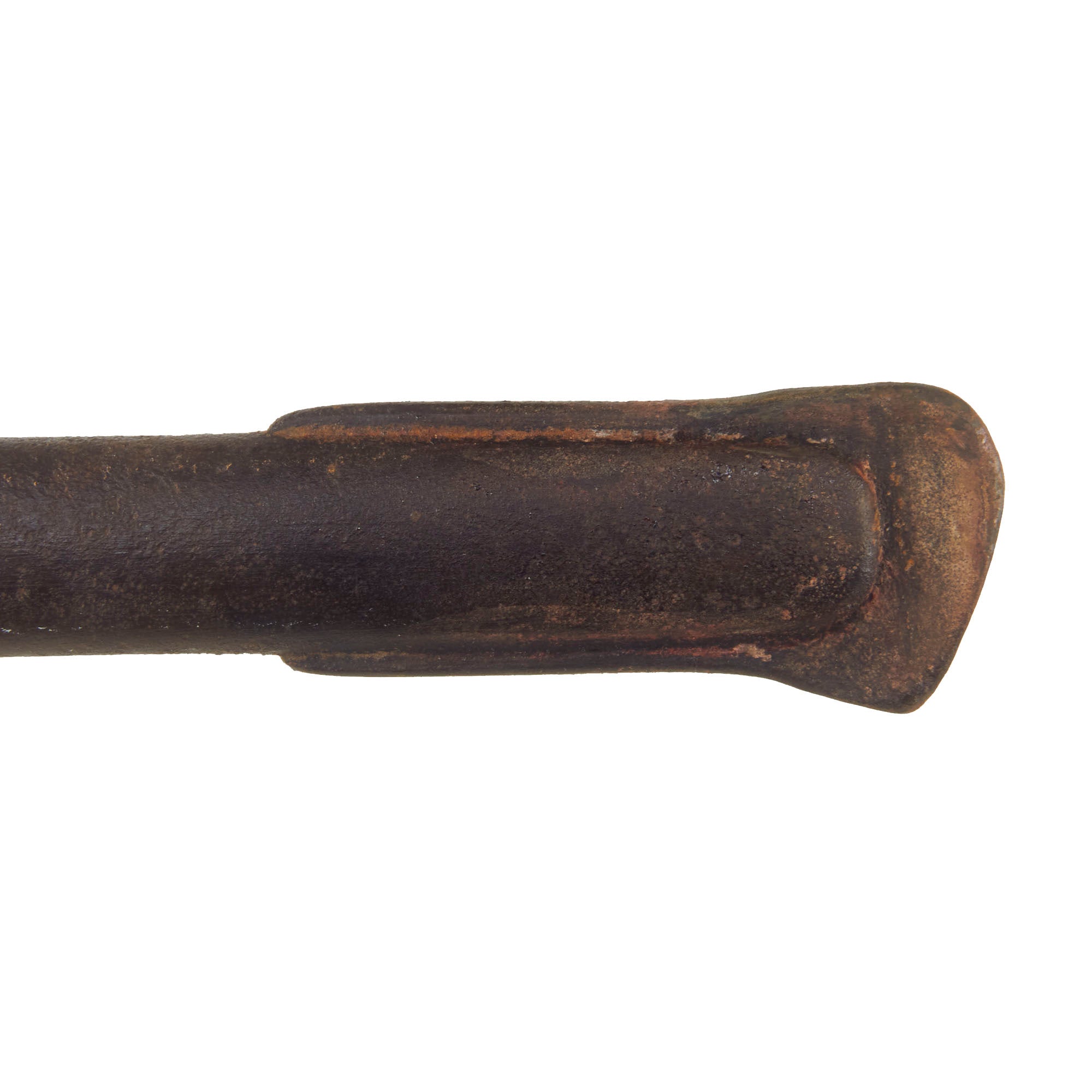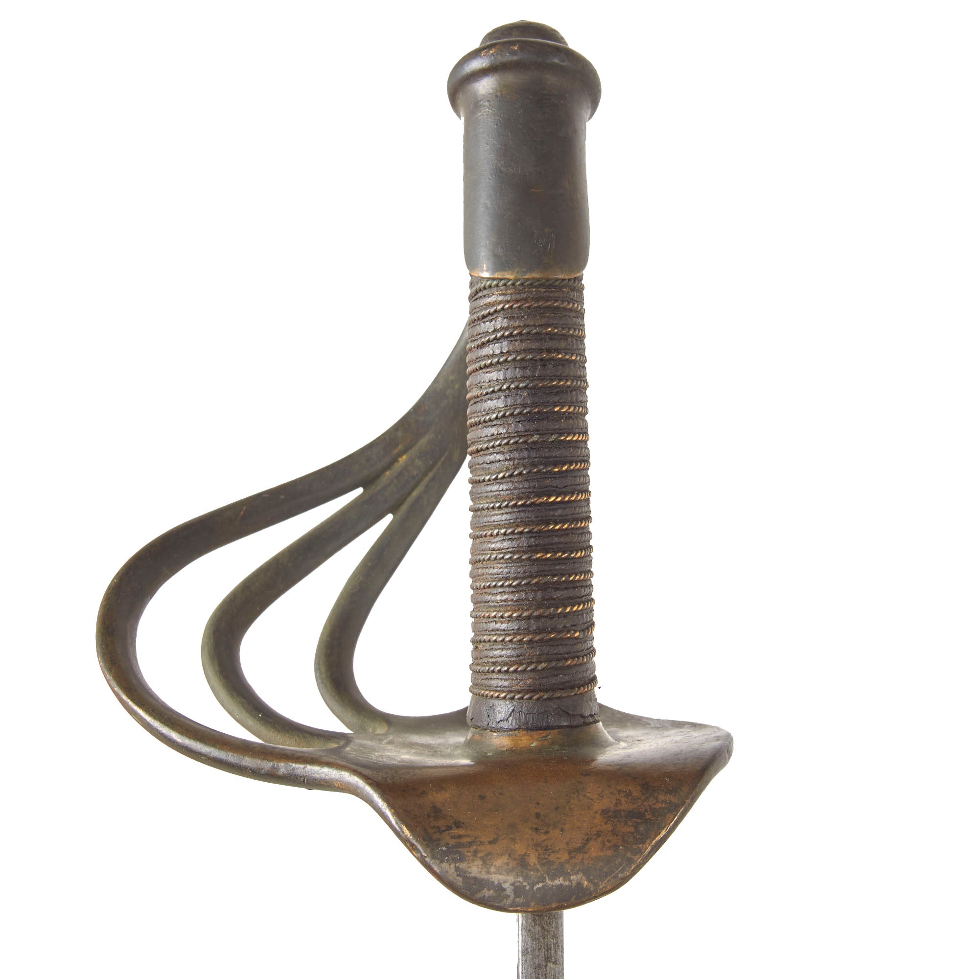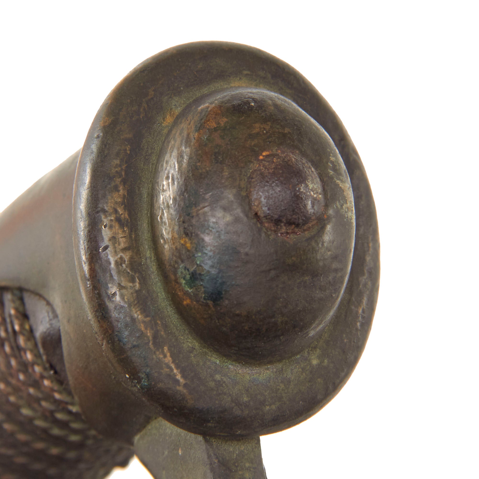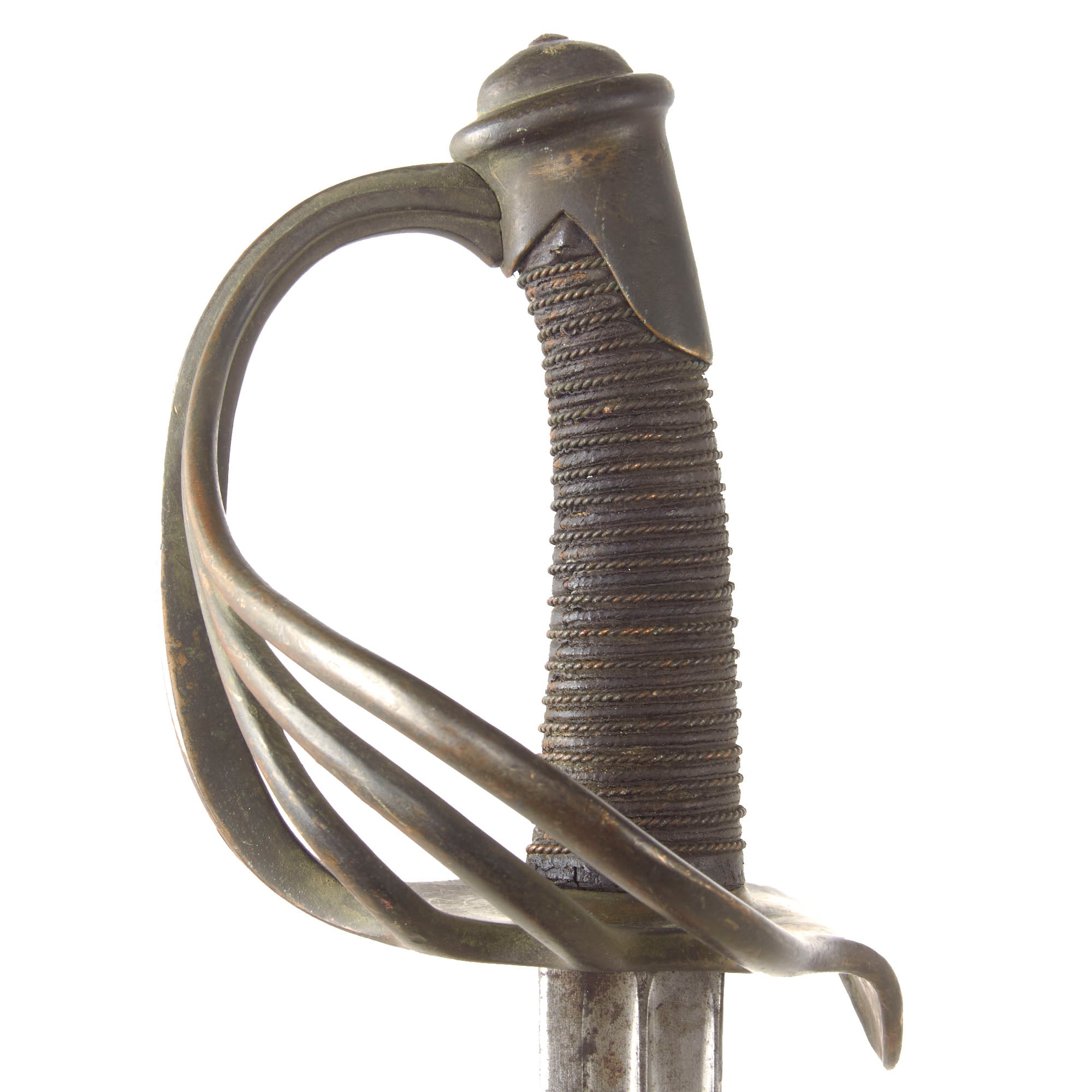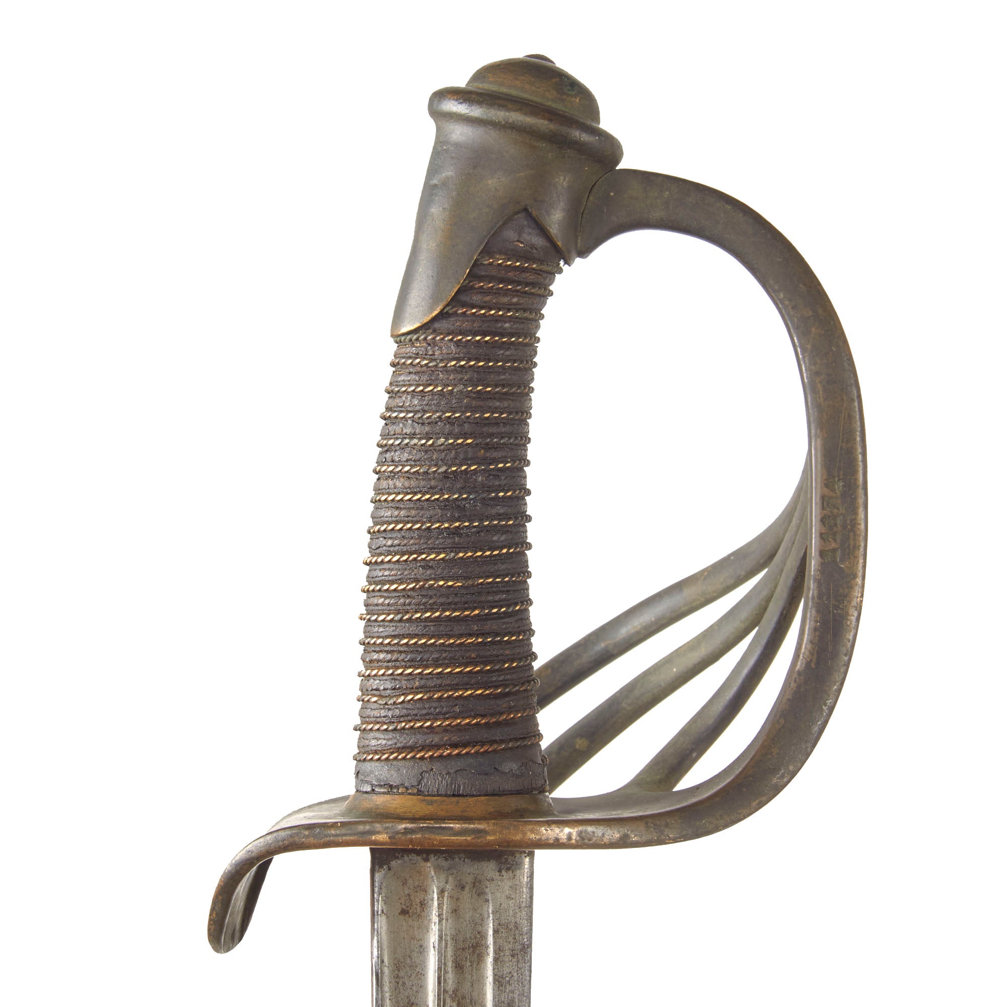 The captured French saber sports a 36 ⅜” steel blade with double fullers on each side. Some of the original leather blade buffer is still retained. The spine originally bore an engraved arsenal marking and date, but the German Kuirassier scrubbed most of what was there, leaving scratches in its place. The blade is still sharp and shows some sharpening near the tip. There is surface oxidation which we have left in place to preserve the patina.