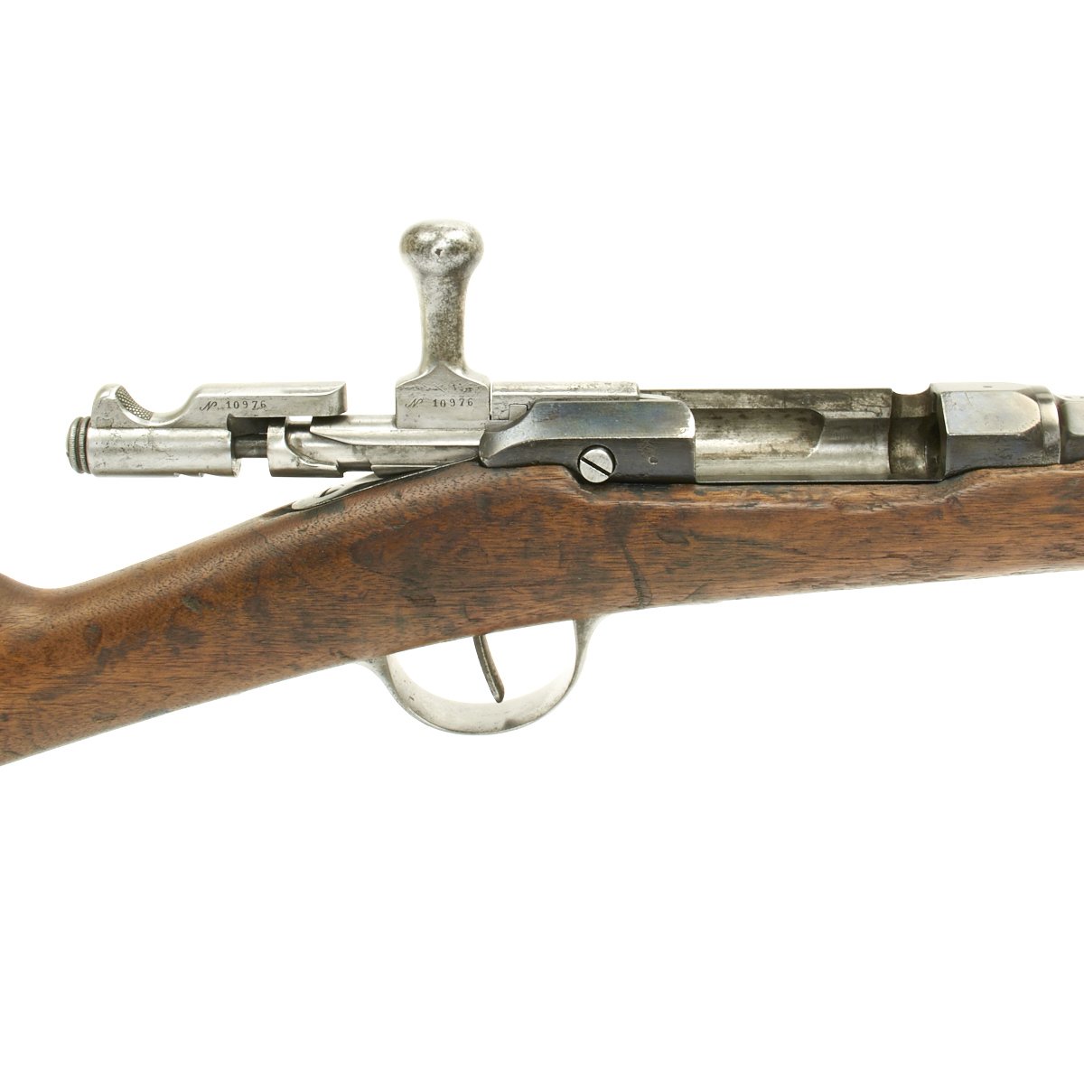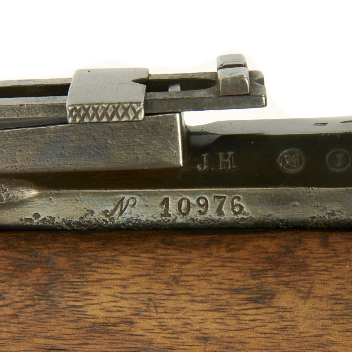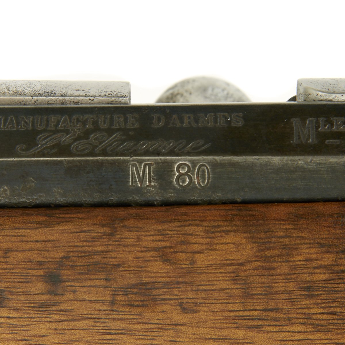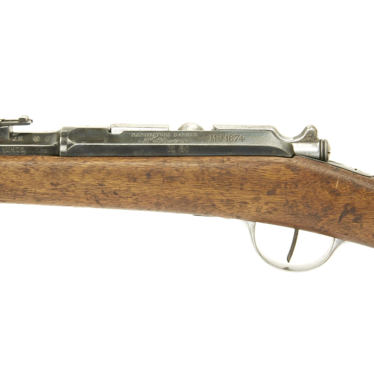 This is a fine example has an excellent bright bore with clear lands and grooves. The received is marked MANUFACTURE D'ARMES St-Étienne Mle 1874 over M80. The rifle has an issue date stamped into the barrel of S.1878. It comes with all original steel mounts and cleaning rod. Most fittings bear the correct government proof marks, though some are worn. The stock has traces of the usual round cartouche, however it is very faint, and the central plug has been sanded down. The rest of the stock is also worn, with chips and dents throughout. This rifle has partially matched serial numbers, indicating a long service life, as indicated by the stock condition. Serial number 10976 is present on the barrel, stock, and all parts of the bolt except for the bolt face, which has been replaced.