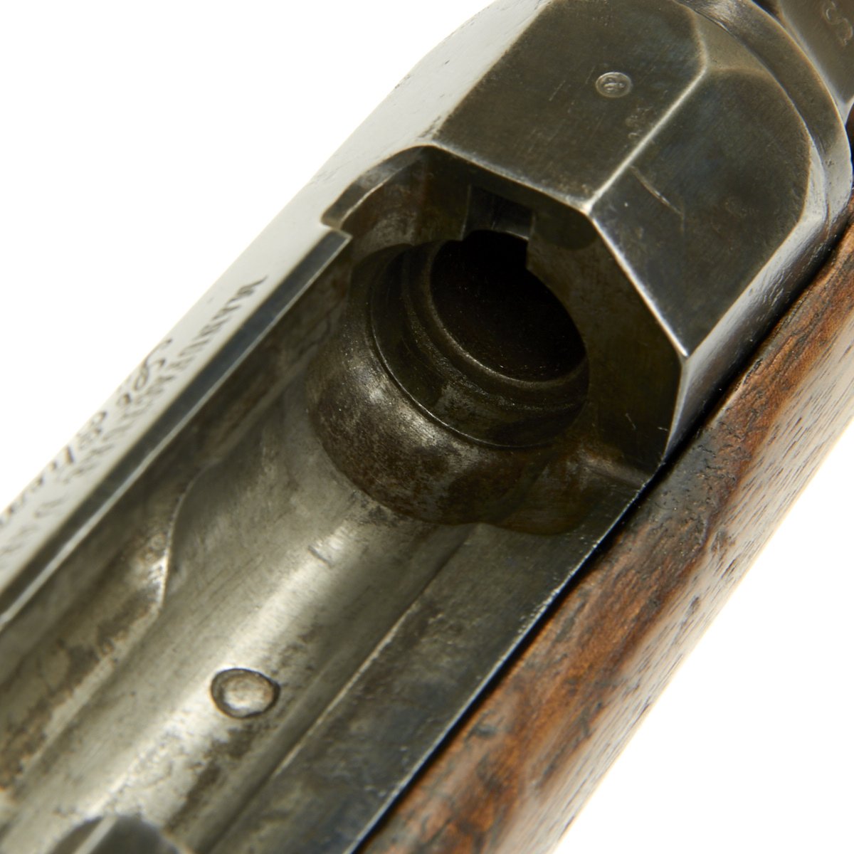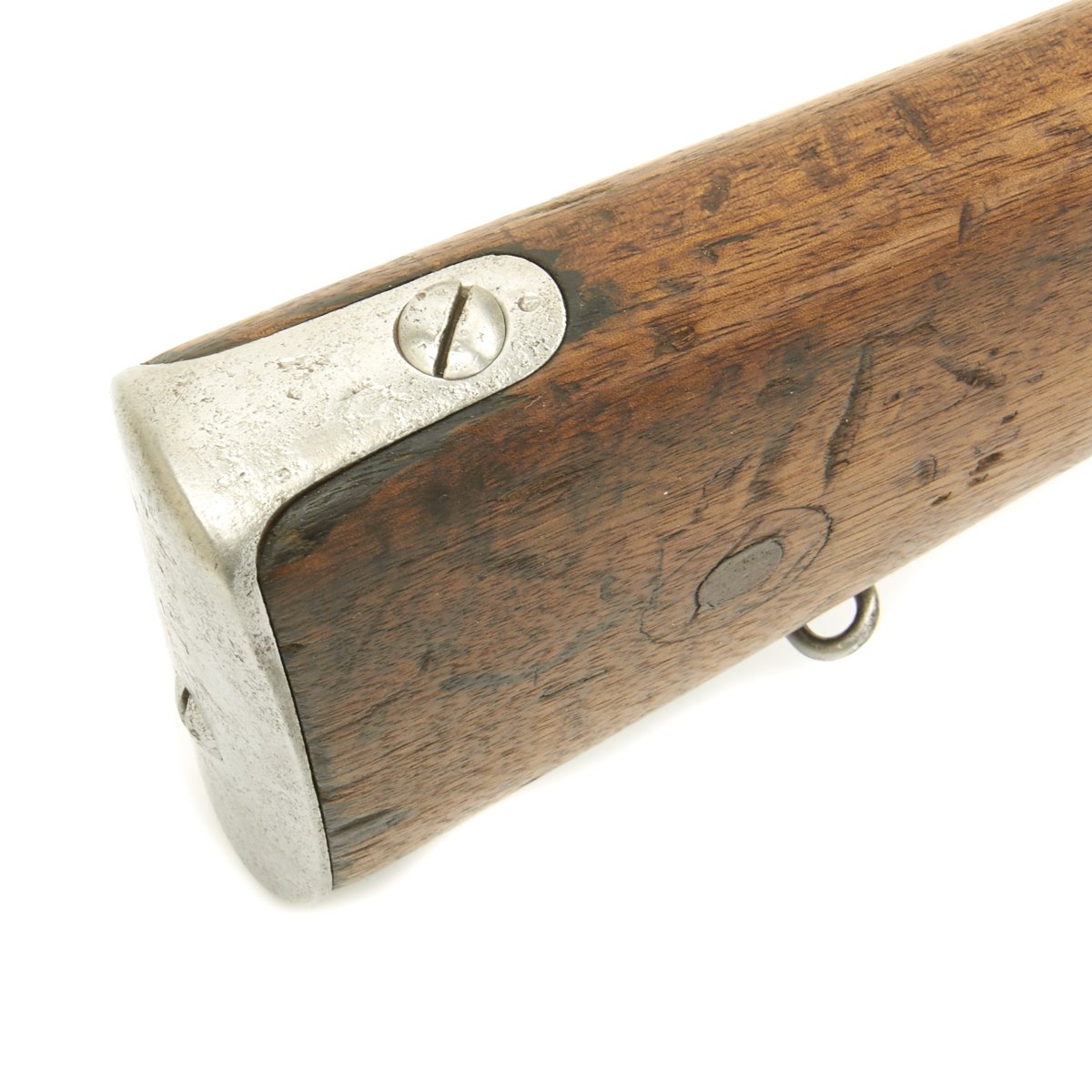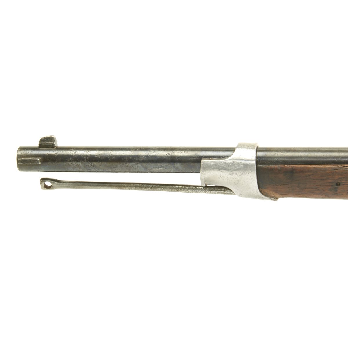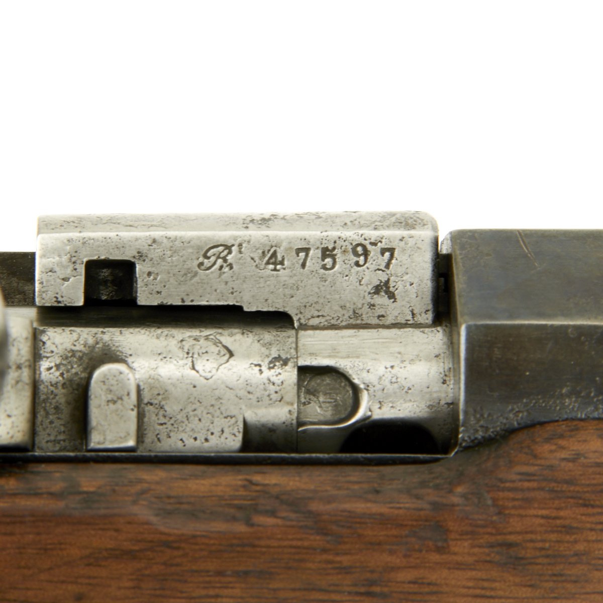 This is a fine example has an excellent bright bore with clear lands and grooves. The received is marked MANUFACTURE D'ARMES St-Étienne Mle 1874 over M80. The rifle has an issue date stamped into the barrel of S.1878. It comes with all original steel mounts and cleaning rod. Most fittings bear the correct government proof marks, though some are worn. The stock has traces of the usual round cartouche, however it is very faint, and the central plug has been sanded down. The rest of the stock is also worn, with chips and dents throughout. This rifle has partially matched serial numbers, indicating a long service life, as indicated by the stock condition. Serial number 10976 is present on the barrel, stock, and all parts of the bolt except for the bolt face, which has been replaced.