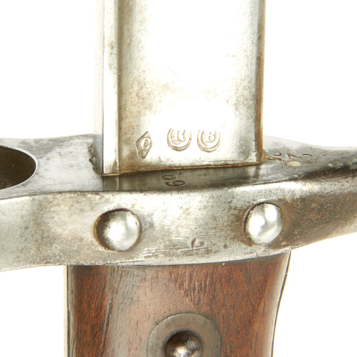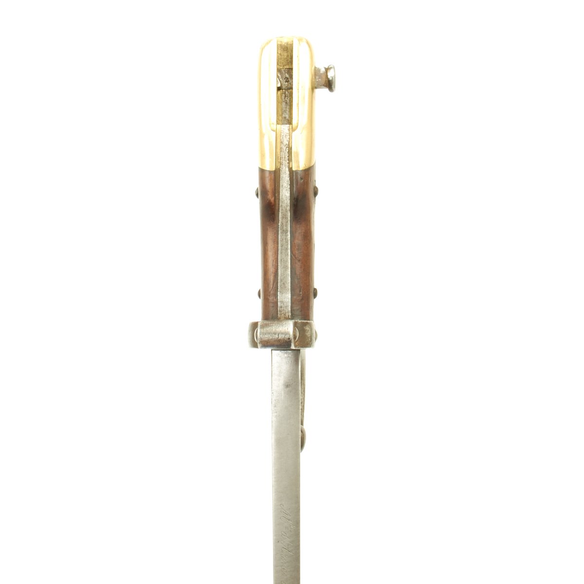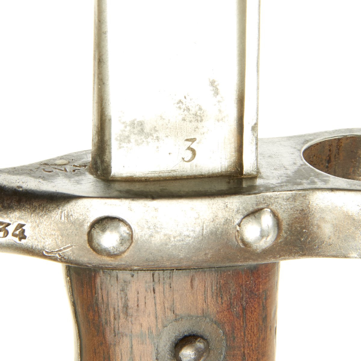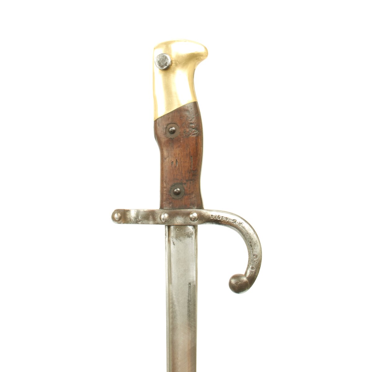 Included with this rifle a correct issue Triangular-bladed Model 1874 "Gras" sword bayonet with steel scabbard. This bayonet is in very good condition, with a bright blade with little corrosion, and all the correct issue markings. The T-shaped back of the bayonet is marked Mre D'Armes de Châta = Aeout 1882.