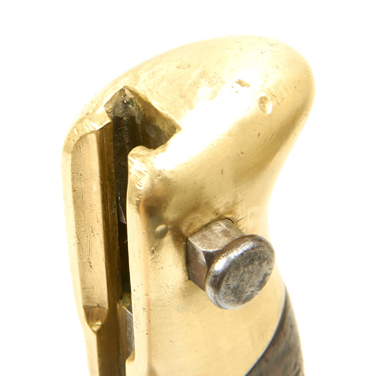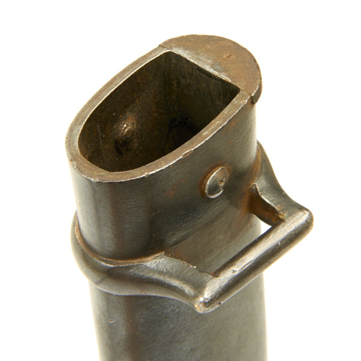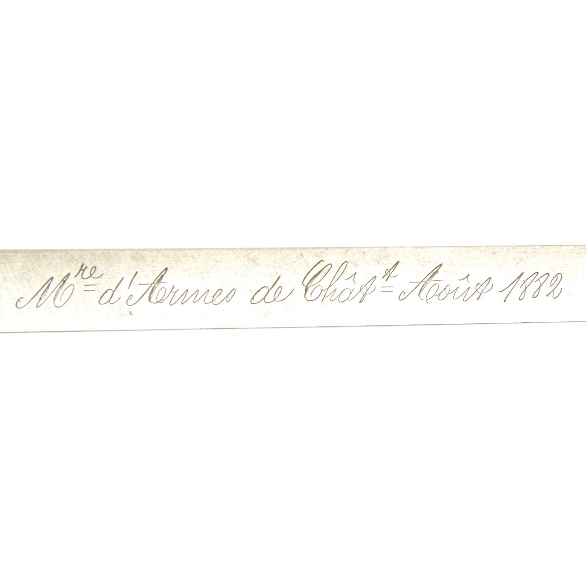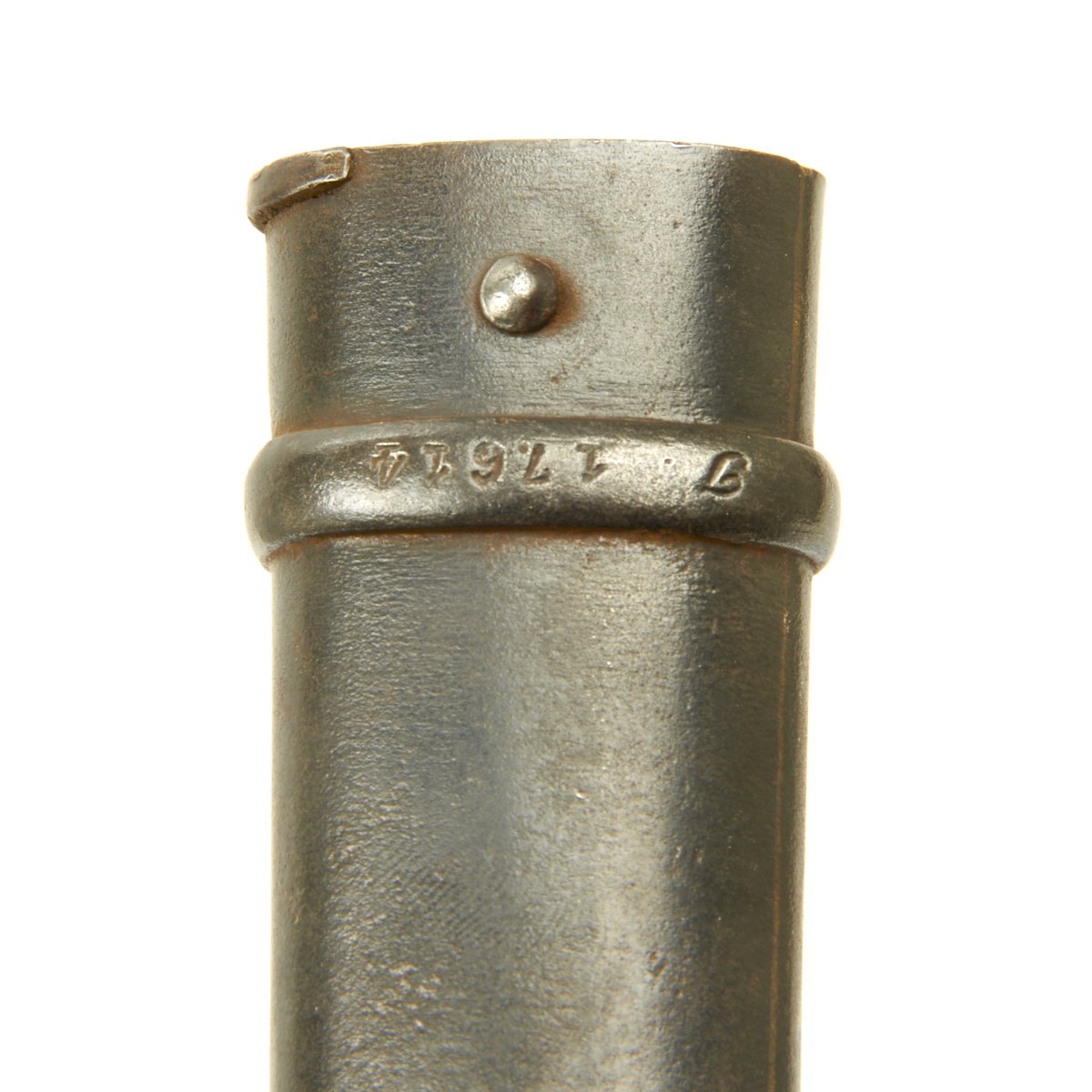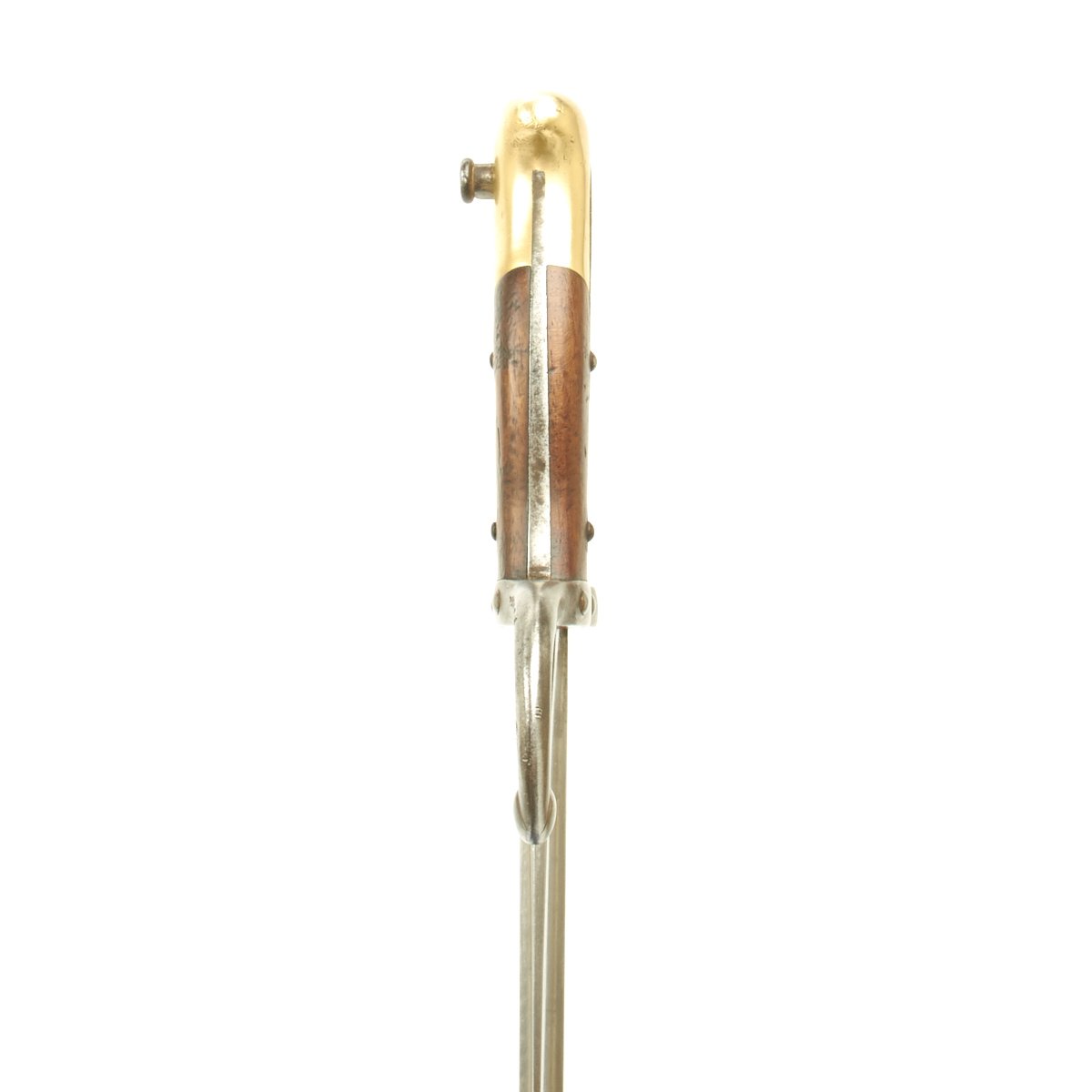 Included with this rifle a correct issue Triangular-bladed Model 1874 "Gras" sword bayonet with steel scabbard. This bayonet is in very good condition, with a bright blade with little corrosion, and all the correct issue markings. The T-shaped back of the bayonet is marked Mre D'Armes de Châta = Aeout 1882.