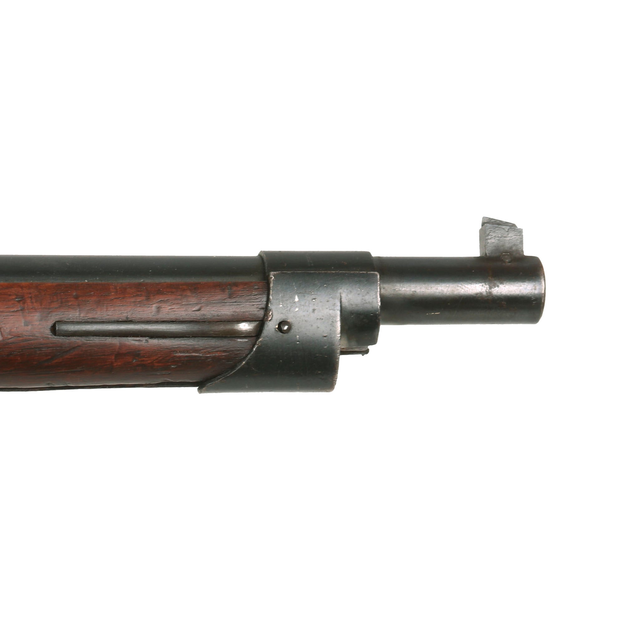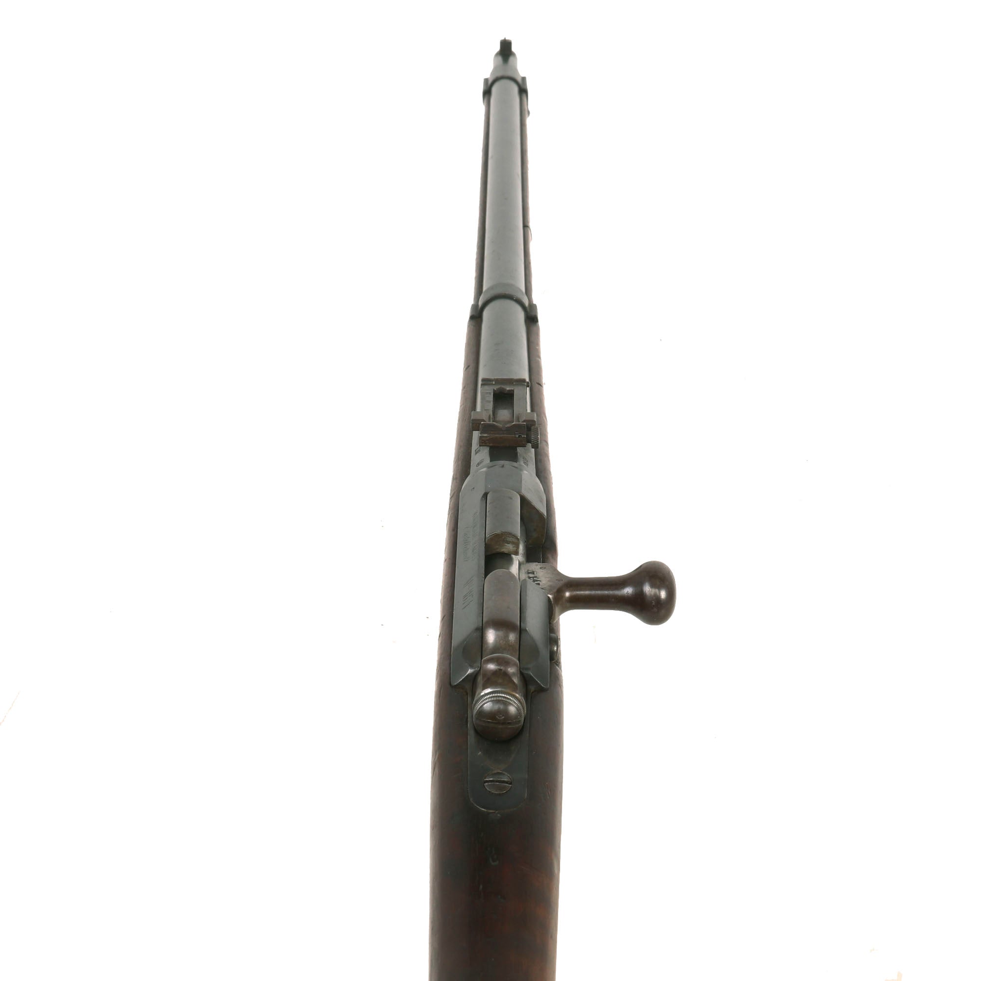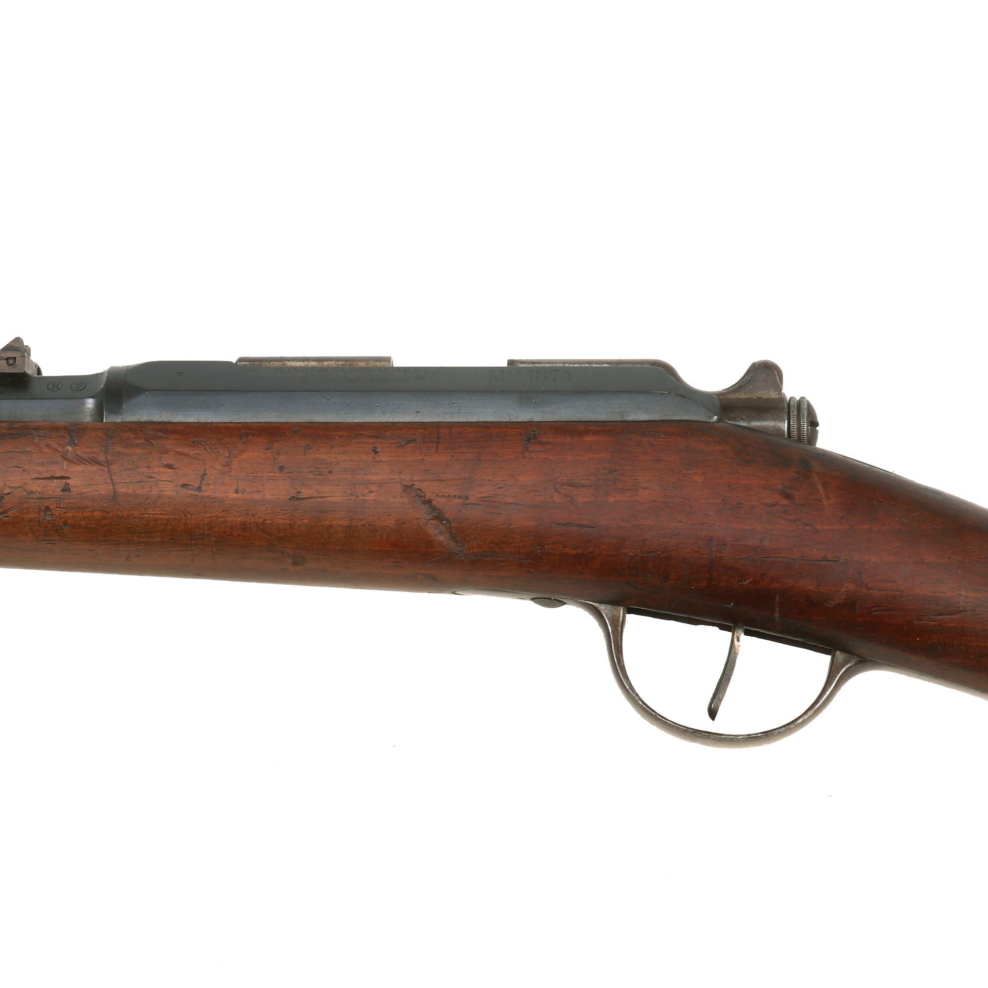 This is very interesting example of the Fusil Gras Modèle 1874 M80, which was converted at arsenal to a .22 trainer for target practice, most likely during the WWI era or later. The bolt was modified, and the barrel was sleeved down to .22. The barrel and stock were also shortened slightly, reducing the overall length by about 4 1/2 inches. A section of the fore stock was removed to shorten the stock, which was left unglued, or the glue joint came apart. A previous example had an angled scarf joint, but these conversions do not appear to have been entirely standardized. The rear sight was replaced with a modern style sight adjustable for windage, and the front sight was replaced as well.