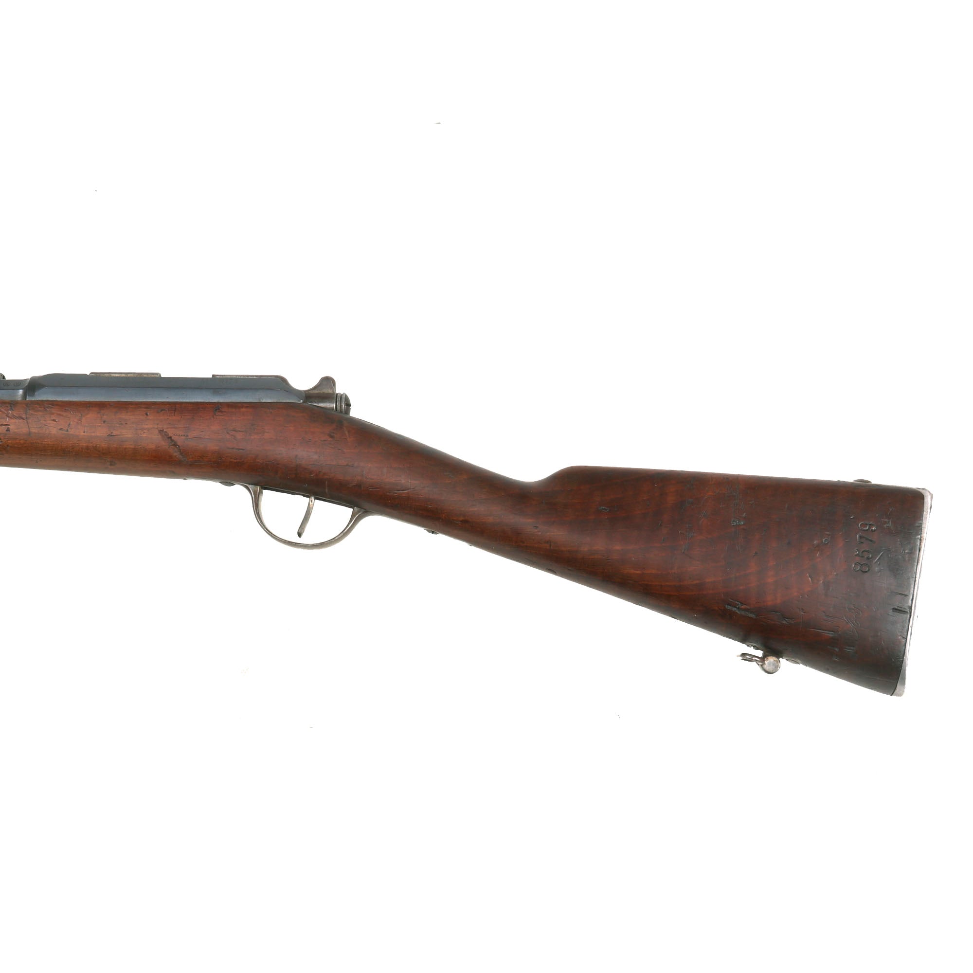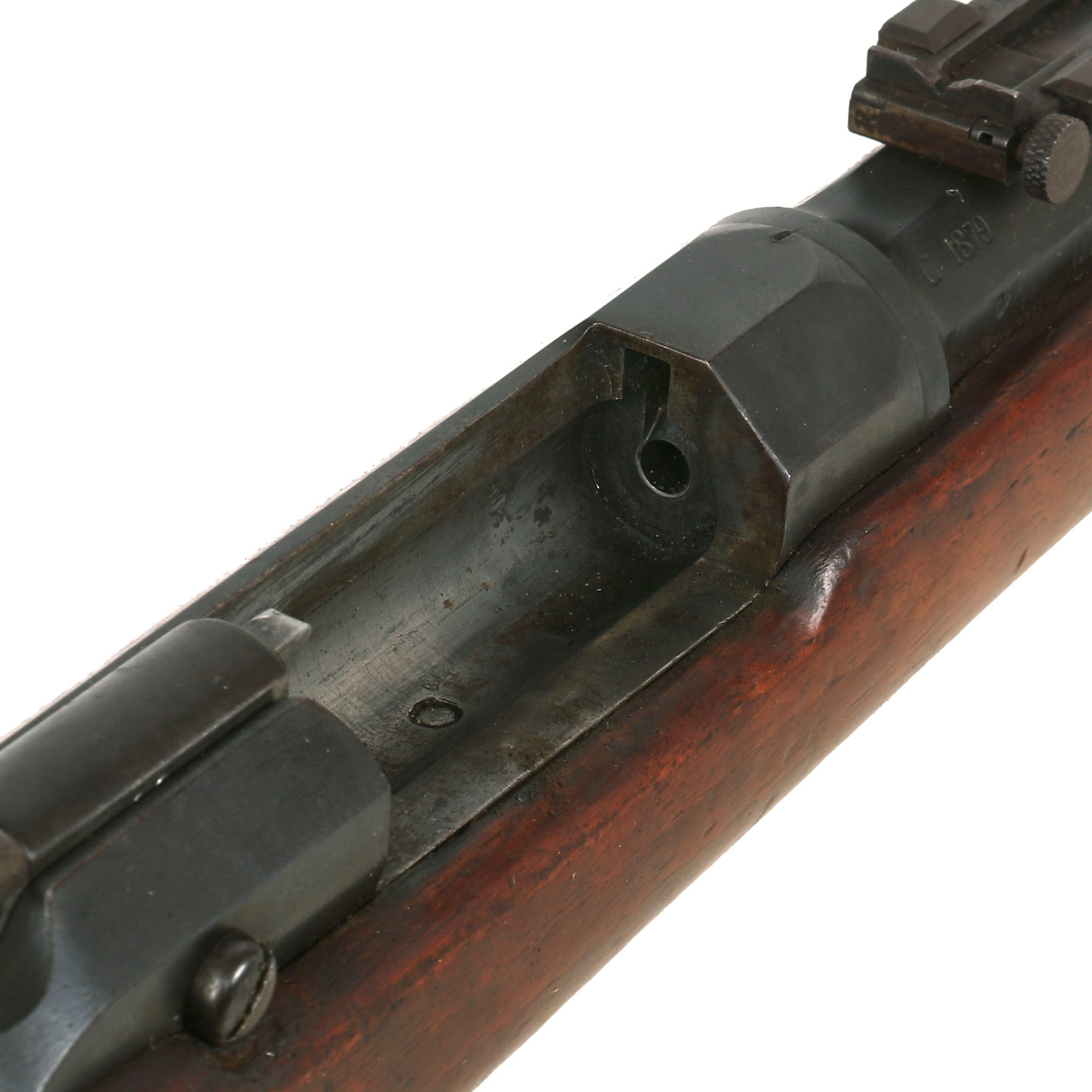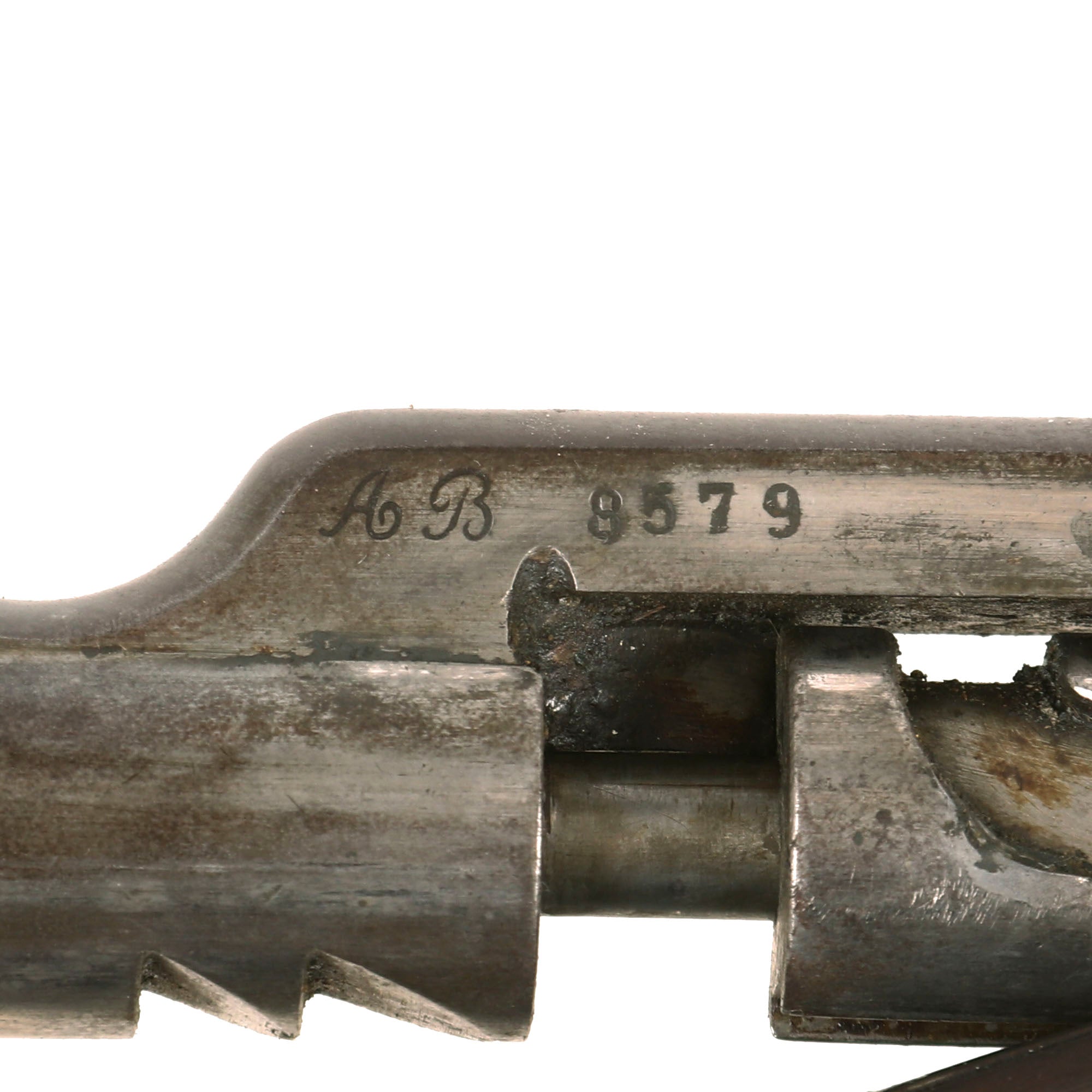 The receiver on the rifle is clearly marked MANUFACTURE D'ARMES / Châtellerault, and to the right is the model designation Mle 1874. The rifle has a clear issue date marking of C. 1879 stamped into the right barrel nocks form, for manufacture at the Imperial Arsenal at Châtellerault in 1879. There is no "M80" marking, most likely due to the early manufacture date. The left side of the barrel is marked with serial number AB 8579, which matches the number on the bolt, though there are other numbers stamped onto the bolt as well. The stock is also marked with this serial number, so it does not look like any parts were swapped out during the conversion, making this an "All Matching" example!