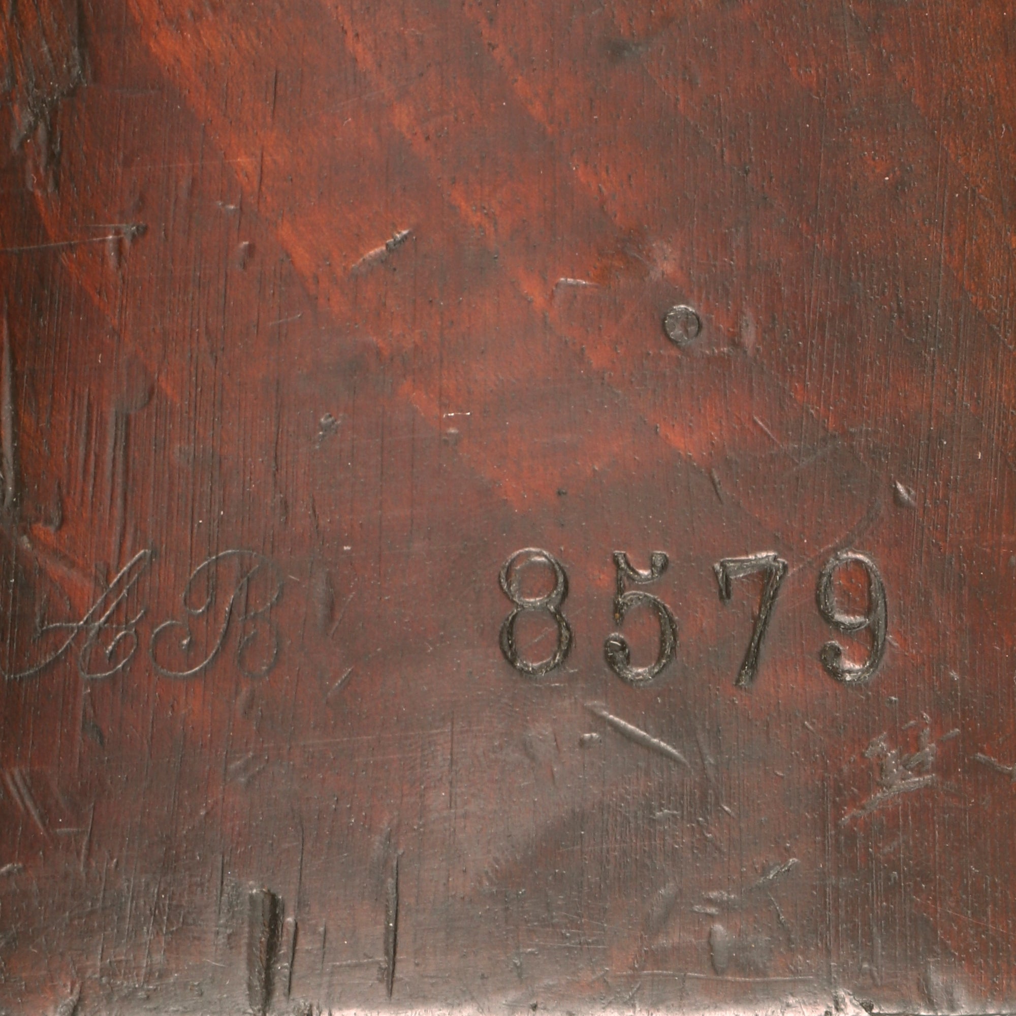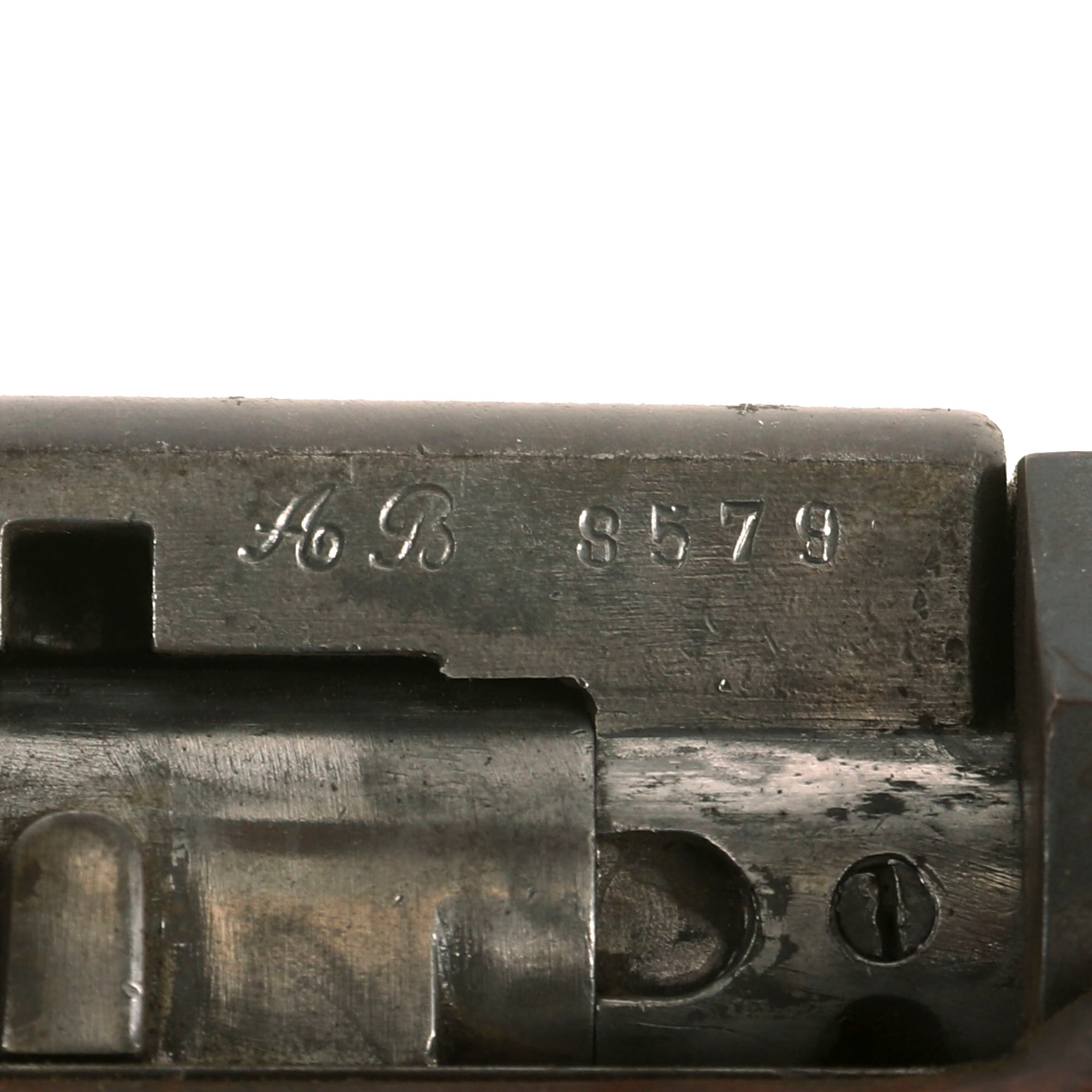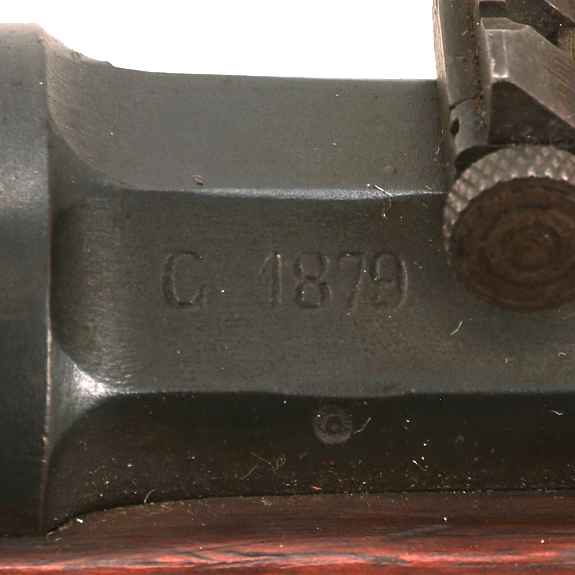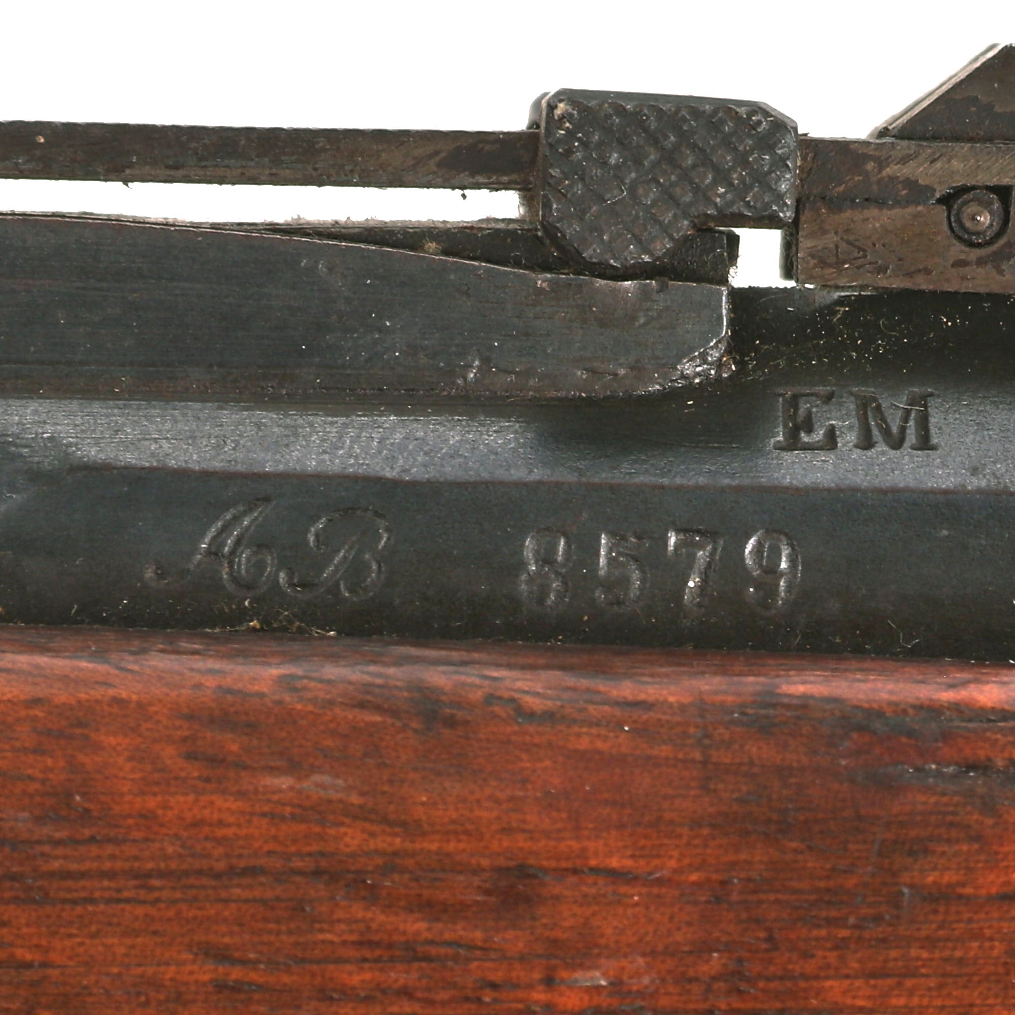 The receiver on the rifle is clearly marked MANUFACTURE D'ARMES / Châtellerault, and to the right is the model designation Mle 1874. The rifle has a clear issue date marking of C. 1879 stamped into the right barrel nocks form, for manufacture at the Imperial Arsenal at Châtellerault in 1879. There is no "M80" marking, most likely due to the early manufacture date. The left side of the barrel is marked with serial number AB 8579, which matches the number on the bolt, though there are other numbers stamped onto the bolt as well. The stock is also marked with this serial number, so it does not look like any parts were swapped out during the conversion, making this an "All Matching" example!