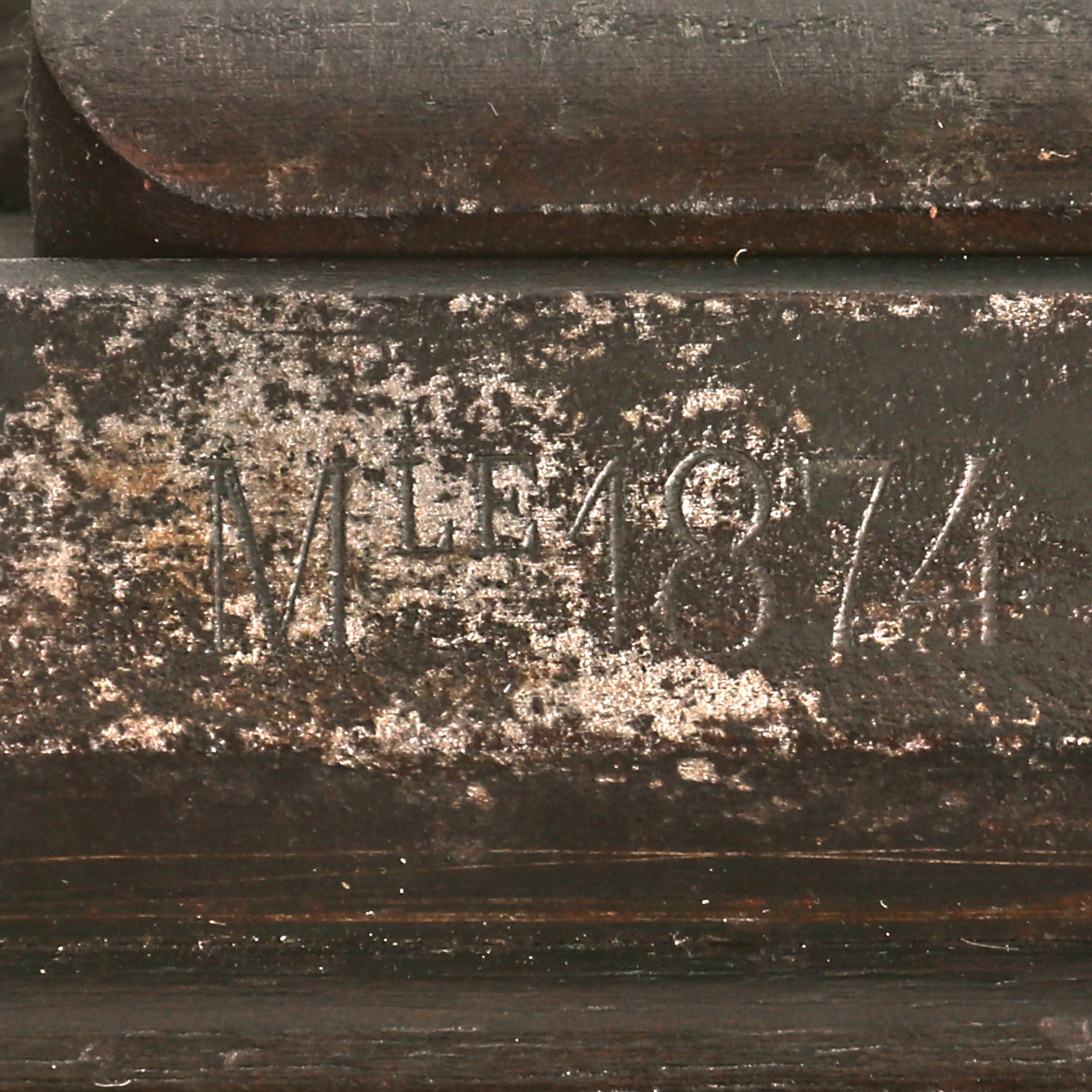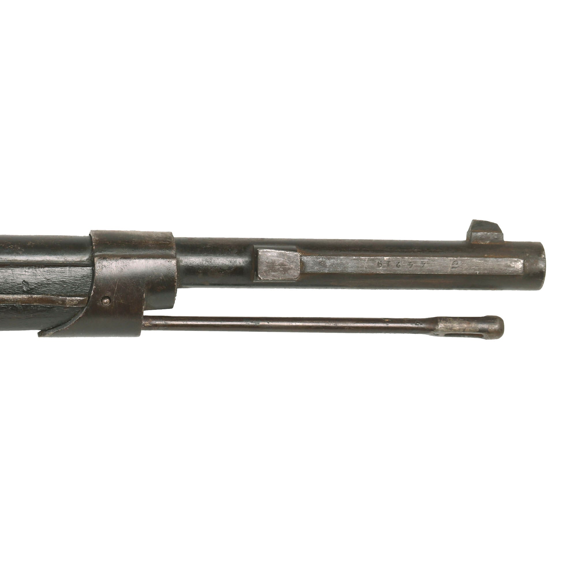 This is a nice service used example of the Fusil Gras Modèle 1874, still relatively clearly marked on the receiver with MANUFACTURE D'ARMES / Tulle, and to the right is the model designation Mle 1874. There does not appear to be any "M80" stamp, so this example did not have the modification done to help with gas escape from the chamber in the case of a ruptured cartridge. The rifle has an issue date marking of T. 1879 stamped into the right barrel nocks form, for manufacture at the Imperial Arsenal of Tulle in 1879. It comes with all original steel mounts and an intact cleaning rod. Most fittings bear the correct government proof marks, though some are worn.
