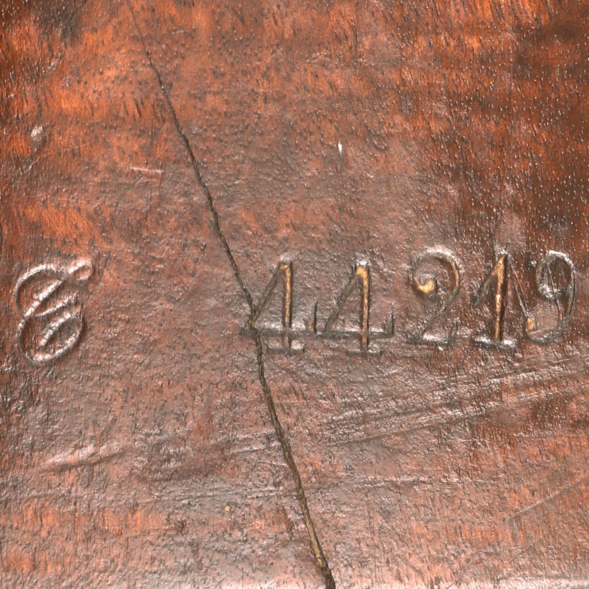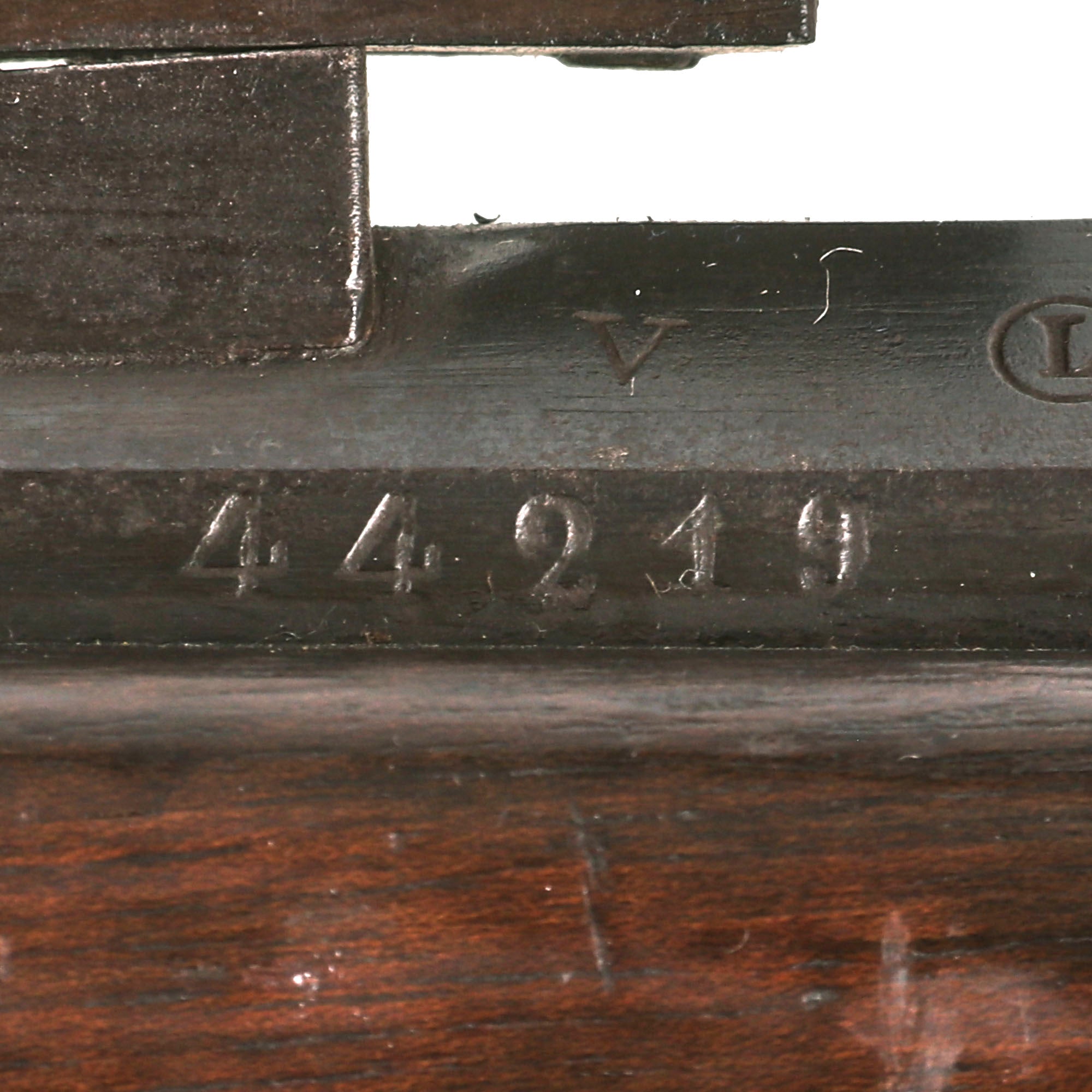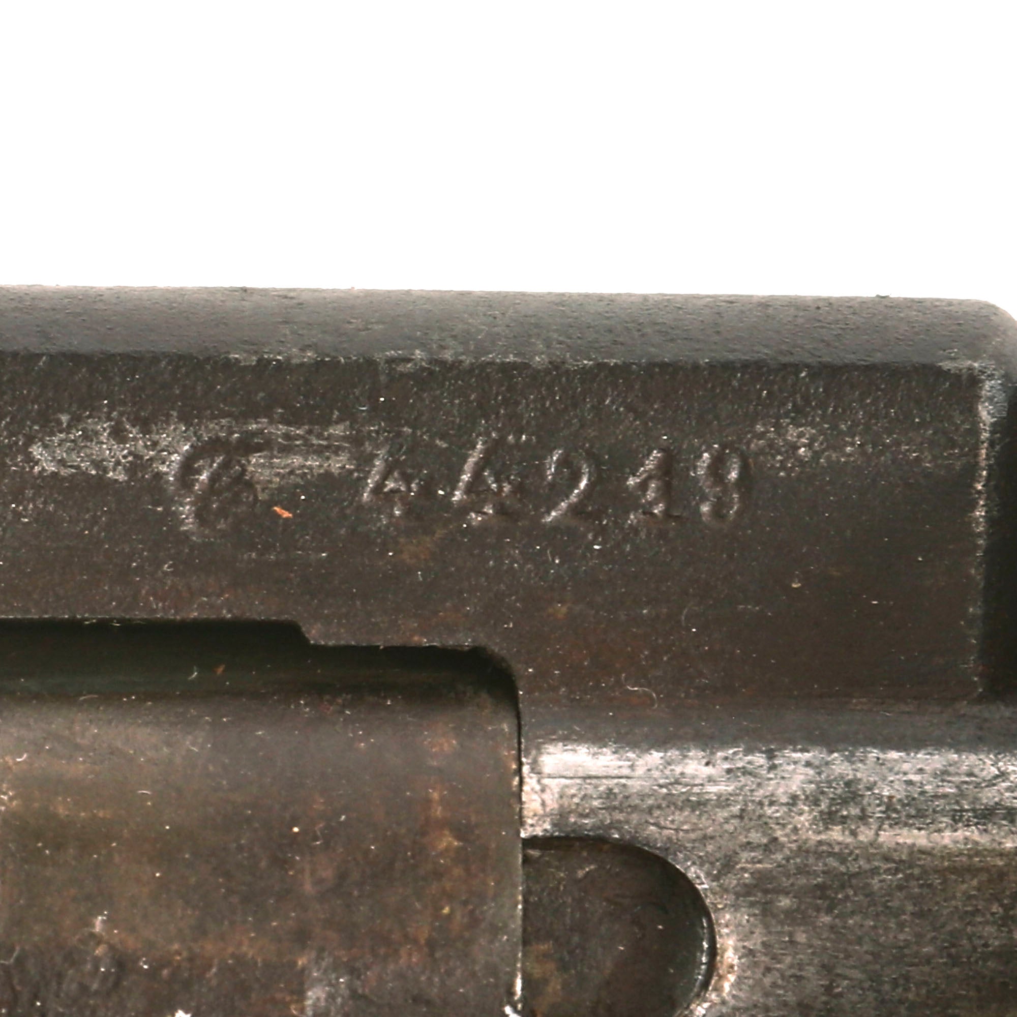 The rifle is marked with matching serial number T 44219 on the barrel, all components of the bolt, the bayonet stand, and on the left side of the butt stock. Only the cleaning rod is non-matching, making this a very nice "Mostly Matching" example, with no major parts swapped out over the years. The metalwork is in good condition, looking to possibly have been blued overall at some point, but then cleaning has removed this finish in various areas, and left it with a peppery patina in many areas. There is also a bit of past minor pitting on the barrel, now removed. The bolt still moves correctly and dry fires, and the firing pin and extractor are intact. The bore is in good condition, showing clear rifling, but also a good amount of fouling and oxidation, particularly in the grooves.
