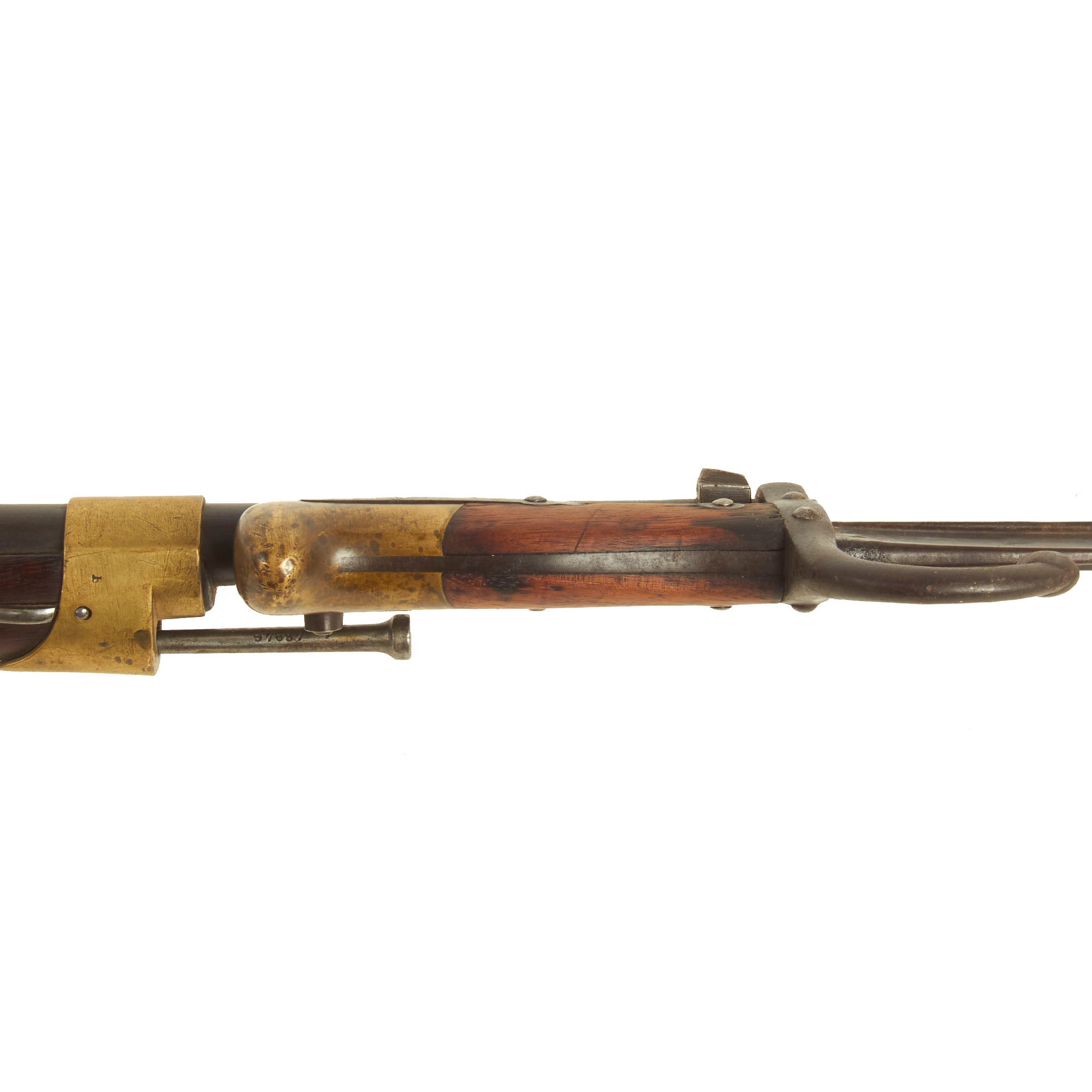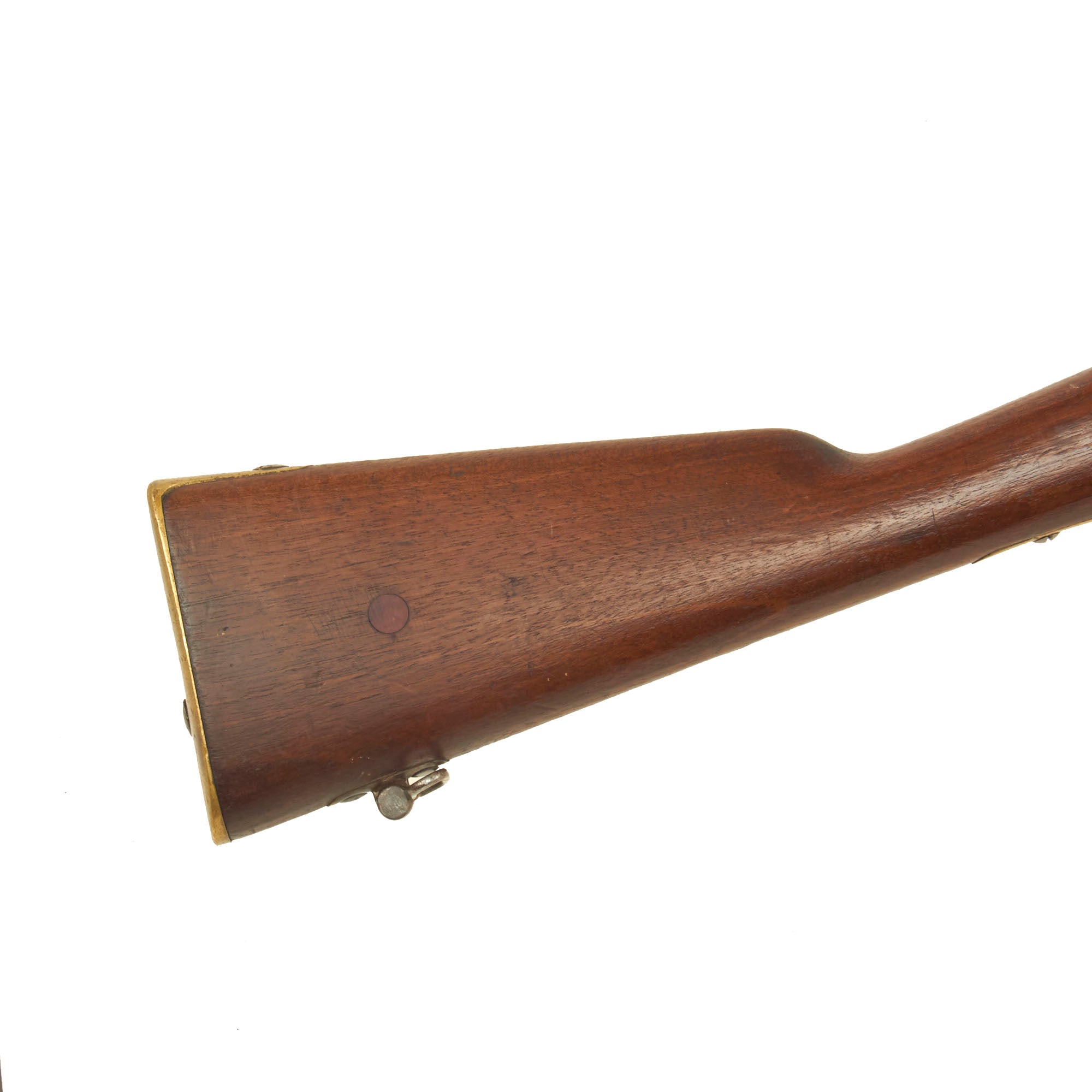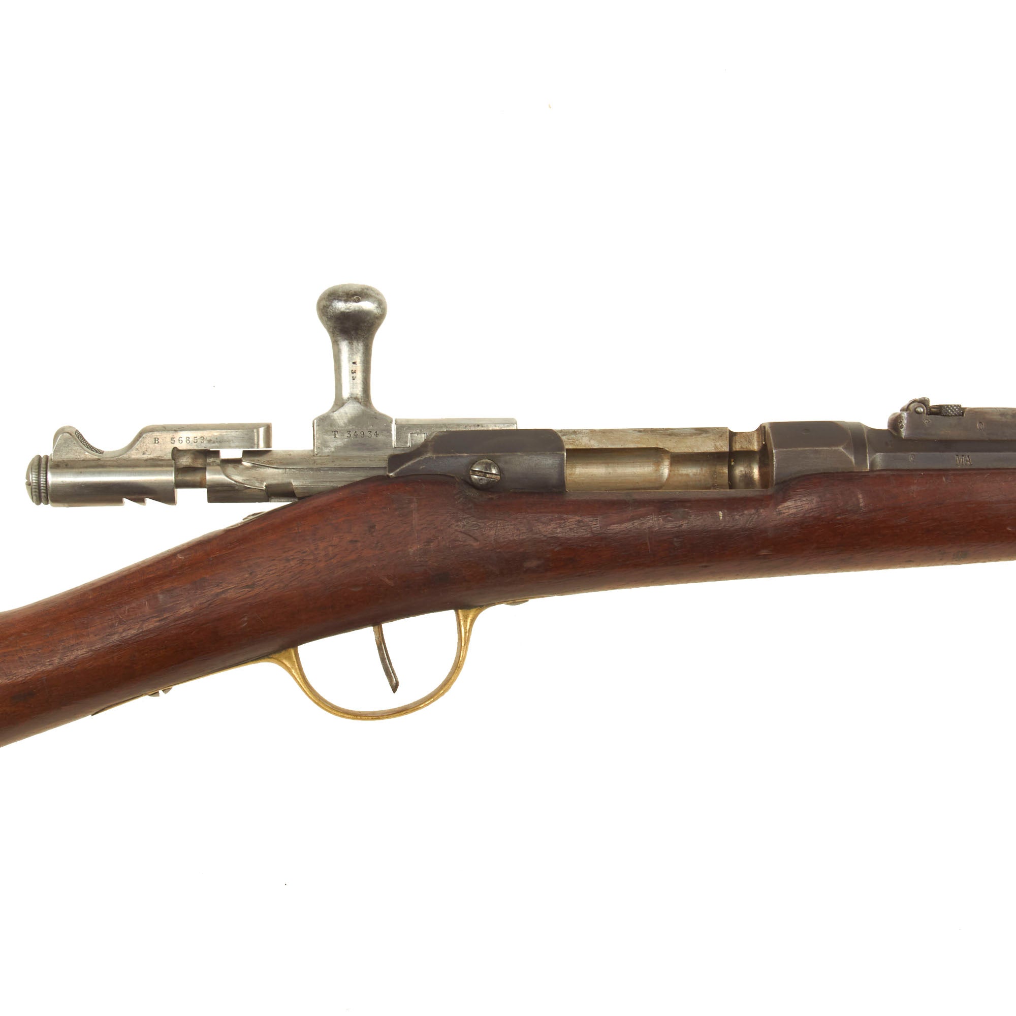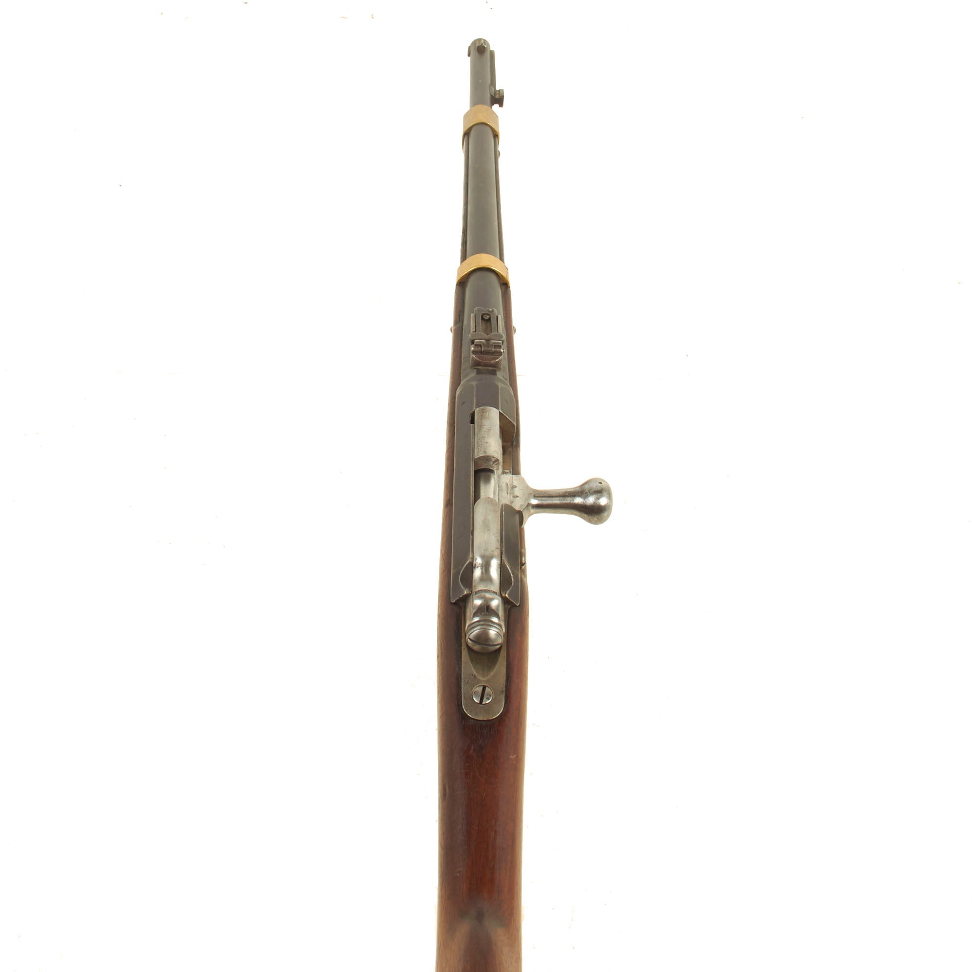 This is a very rare example of the Fusil Gras Modèle 1874 M80 Artillery Carbine, which we have very seldom seen an example of! It has all brass fittings, and comes complete with a full length bayonet. This is one of the shortest variations made, measuring 39 inches in overall length with a barrel juts 19 inches long. It still has standard sling fittings, and does not have the downturned bolt, though it is was replaced at arsenal. The receiver on the rifle is clearly marked MANUFACTURE D'ARMES / Châtellerault over M80, and to the right is the model designation Mle 1874. The rifle has an issue date marking of C. 1876 stamped into the right barrel nocks form, for manufacture at the Imperial Arsenal of Châtellerault in 1876.