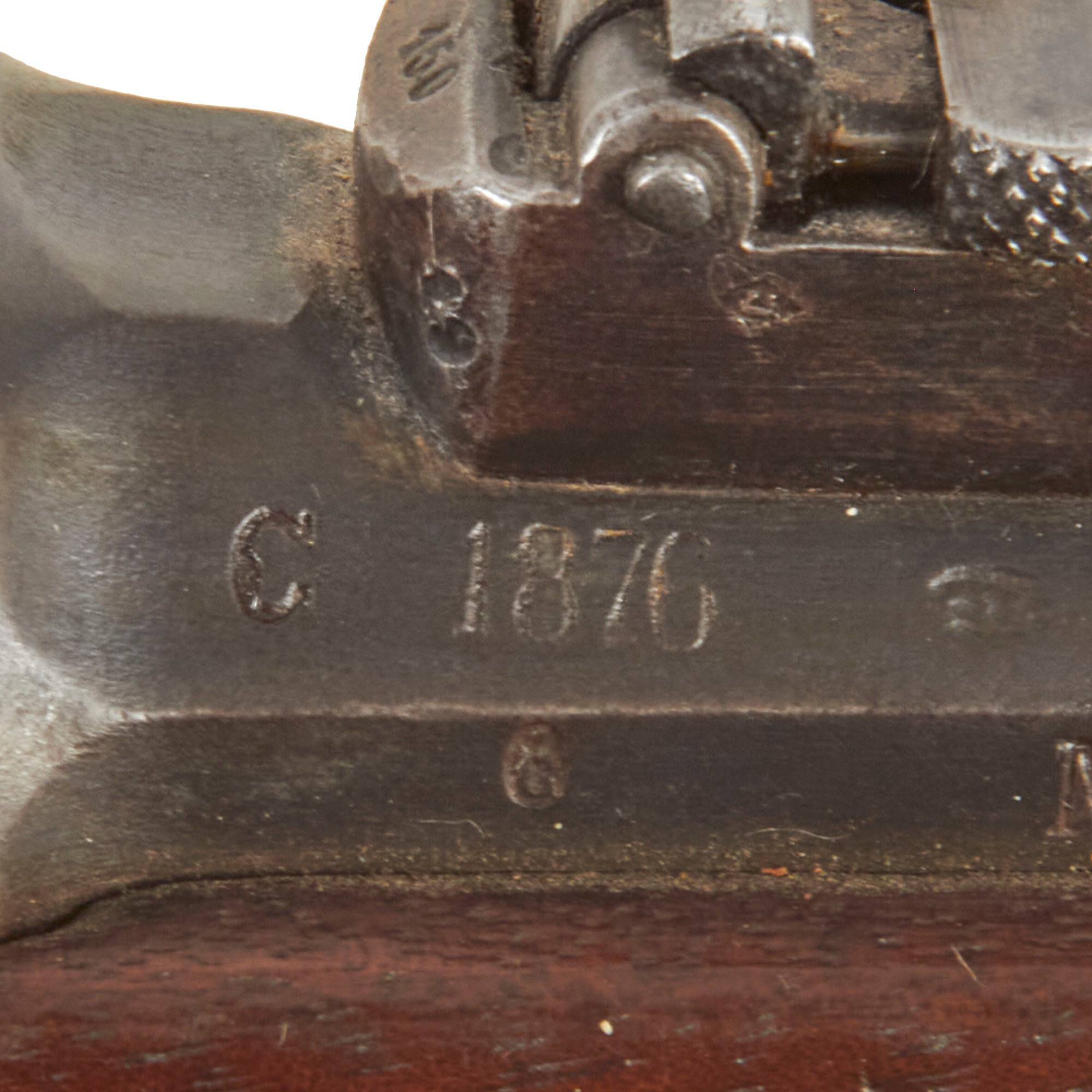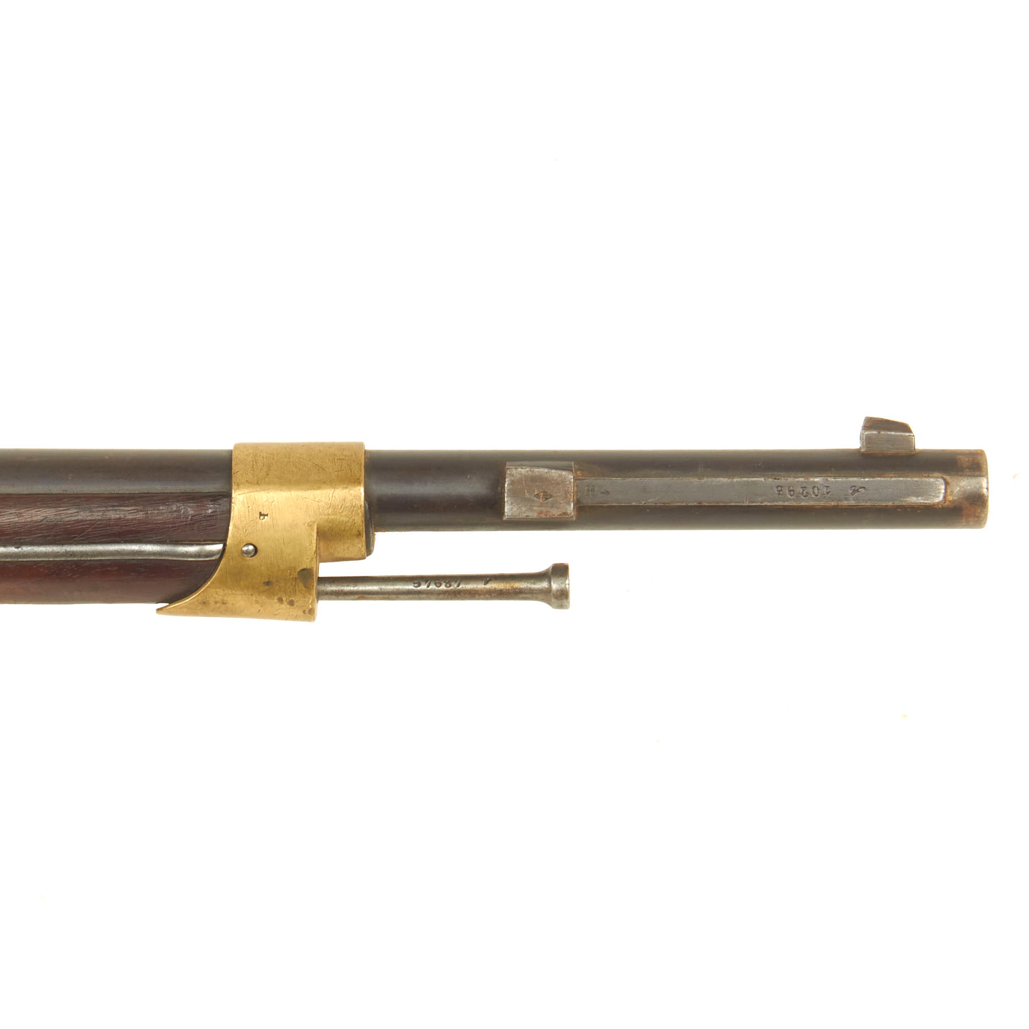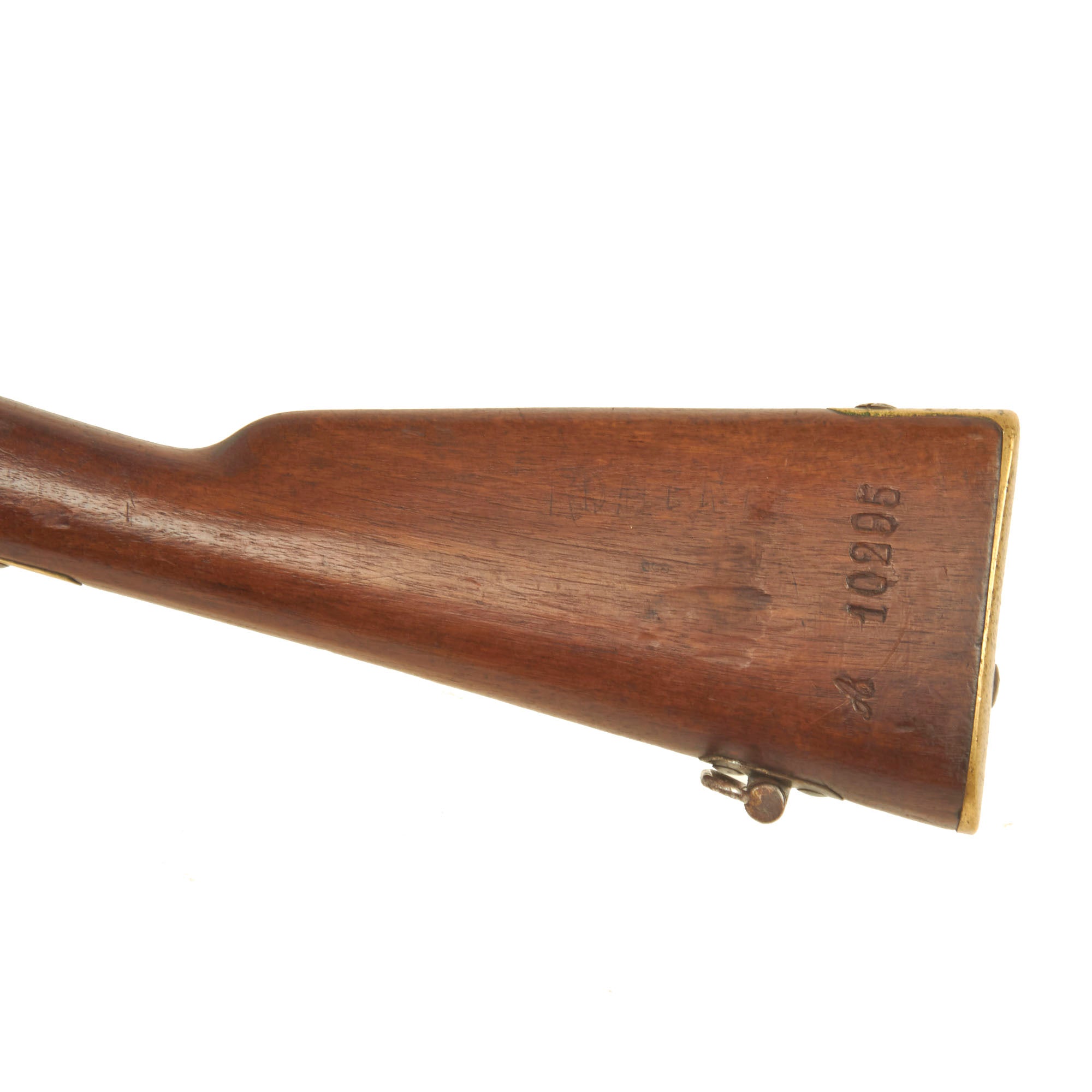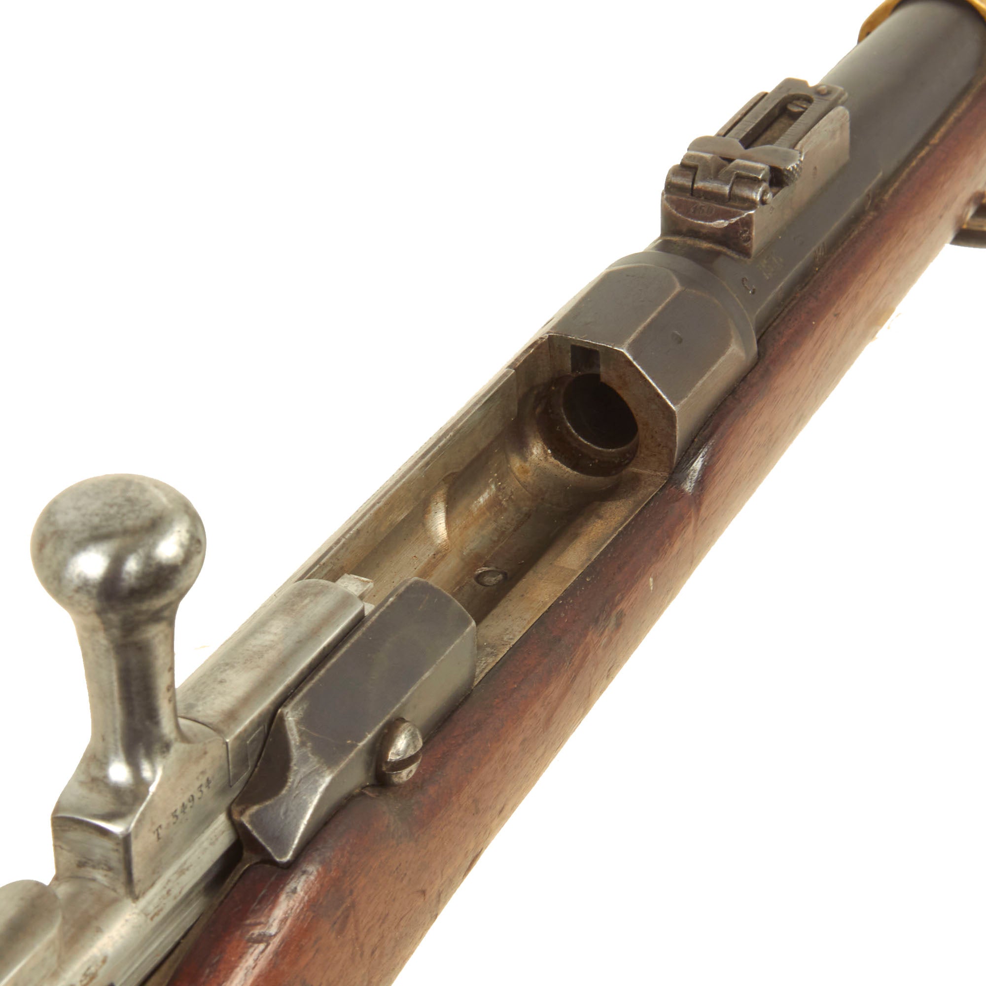 This is a very rare example of the Fusil Gras Modèle 1874 M80 Artillery Carbine, which we have very seldom seen an example of! It has all brass fittings, and comes complete with a full length bayonet. This is one of the shortest variations made, measuring 39 inches in overall length with a barrel juts 19 inches long. It still has standard sling fittings, and does not have the downturned bolt, though it is was replaced at arsenal. The receiver on the rifle is clearly marked MANUFACTURE D'ARMES / Châtellerault over M80, and to the right is the model designation Mle 1874. The rifle has an issue date marking of C. 1876 stamped into the right barrel nocks form, for manufacture at the Imperial Arsenal of Châtellerault in 1876.