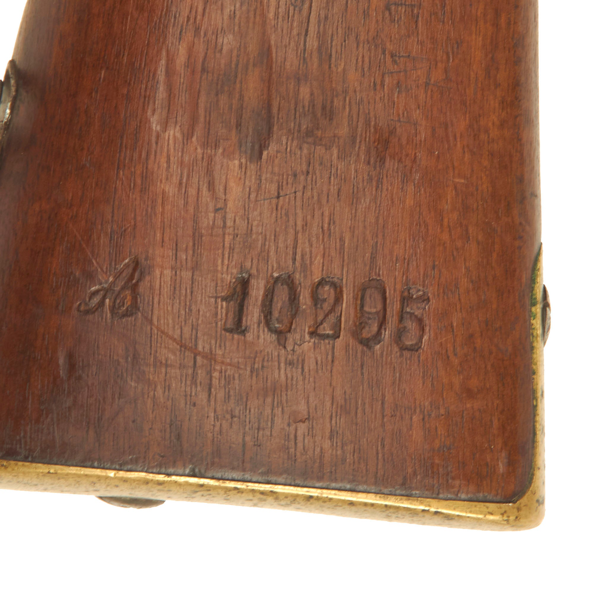 The carbine comes with all original brass mounts and an intact cleaning rod, and the correct proof marks are present on the various components. The stock is in very good condition with a great red brown color, though it appears to have been refinished at arsenal, which has made the markings faint. There are some small chips and gouges, but no major damage. The cartouche on the right side of the butt stock is all but worn away, though the red insert is still present.