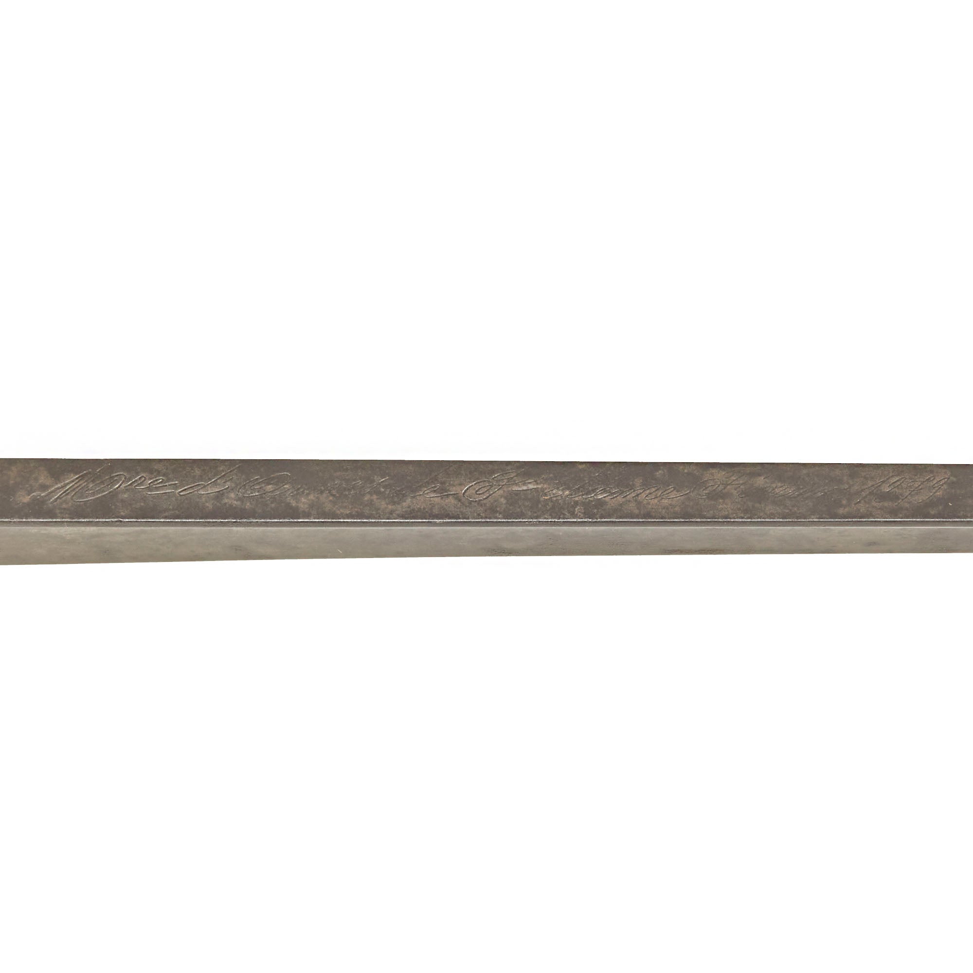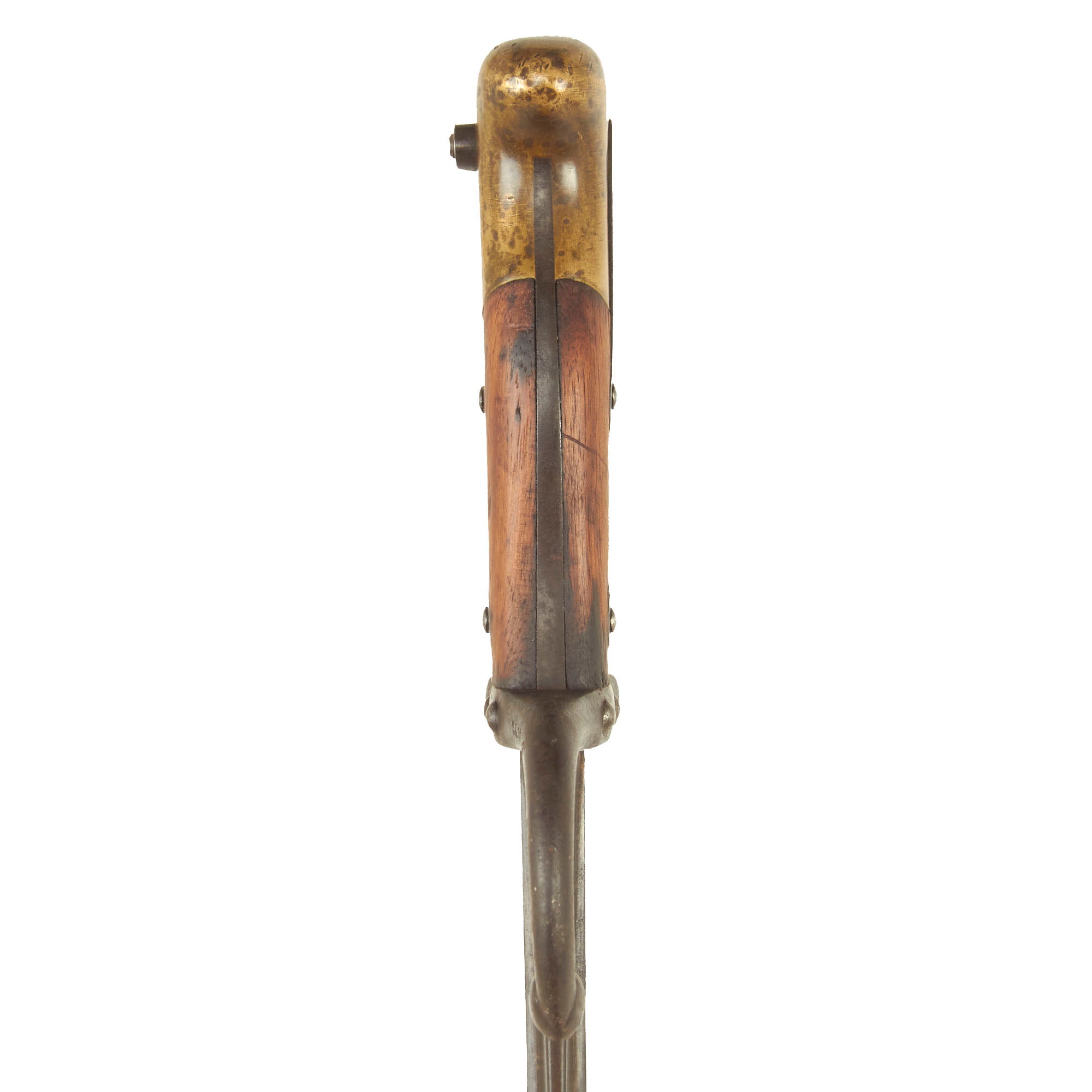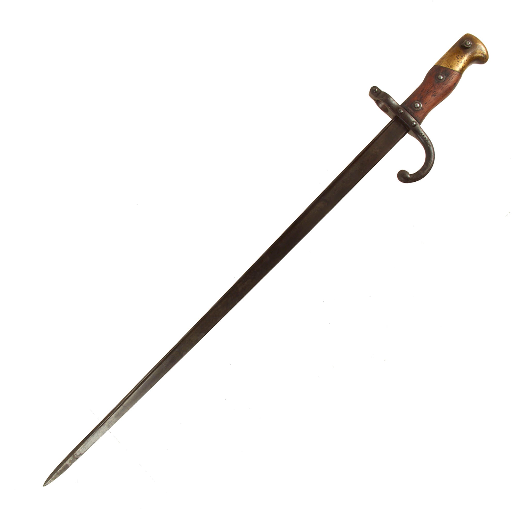 Included with this carbine a correct issue unshortened Triangular-bladed Model 1874 "Gras" sword bayonet, which is in very good condition, showing some light rust on the blade. The T-shaped back of the bayonet is marked M're D'Armes de St. Etiénne Février 1879, indicating manufacture at the St. Etiénne Arsenal in February 1879. The hilt is in good used condition, with nice wood and a good brass pommel, though the steel components show oxidation, and the top of the release button is broken off.