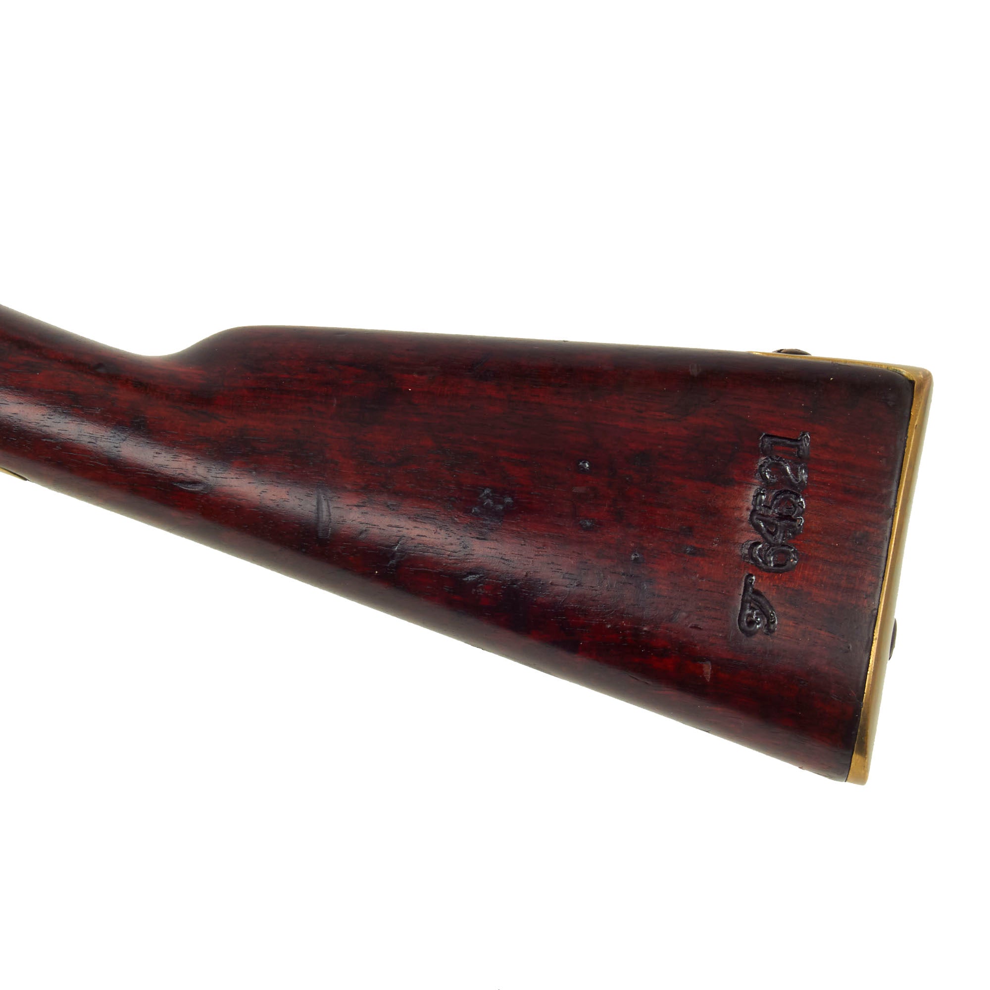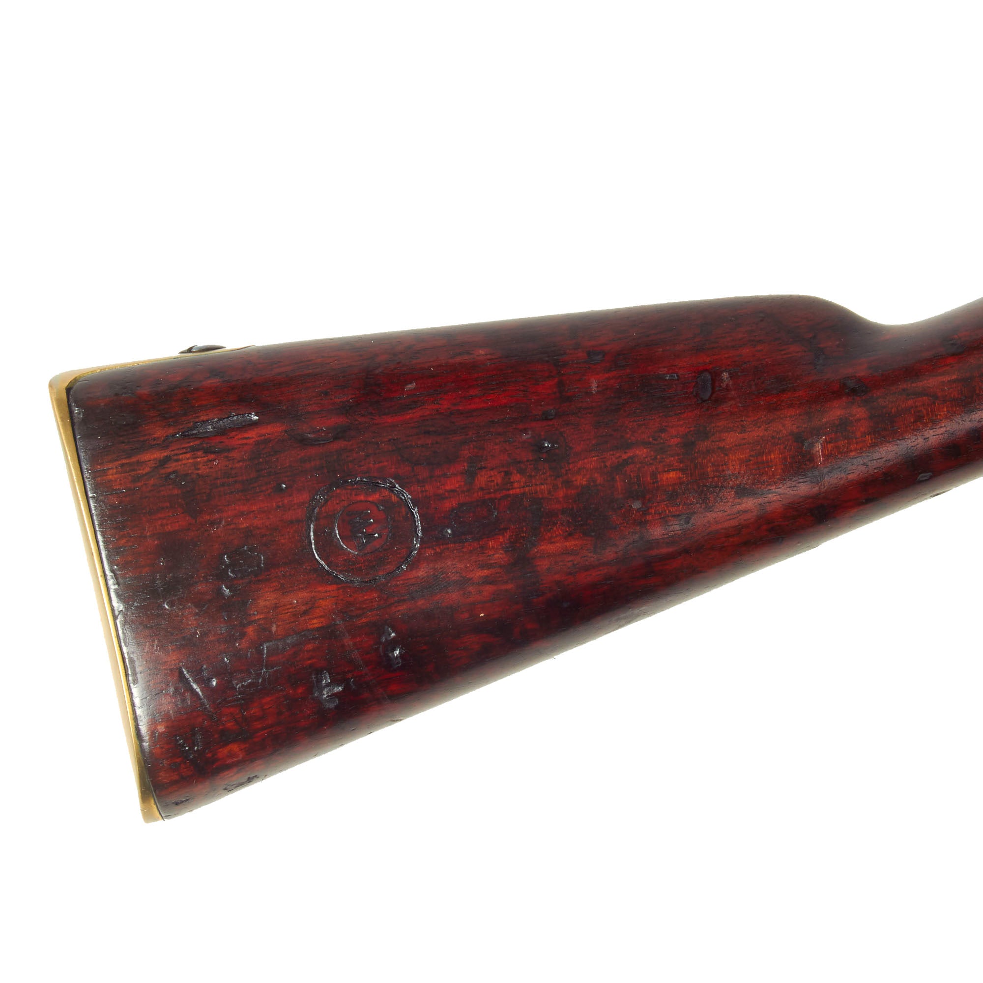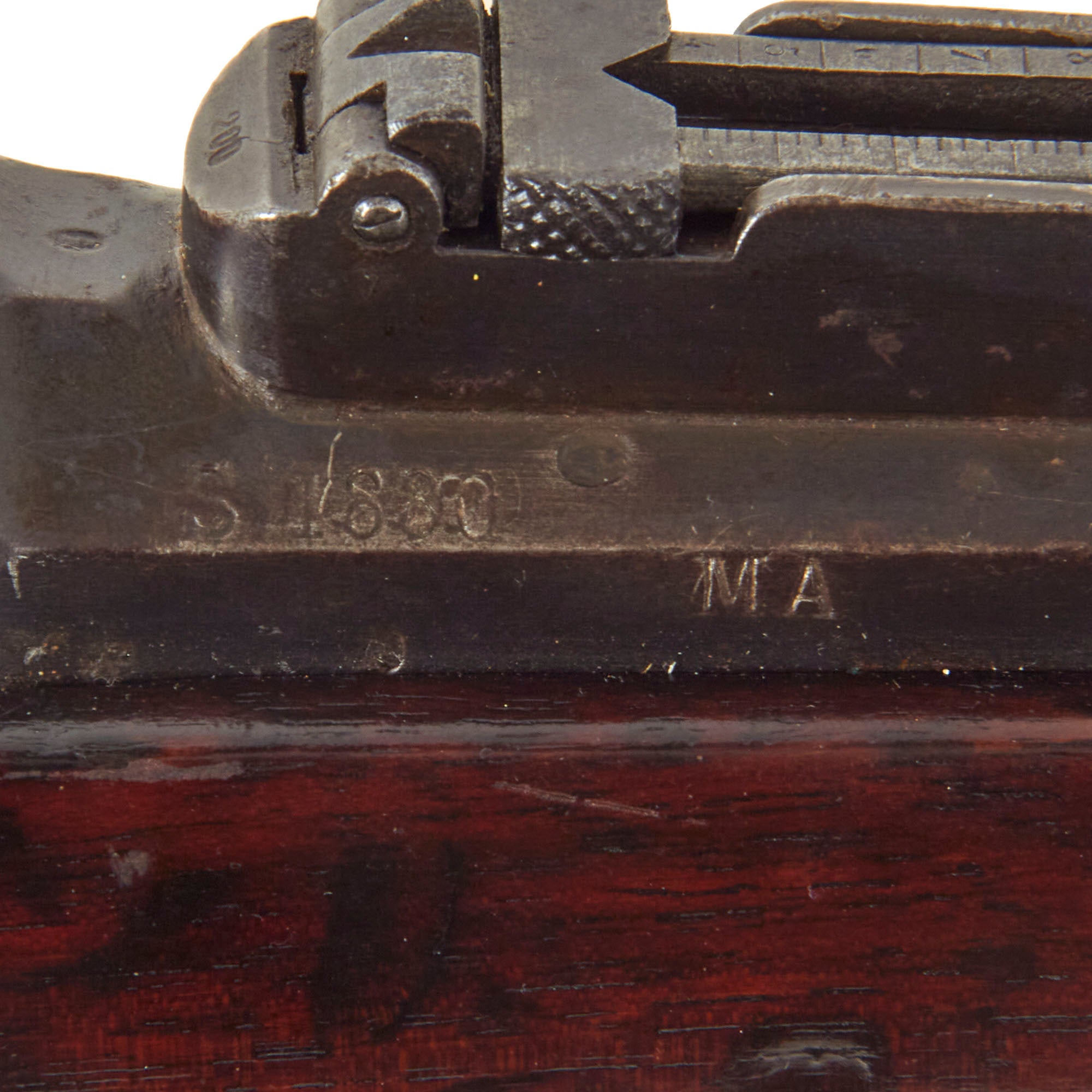 The carbine comes with all original brass mounts and an intact cleaning rod, and the correct proof marks are present on the various components. The stock is in very good condition with a great red brown color, though it appears to have been refinished at arsenal, which has made the markings faint. There are some small chips and gouges, but no major damage. The right side of the butt stock still shows the original arsenal rondel, with the MA marked insert, however not date is legible The rifle is fitted with a very nice sling, though we do not know if it is period.