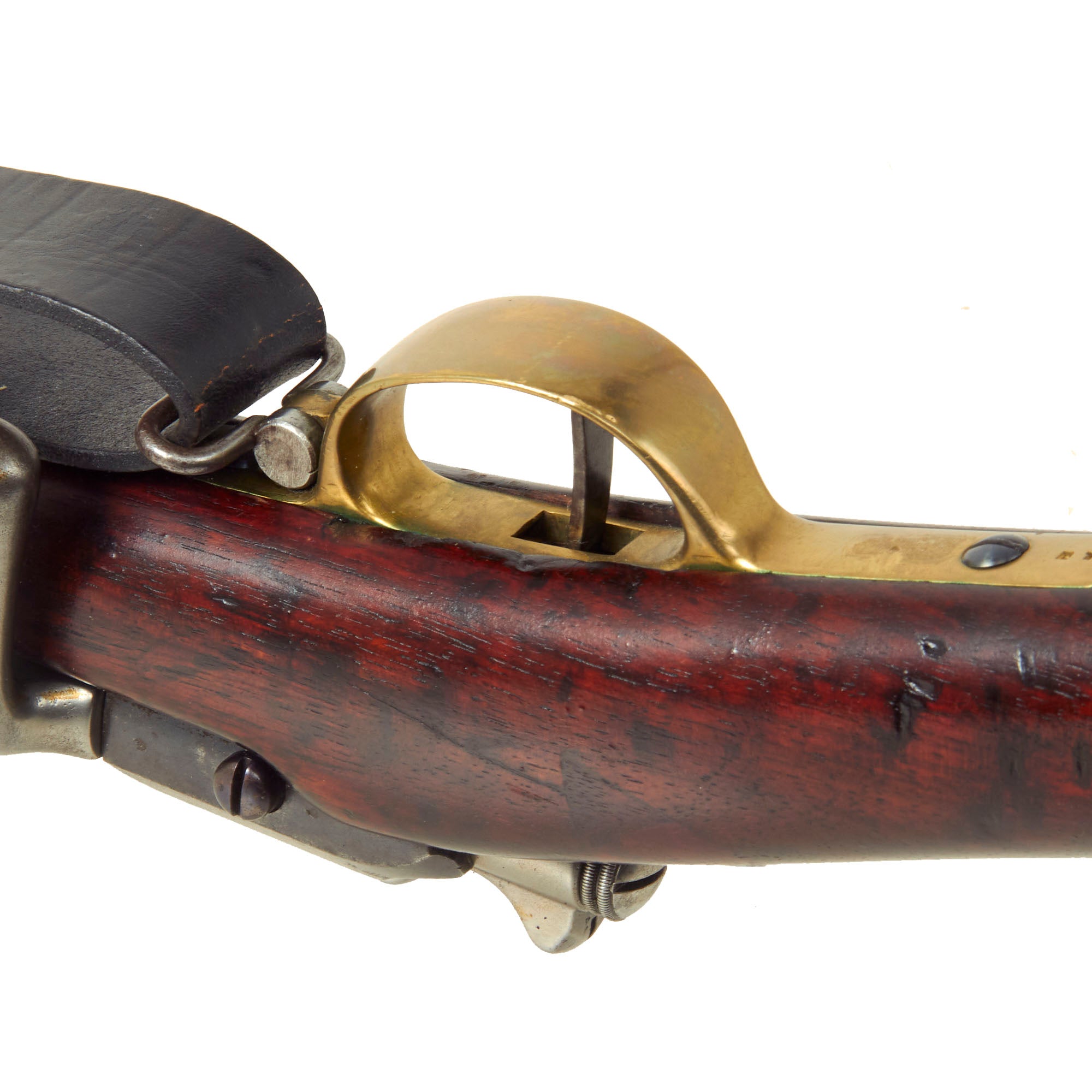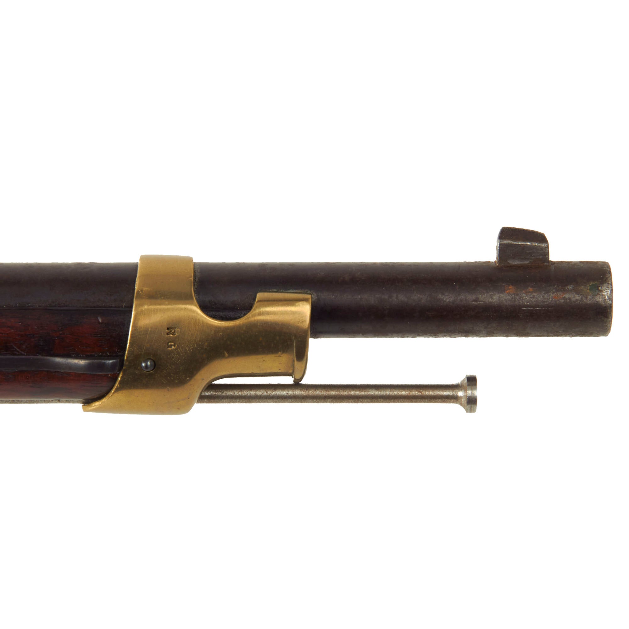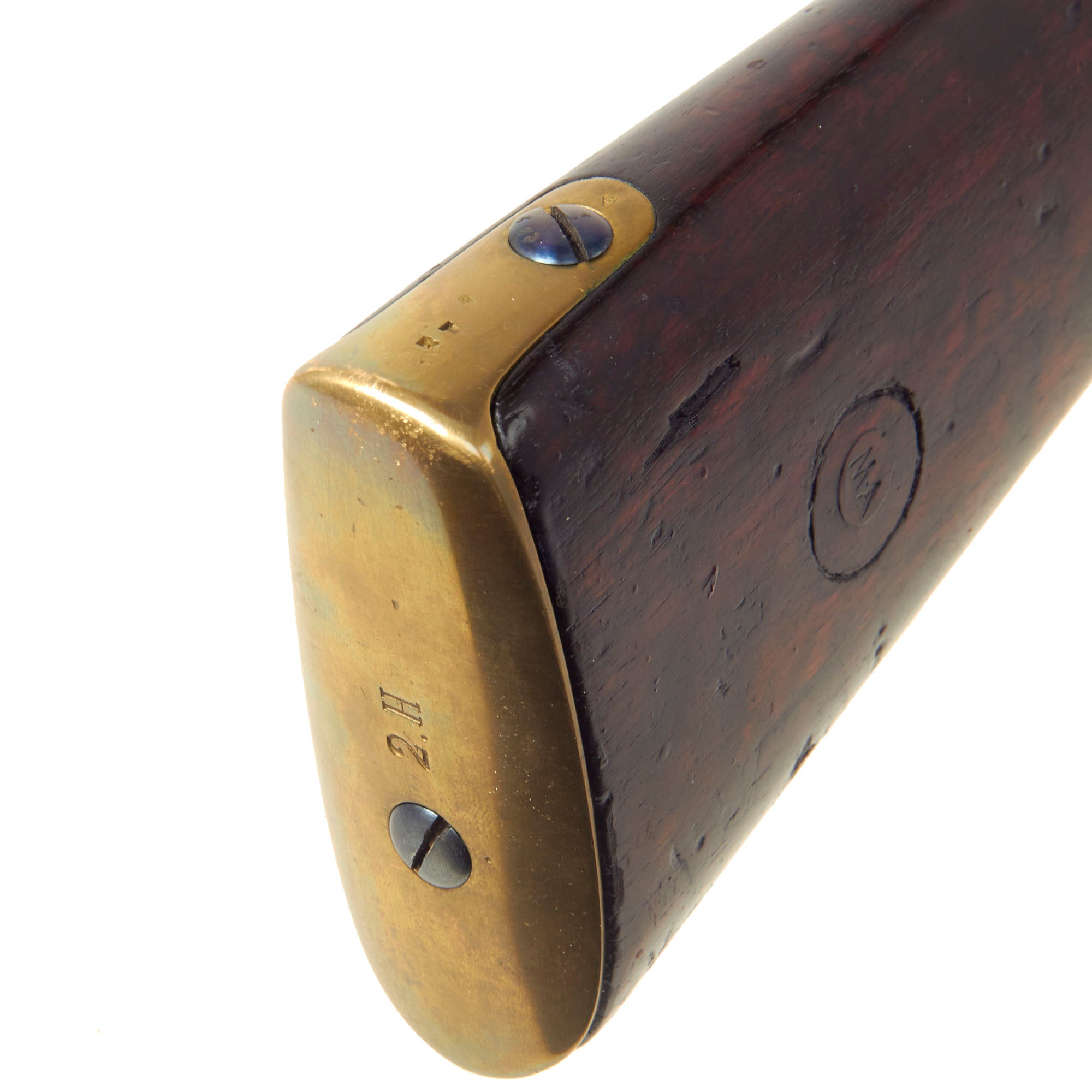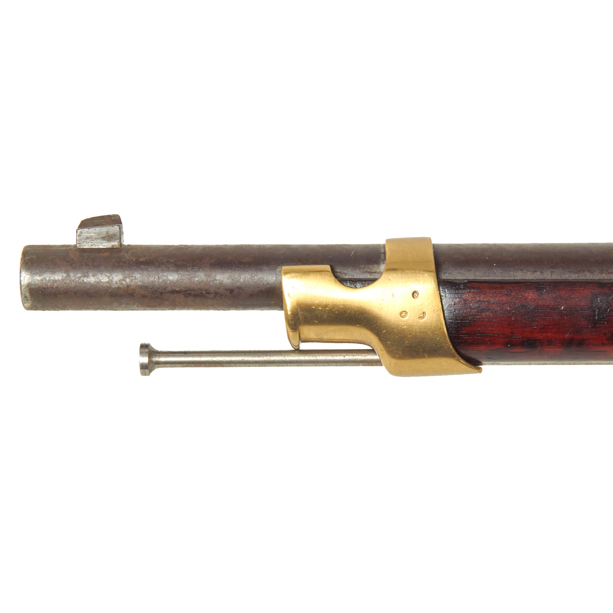 The carbine comes with all original brass mounts and an intact cleaning rod, and the correct proof marks are present on the various components. The stock is in very good condition with a great red brown color, though it appears to have been refinished at arsenal, which has made the markings faint. There are some small chips and gouges, but no major damage. The right side of the butt stock still shows the original arsenal rondel, with the MA marked insert, however not date is legible The rifle is fitted with a very nice sling, though we do not know if it is period.